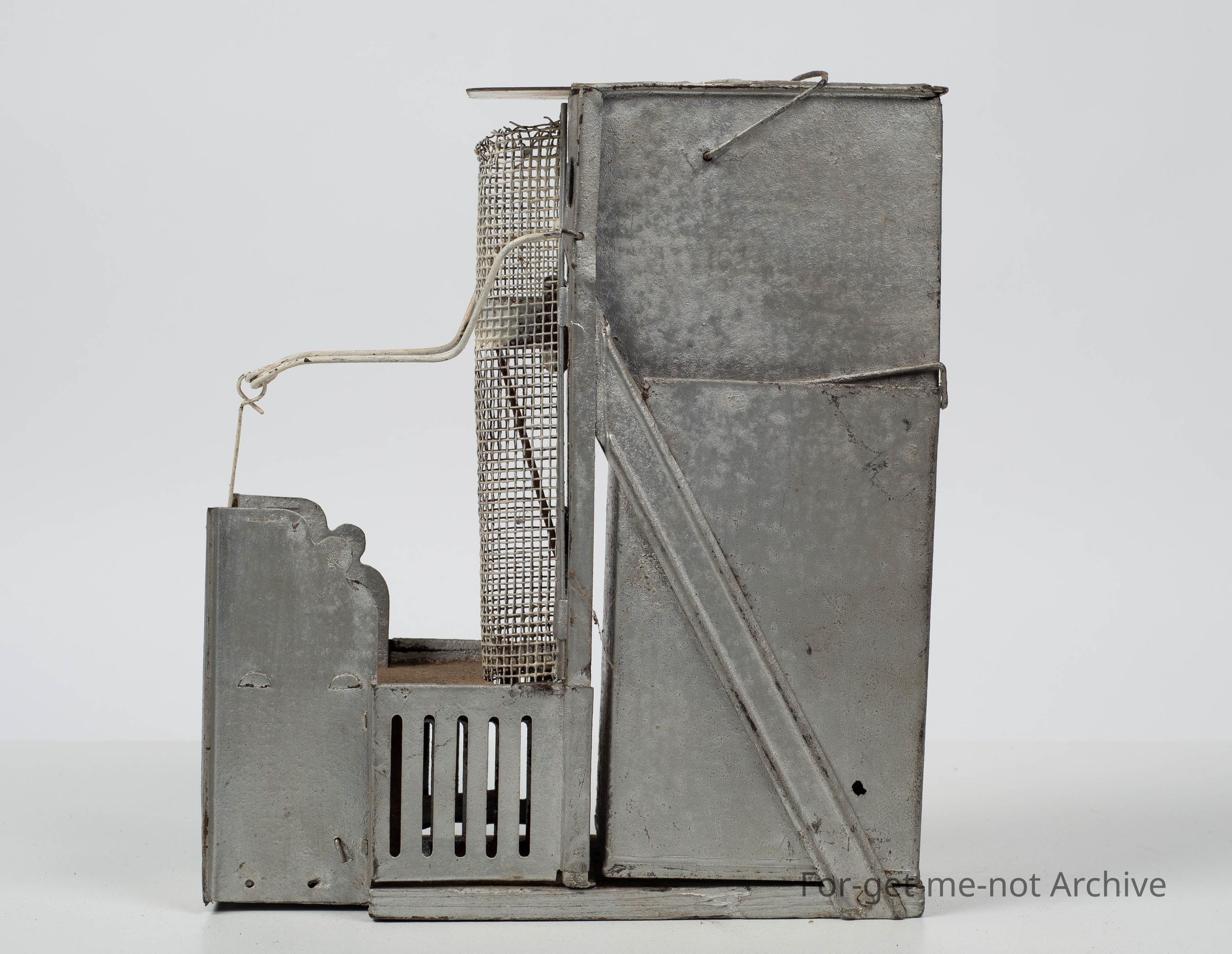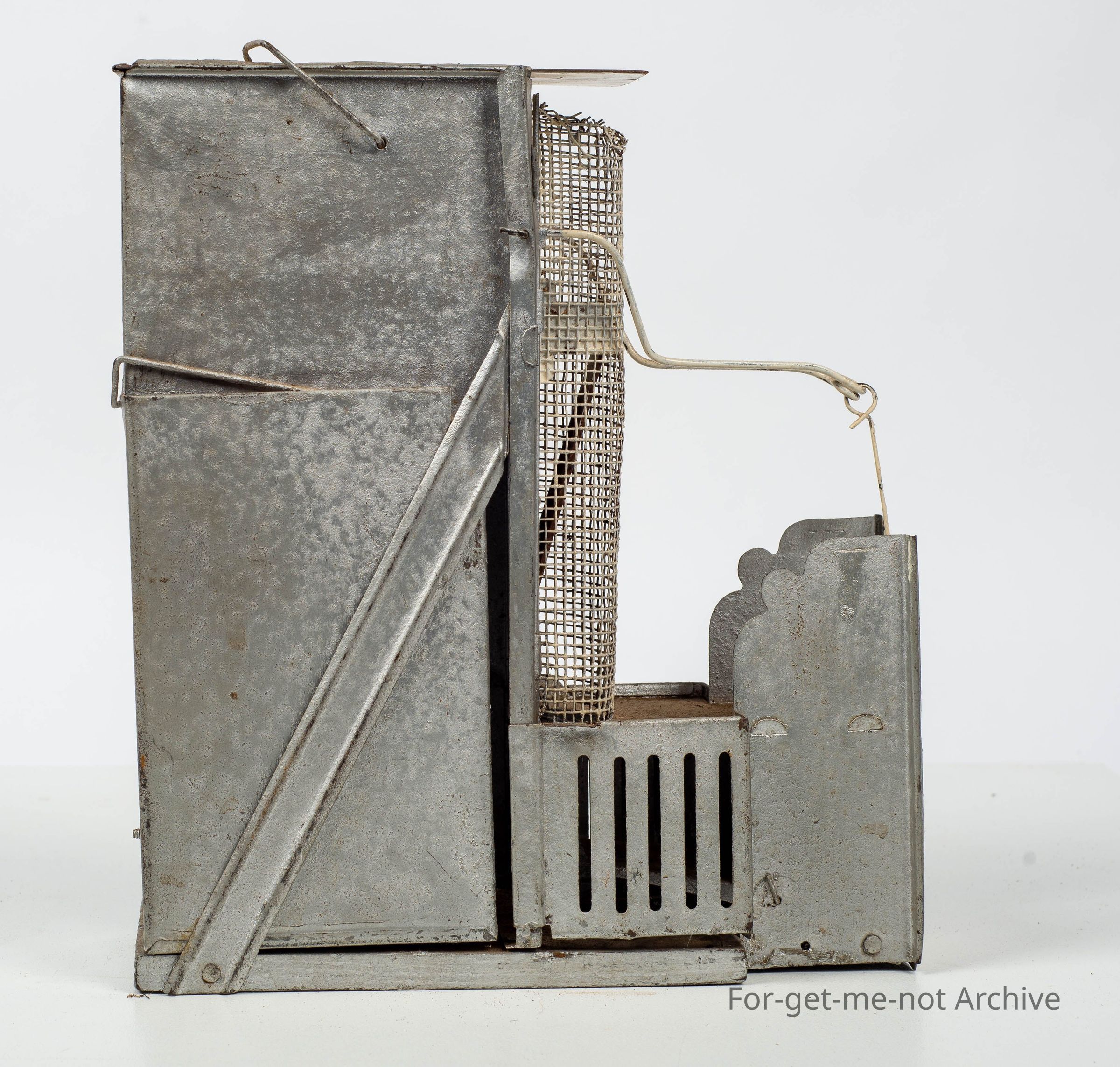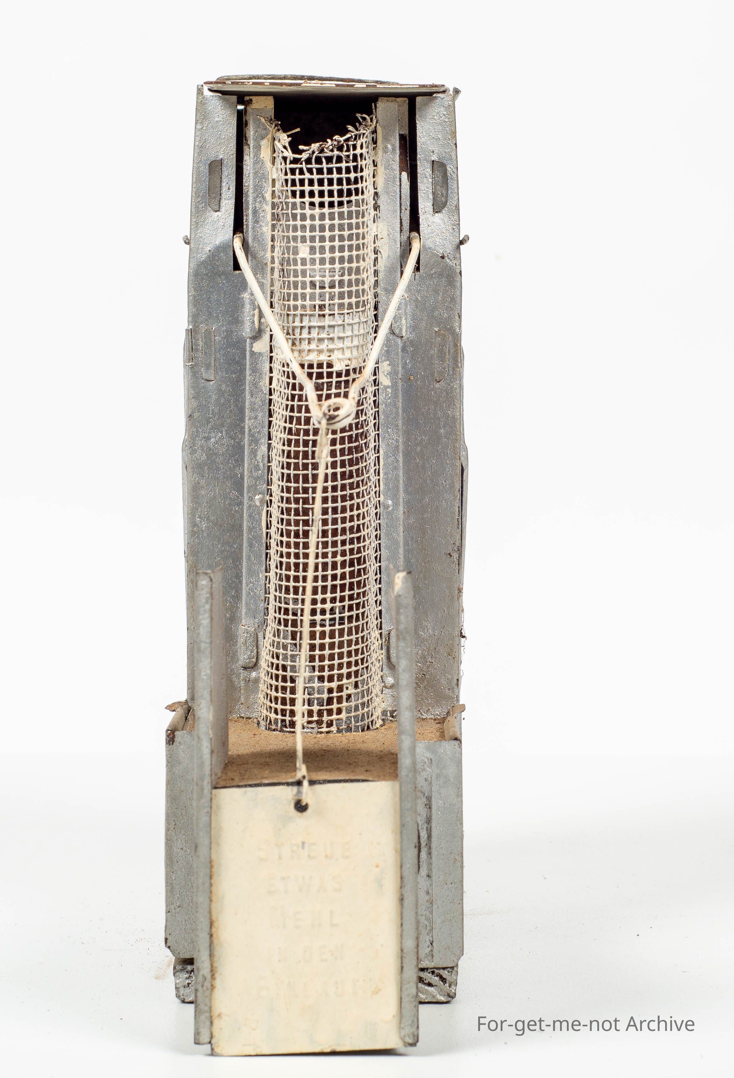 European maker. Designed to trap by mice climbing up into and fall into a water chamber built into the trap.