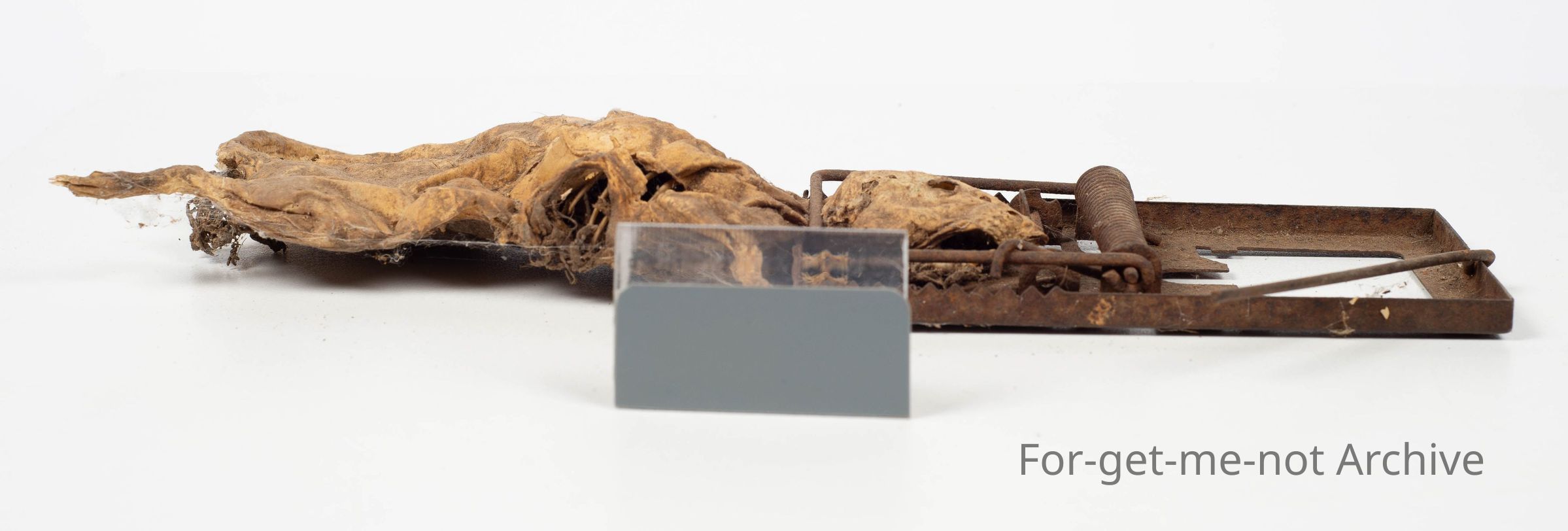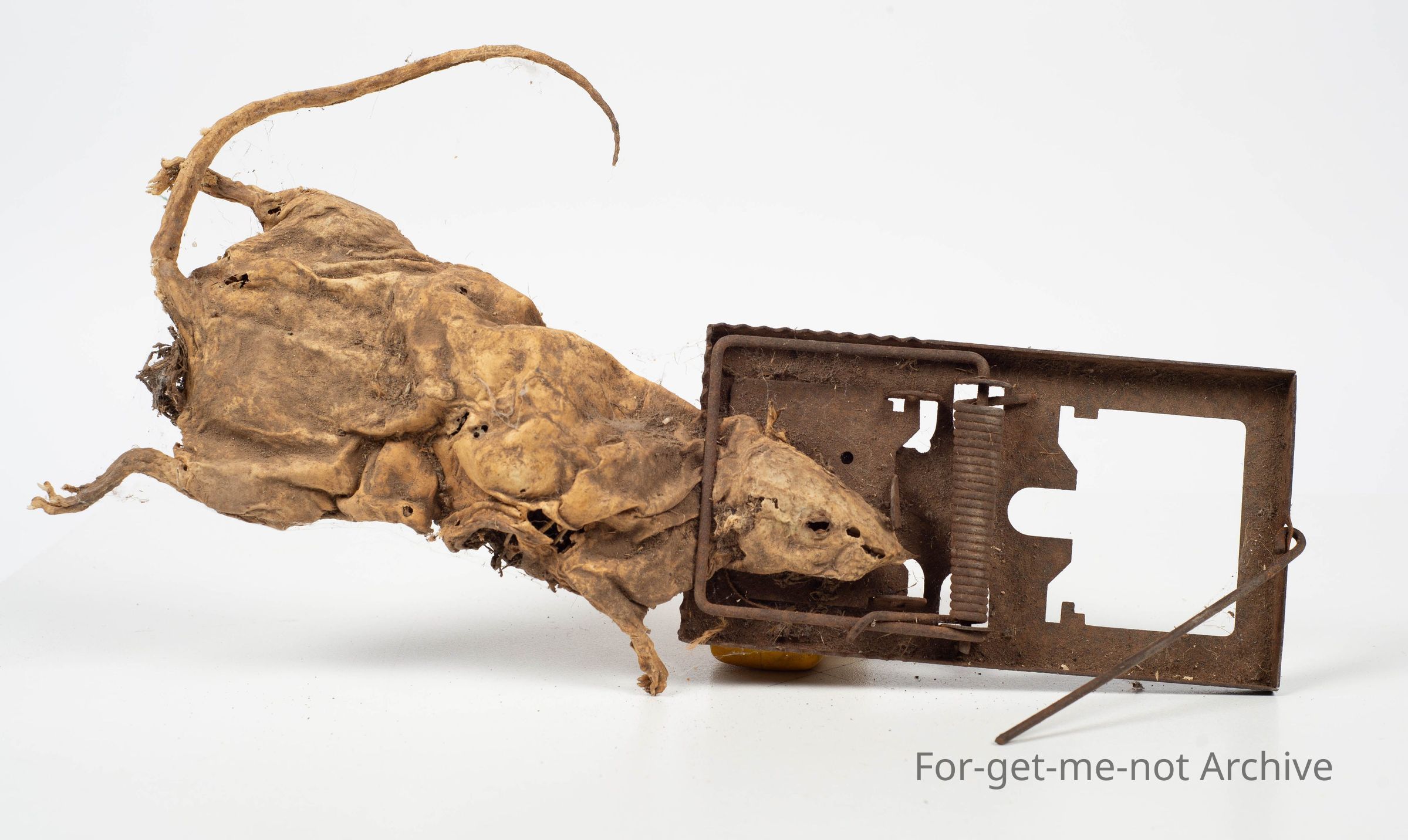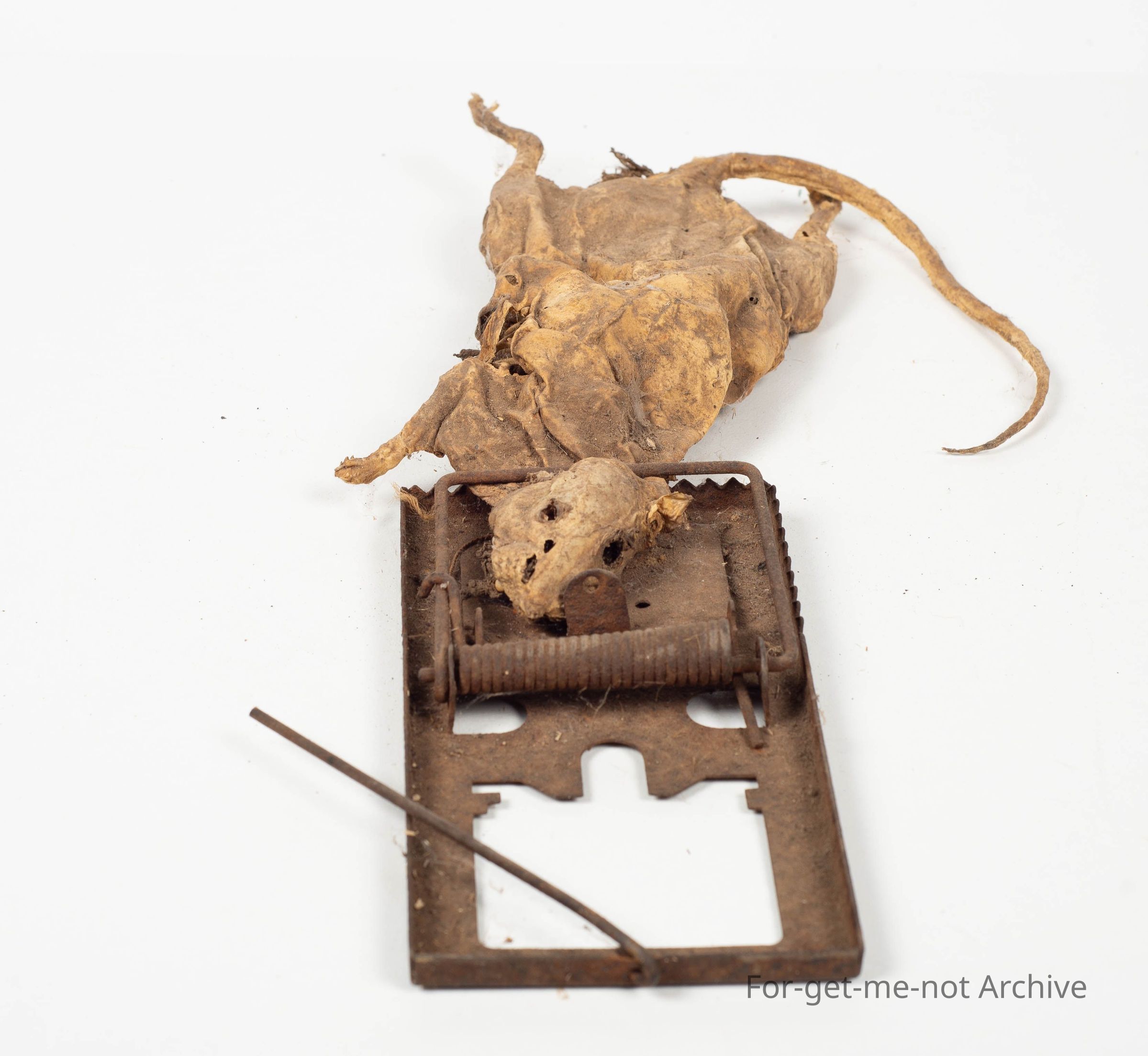 Tin mouse trap with mummified dead rat attached.