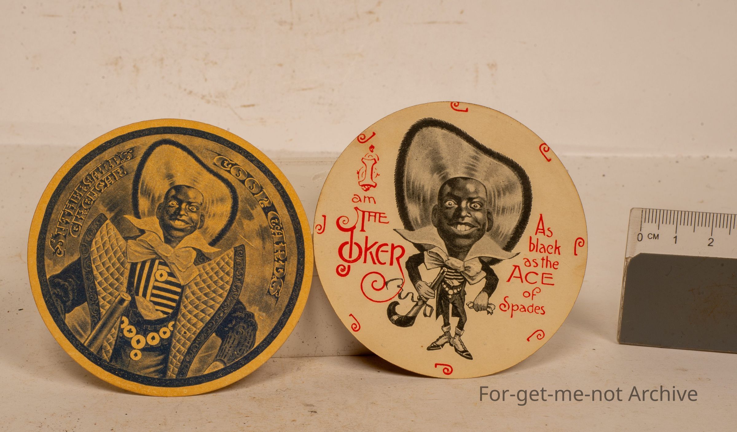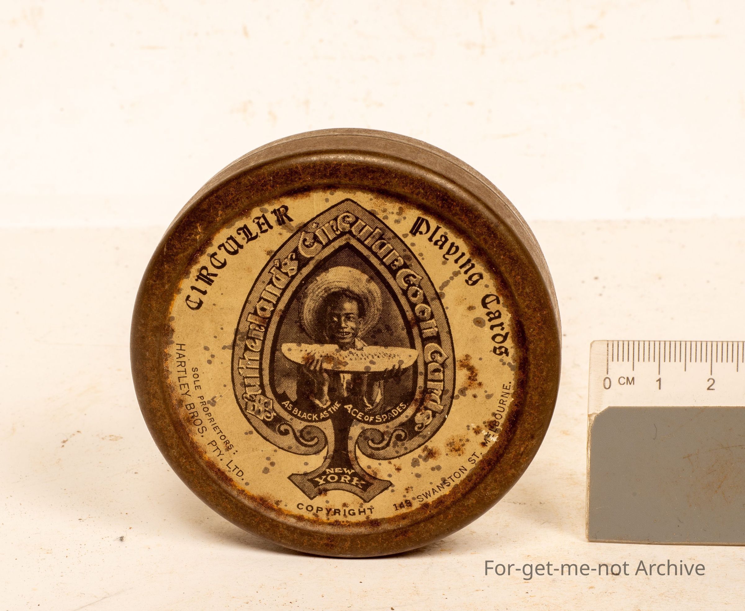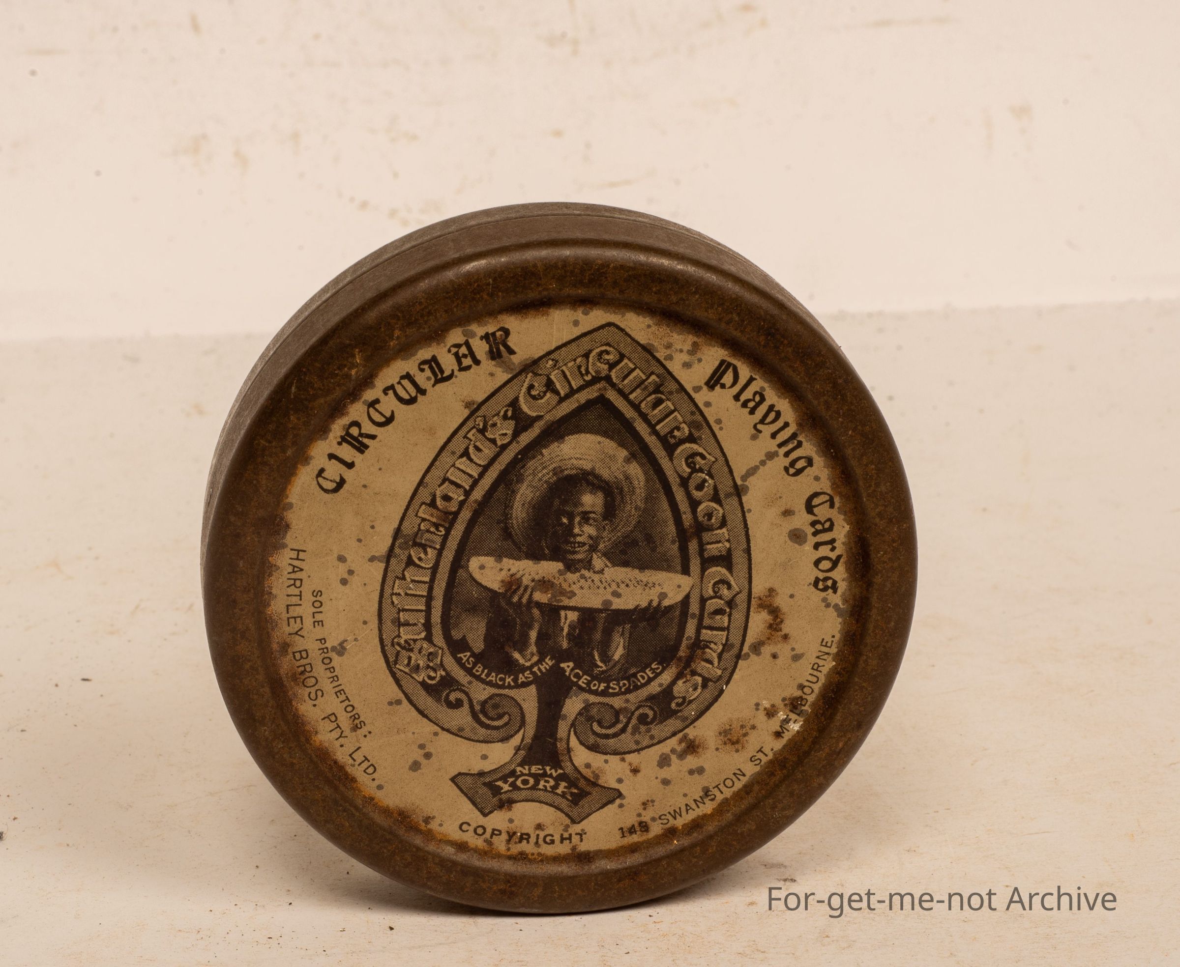 This is a tin of circular playing cards, put out by Hartley Brothers, Swanson Street, Melbourne, with the image of an American Negro eating a watermelon on the front. It is believed that this is a complete set of the cards in this tin. Quite a rare piece, particularly with the cards,Collection