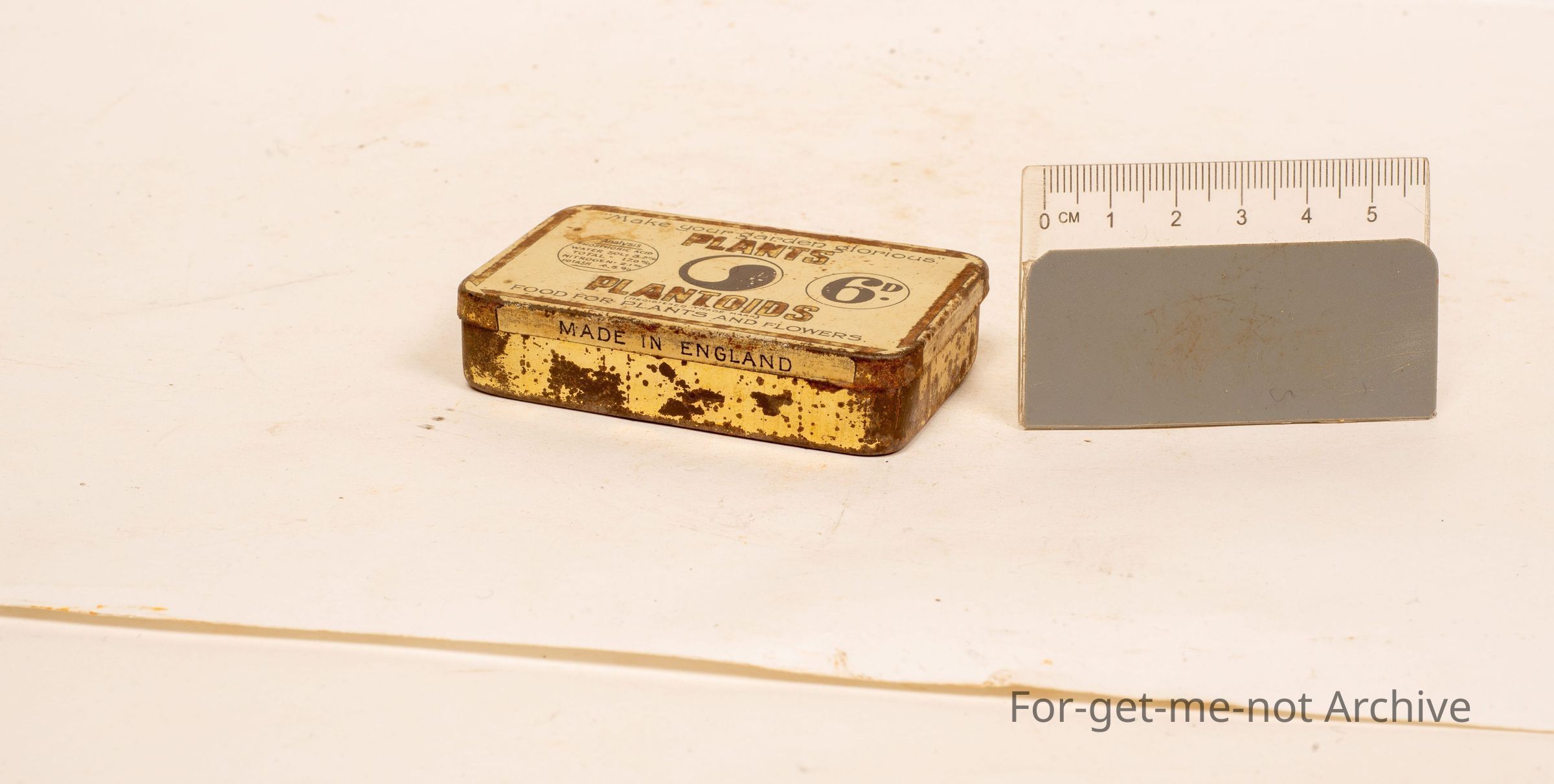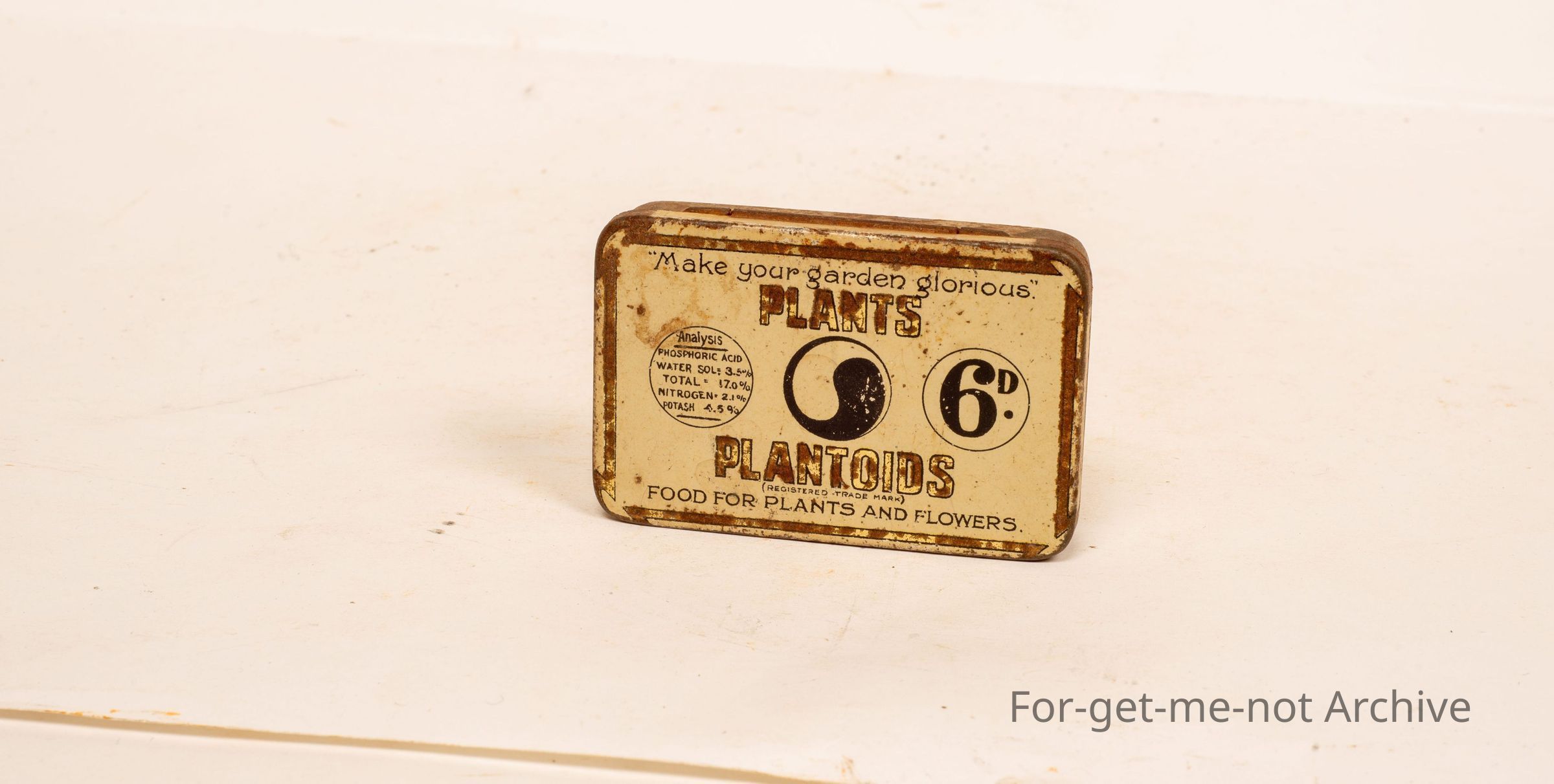 Is a tin. Make your garden glorious. This is for, plants Plantoids food for plants and flowers. Not a very common 10. 6 pence it cost when it was new. It has the analysis of phosphorus, water, nitrogen, potash.Collection