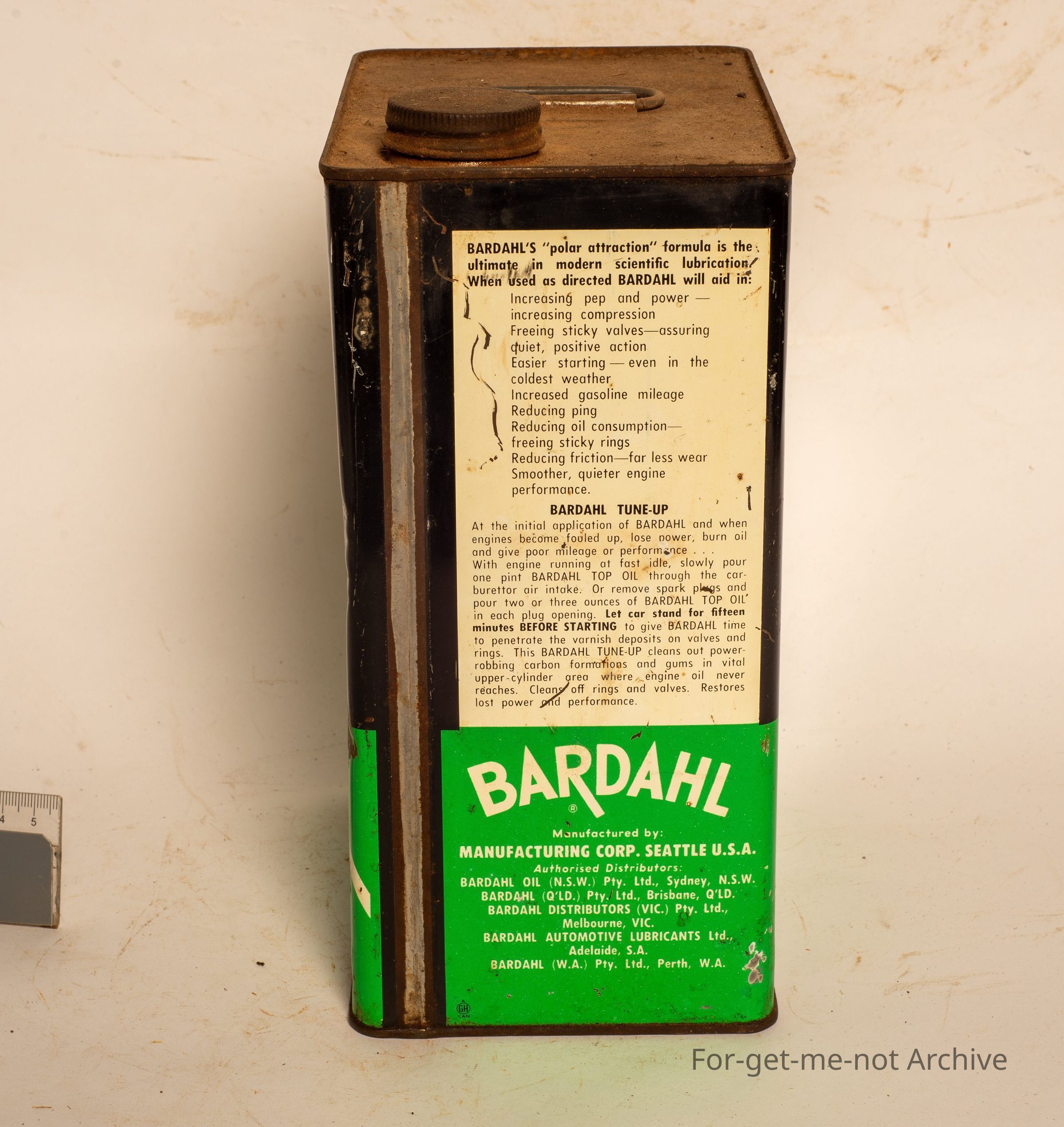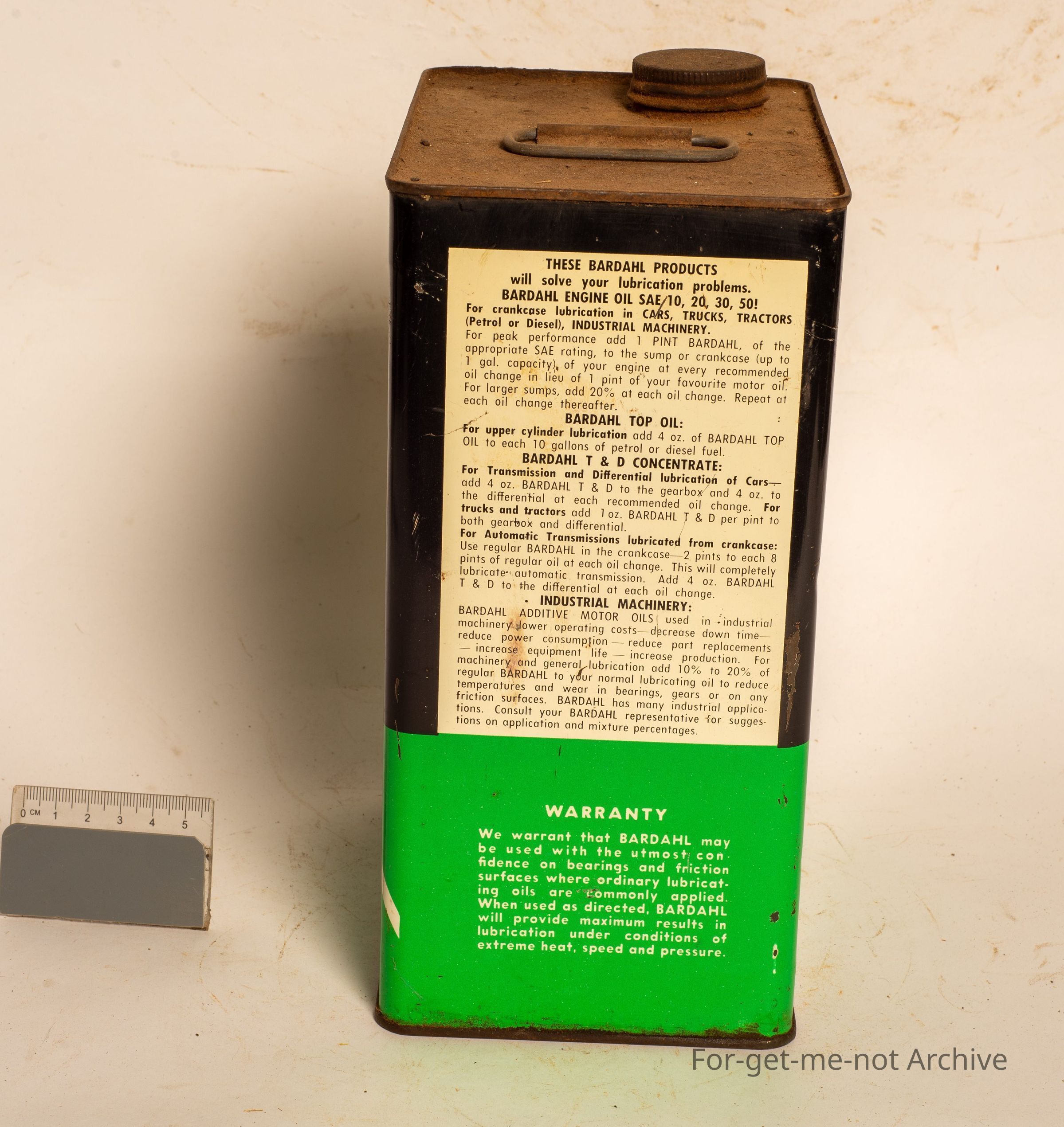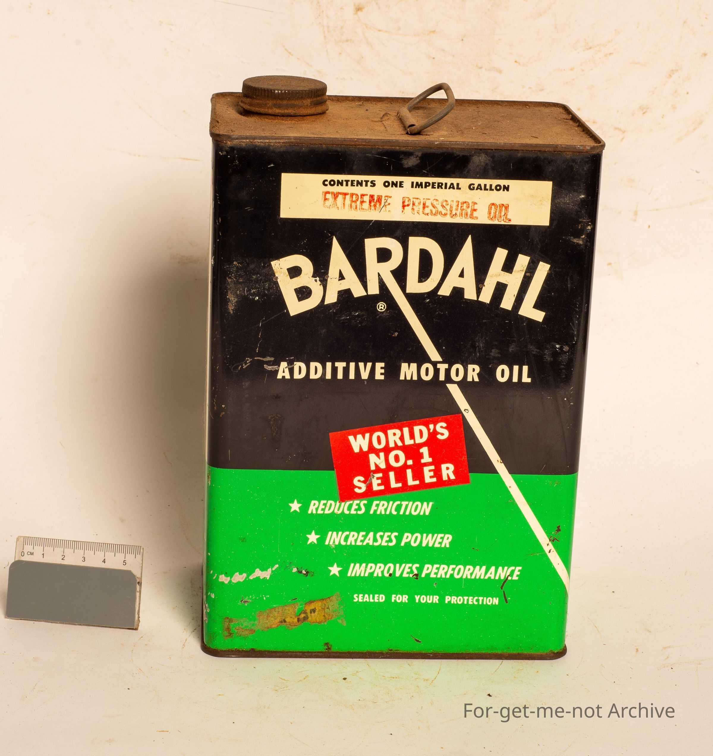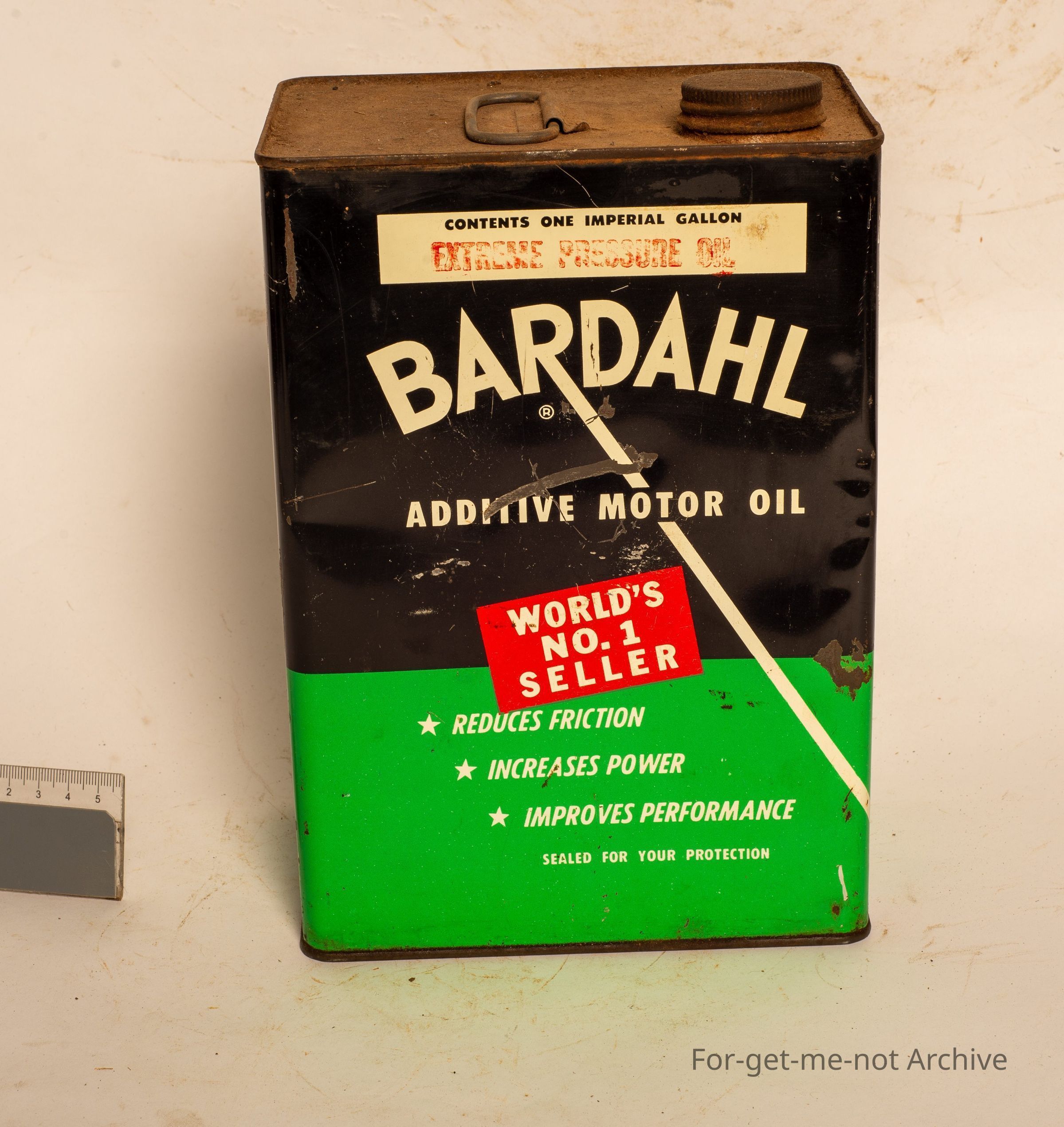 This is a tin of 1 imperial gallon extreme pressure oil from Bardahl, additive motor oil, world's number 1 seller. In pretty good condition. It's probably not a common tin.