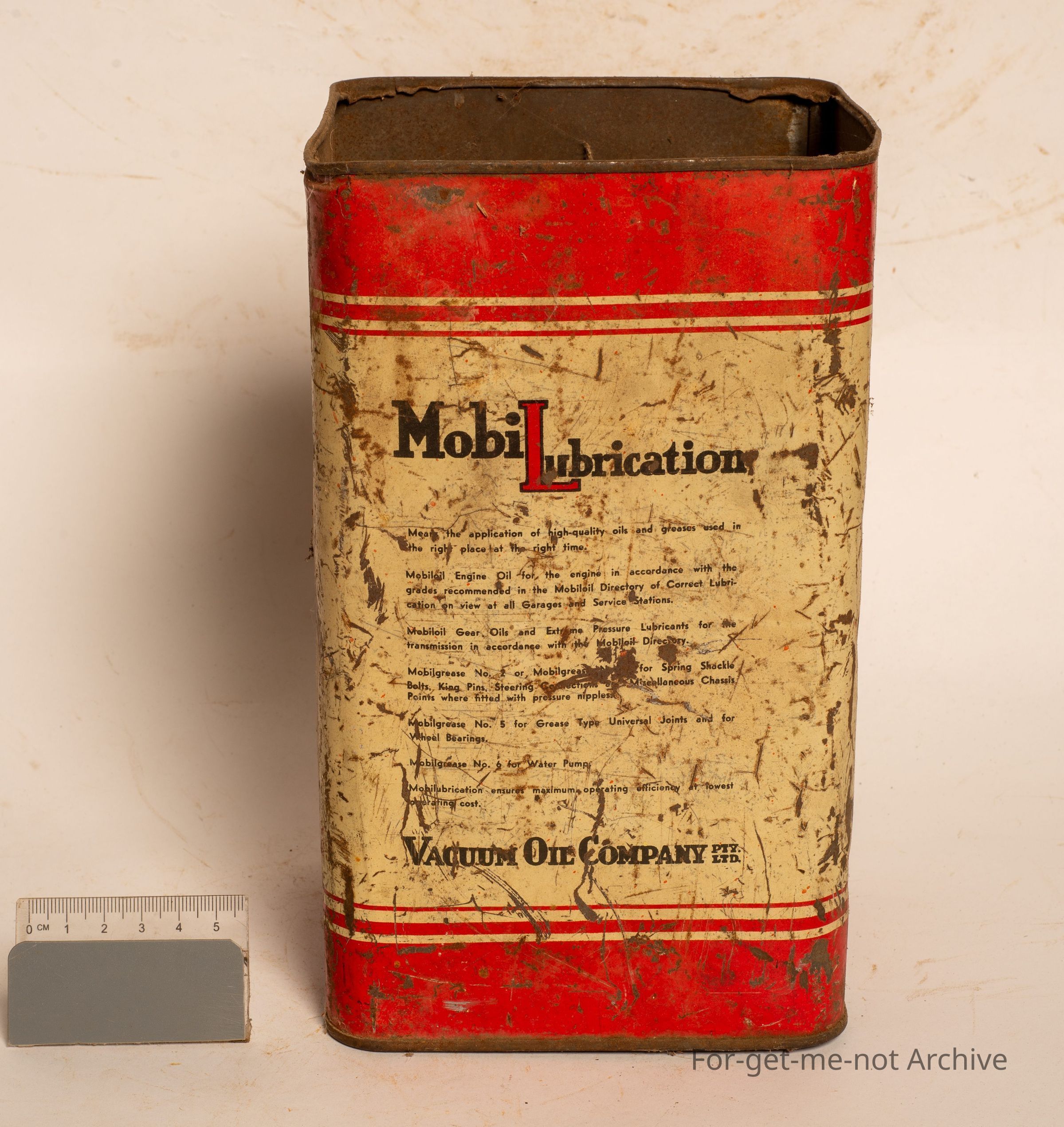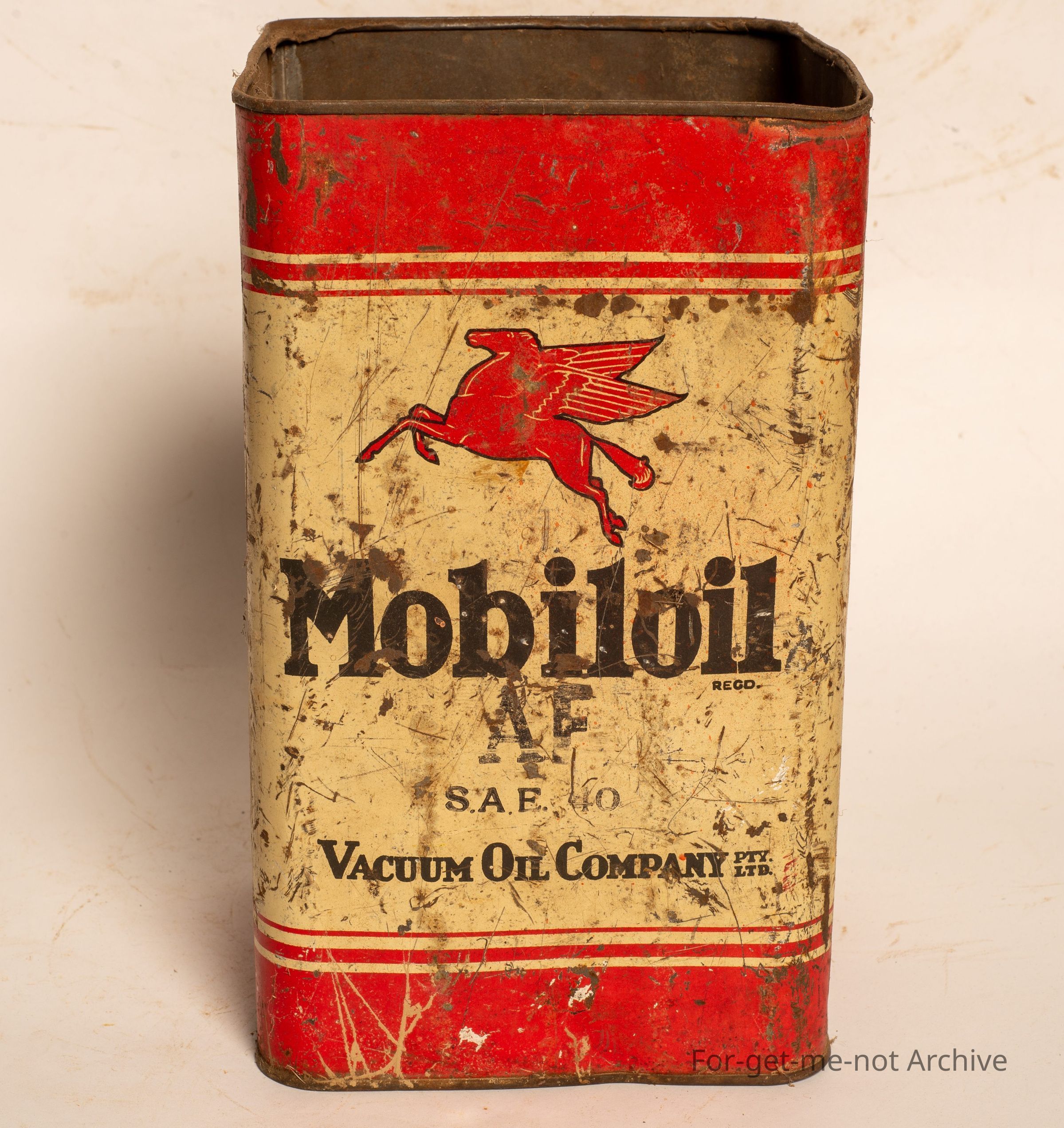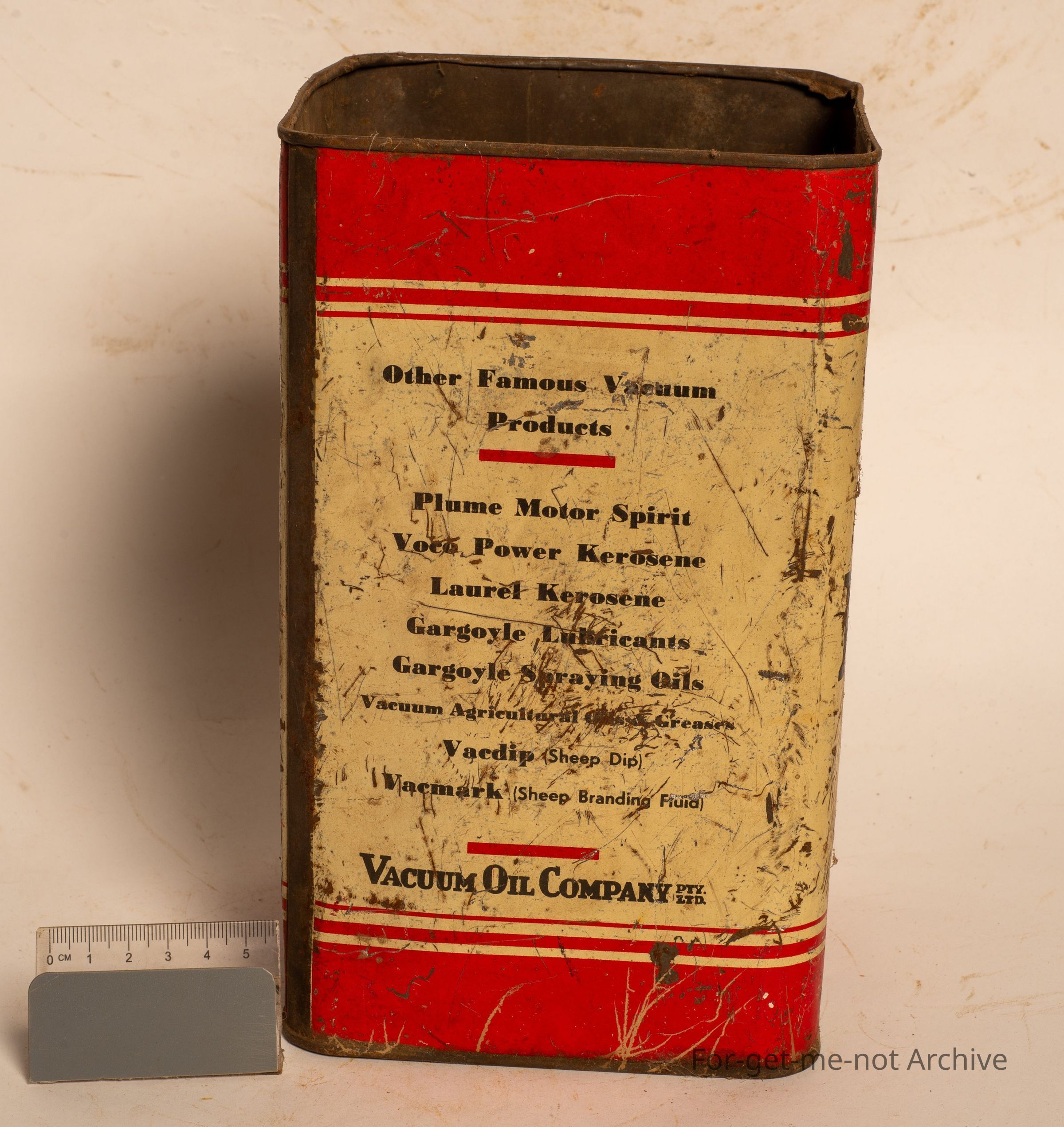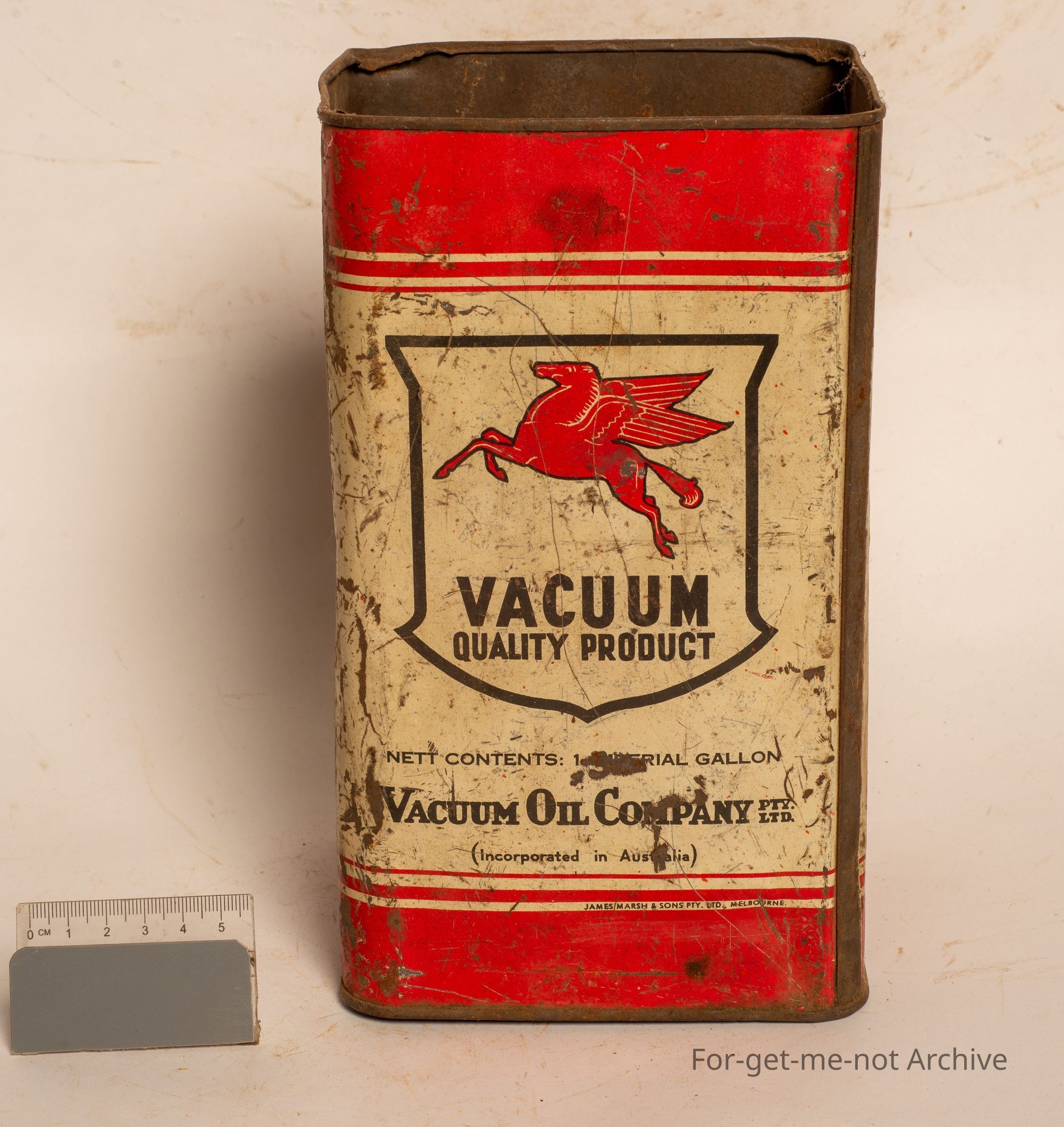 This is a 1 imperial gallon tin of vacuum from Vacuum Oil Company Incorporated in Australia. The tin's made by James Marsh and Sons Melbourne. This is for the collectible tin. Reasonable condition. Image of Pegasus with Mobil Oil Vacuum Oil Company.Collection