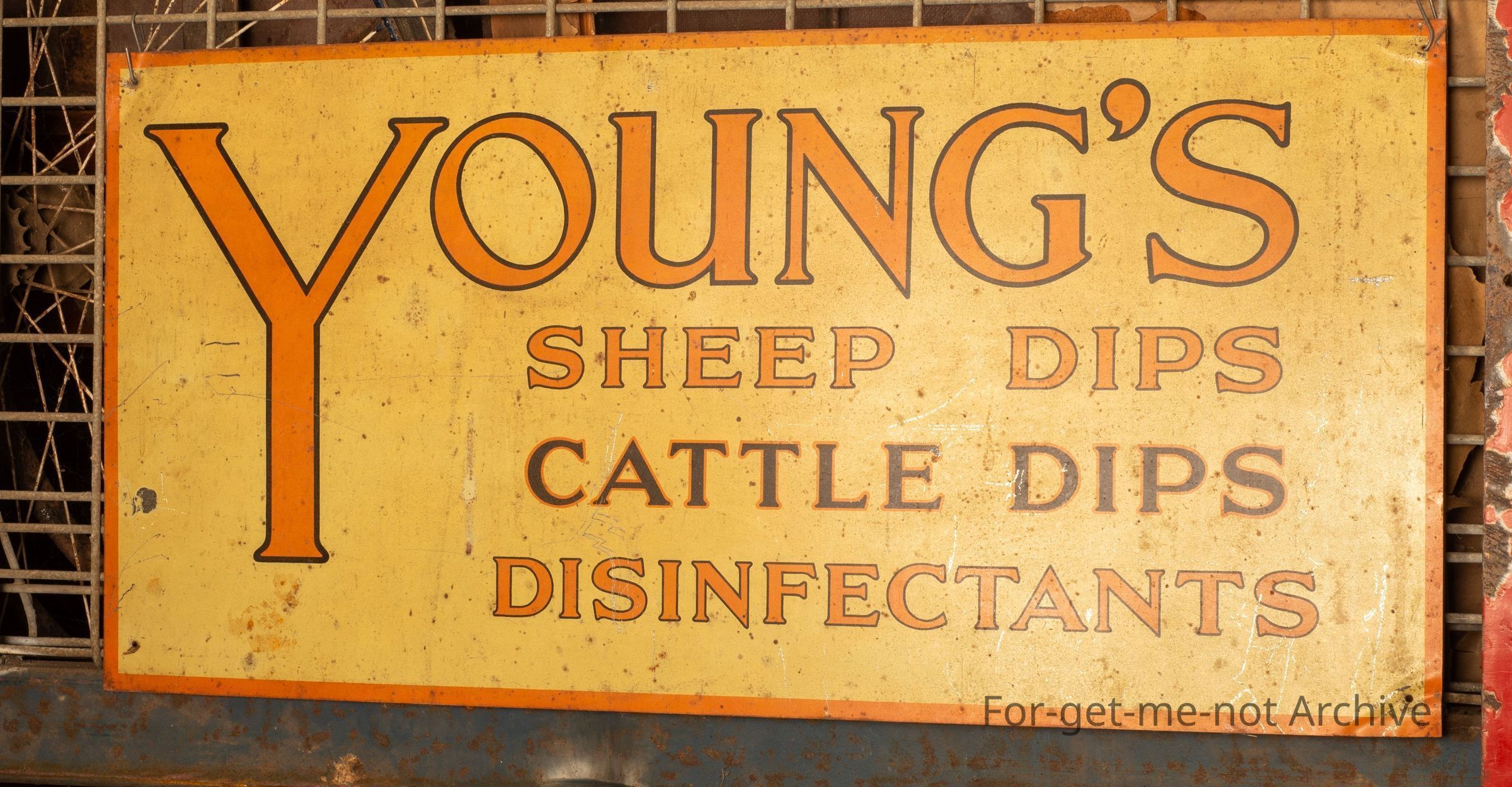 Tin plate sign advertising Young's Animal Health Products, for sheep, horses and pigs. Youngs was an importing, or Youngs products were imported from Scotland. Nice sign not commonly foundCollection