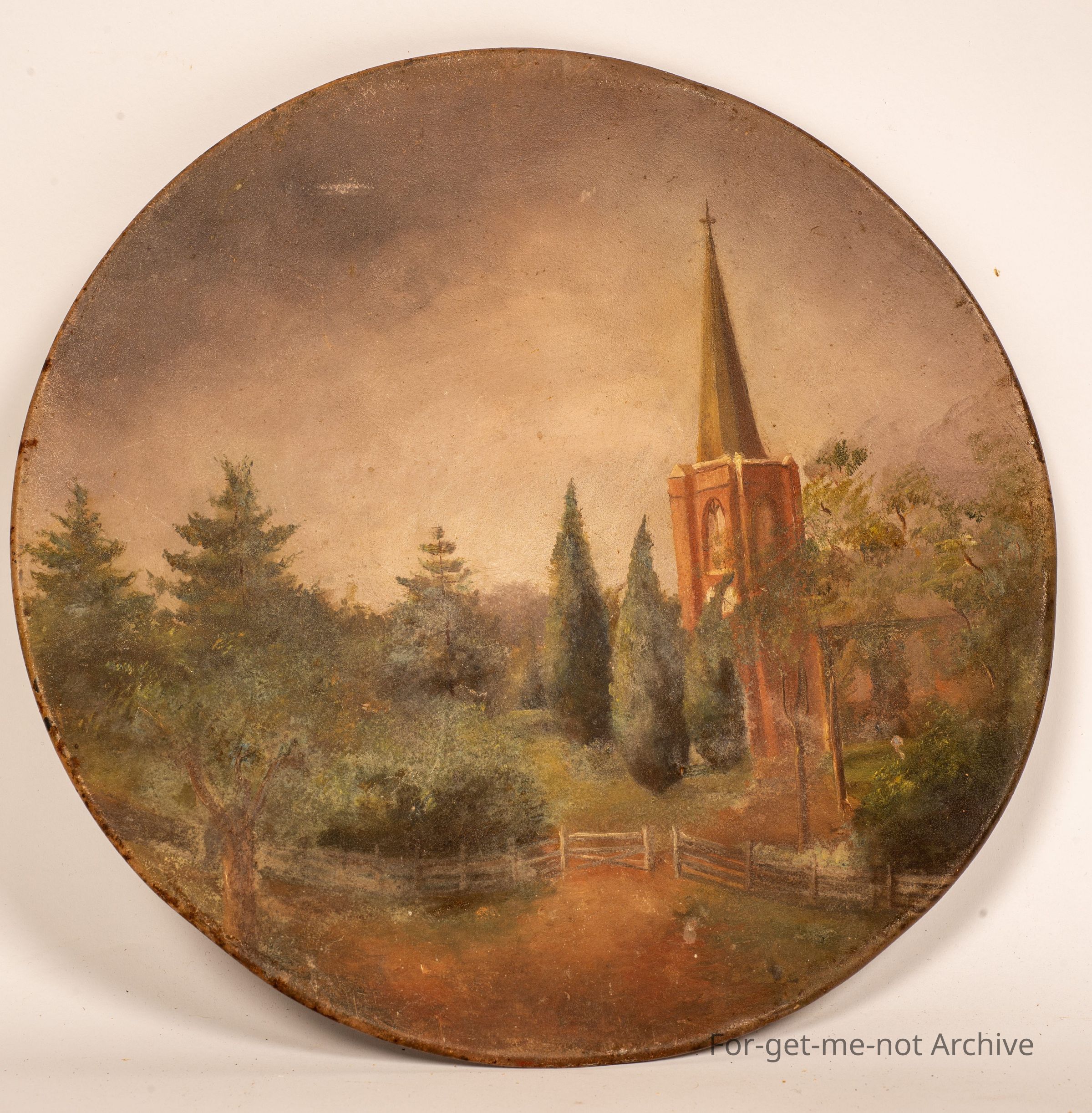 Is a tin disc with a scene of an English village with a church and, surrounding trees and a fence,