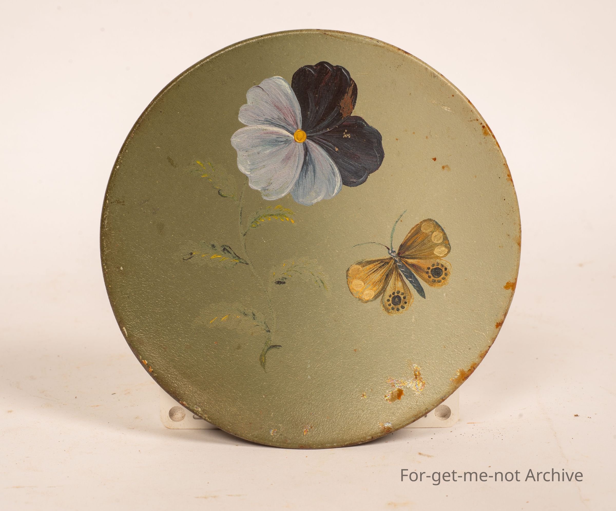 Is another domed saucer like tin plate. This one is painted with a, a moth or a butterfly with a pansy,
