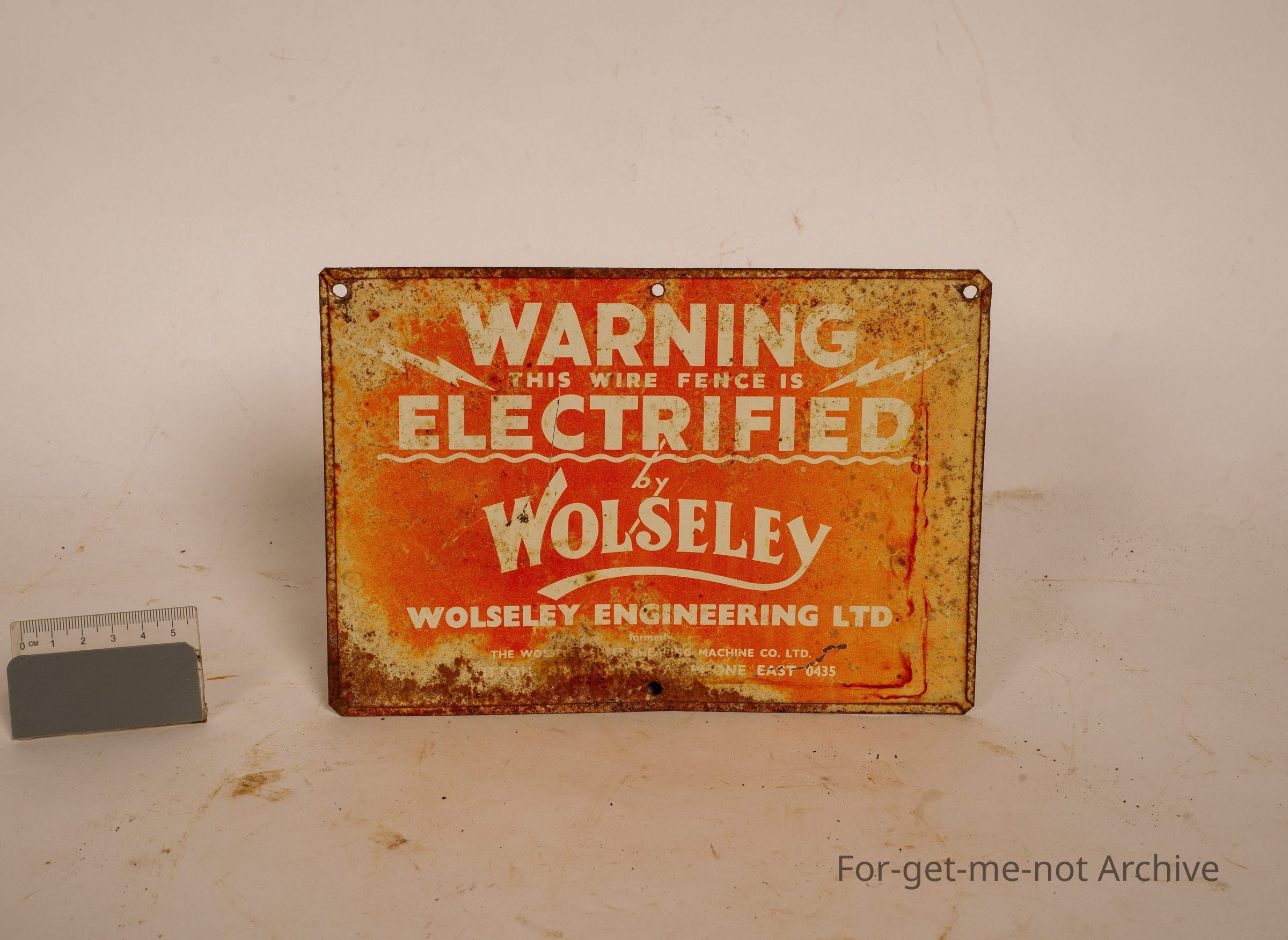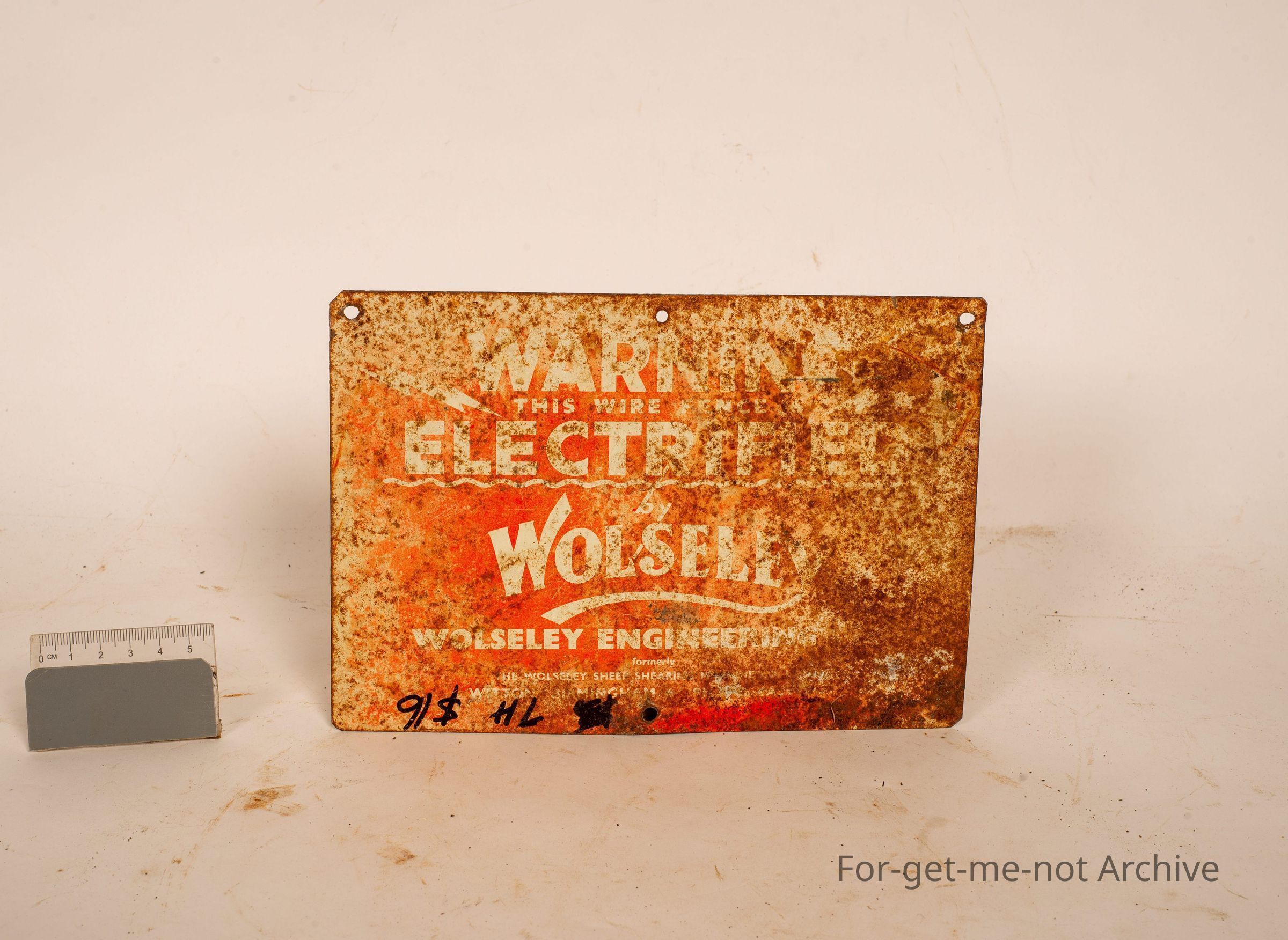This is a very light tin plate, with a warning. This wire fence is electrified by Wolesley Electric Fence. Woolsey Engineering.