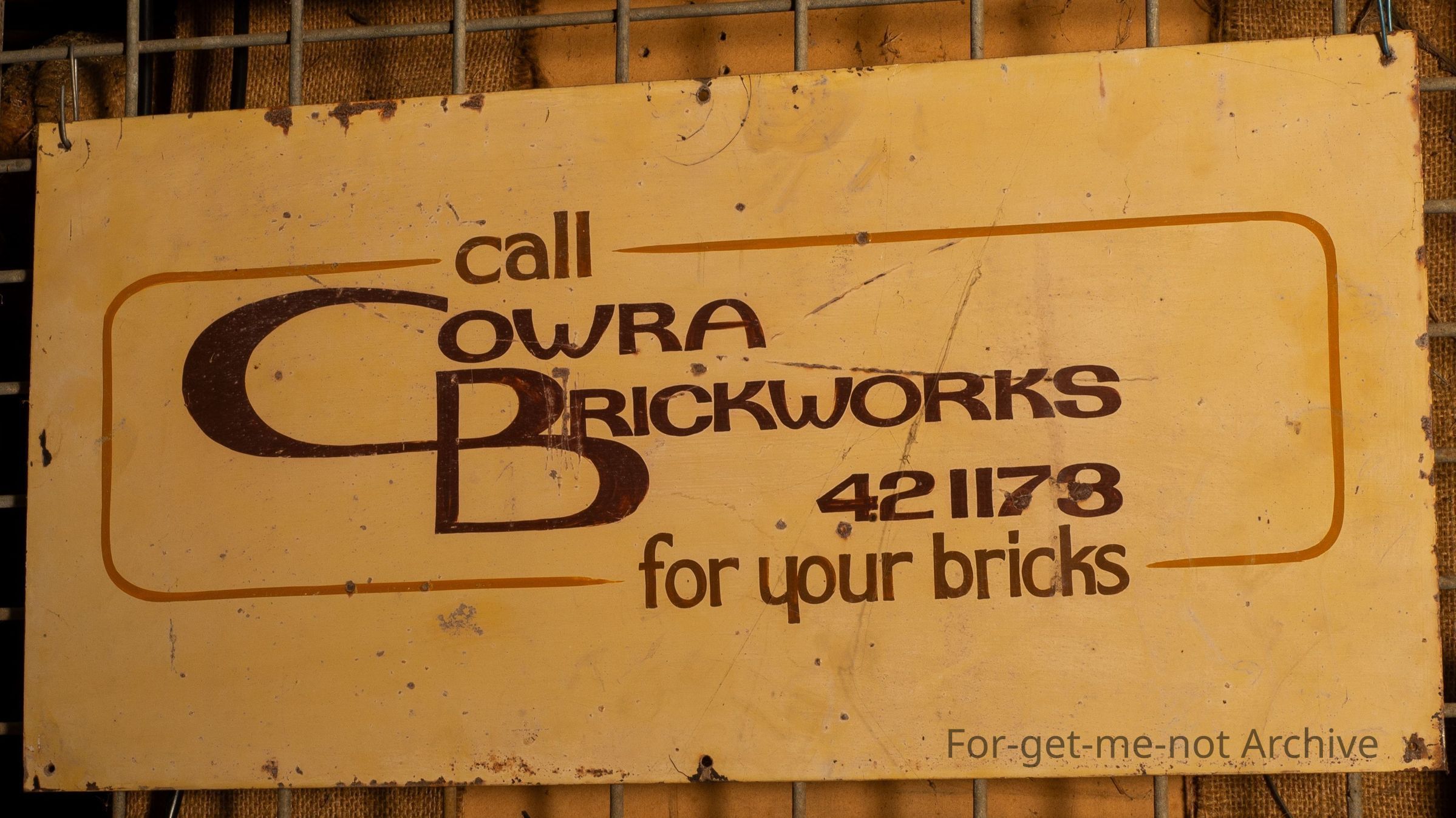 This is a tin plate sign, possibly screen printed, advertising Cowra Brickworks. This is a sign bought at Bendigo Swap years ago