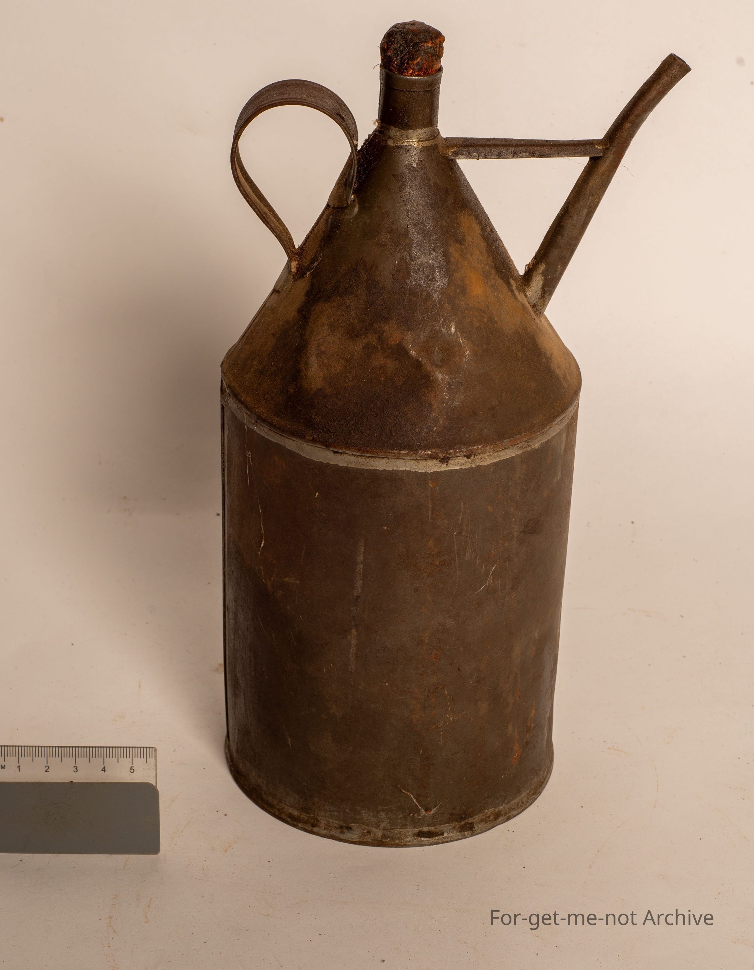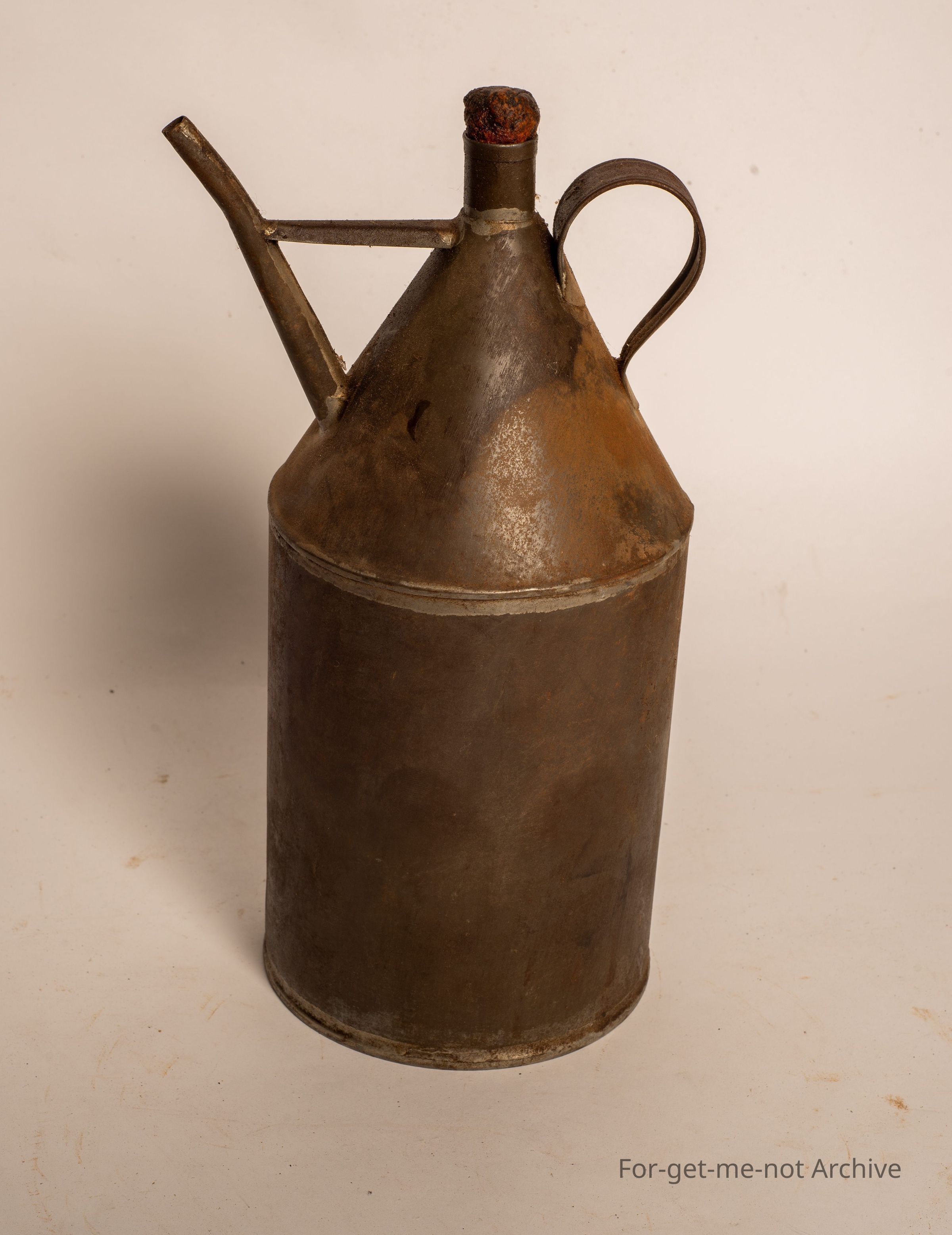 This is a tin pourer for possibly, filling oil lamps, little cork in the top, in very good order. No damage.