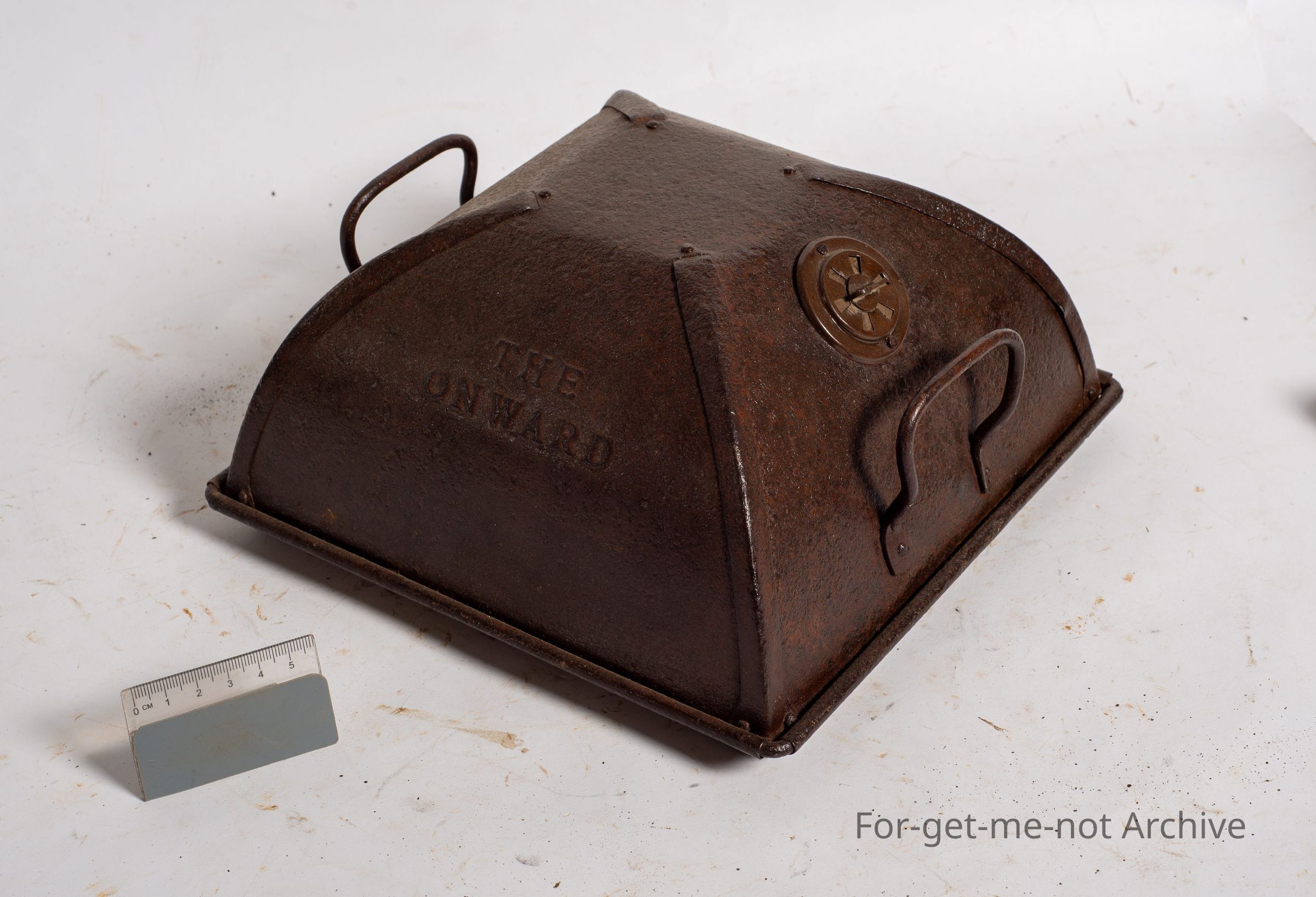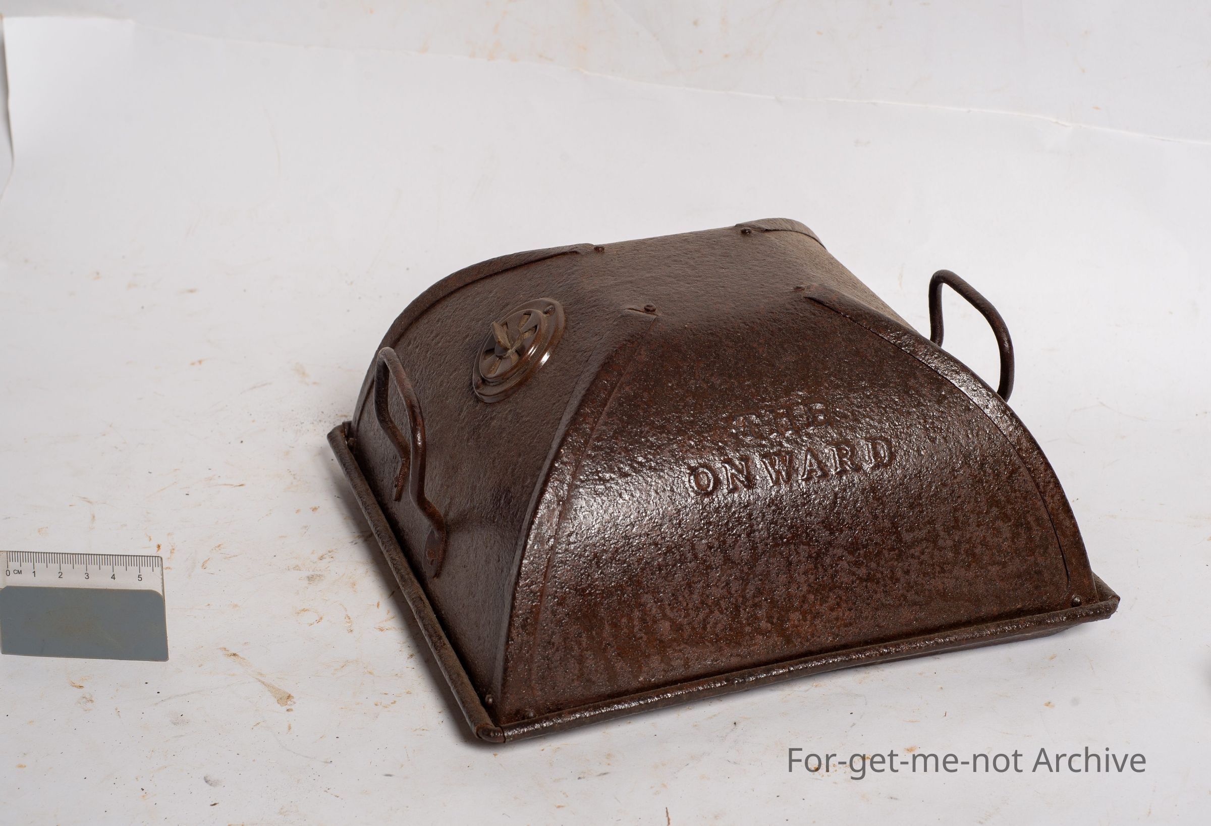 This is the tin lid with a vent. Double handles on the top called the Onwood. This goes on top of a roast in a roasting dish. Neat little piece. At this stage, we don't have the dish to go over the top, but a lovely early piece of tinned Kitchenalia.Collection