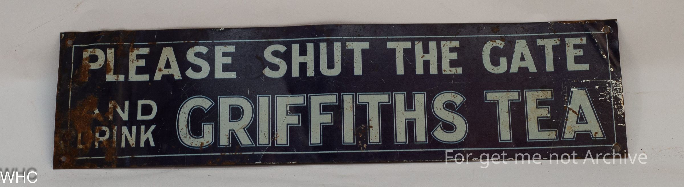 Please shut the gate and drink griffiths tea 350 x 140 approx embossed