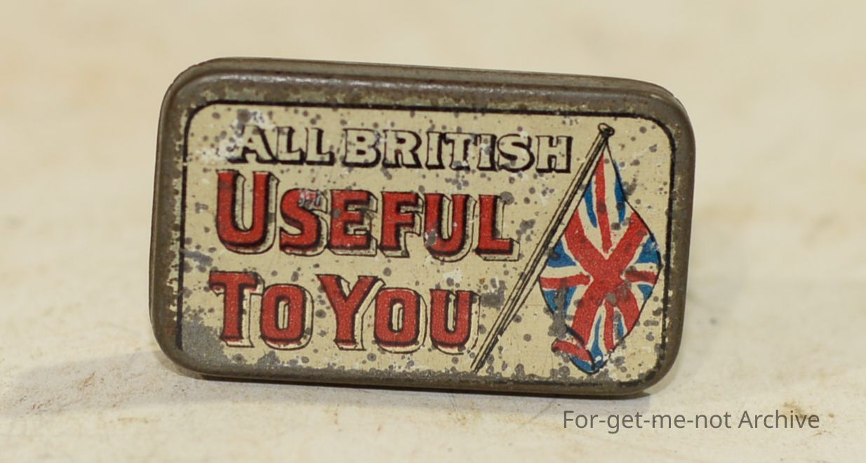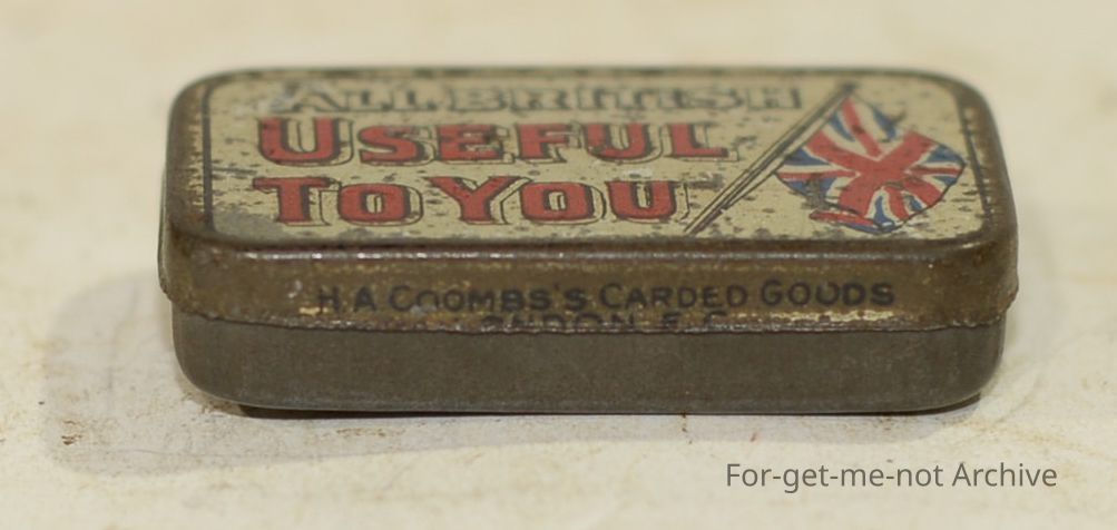 Small tin in good order, " All British Useful to you" H.A. Coombs Carded Goods London may have had Pen nibs or pins or other small items