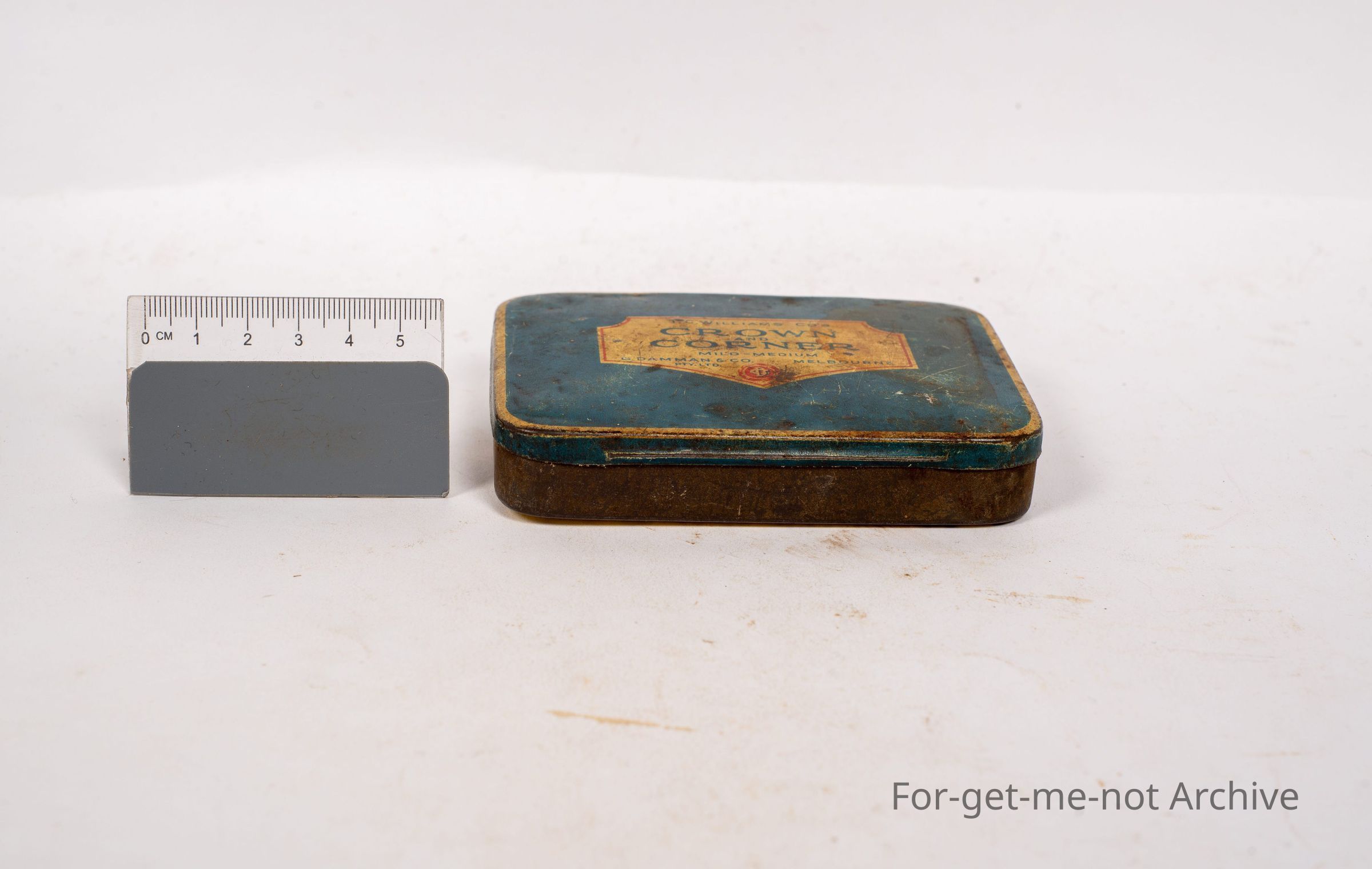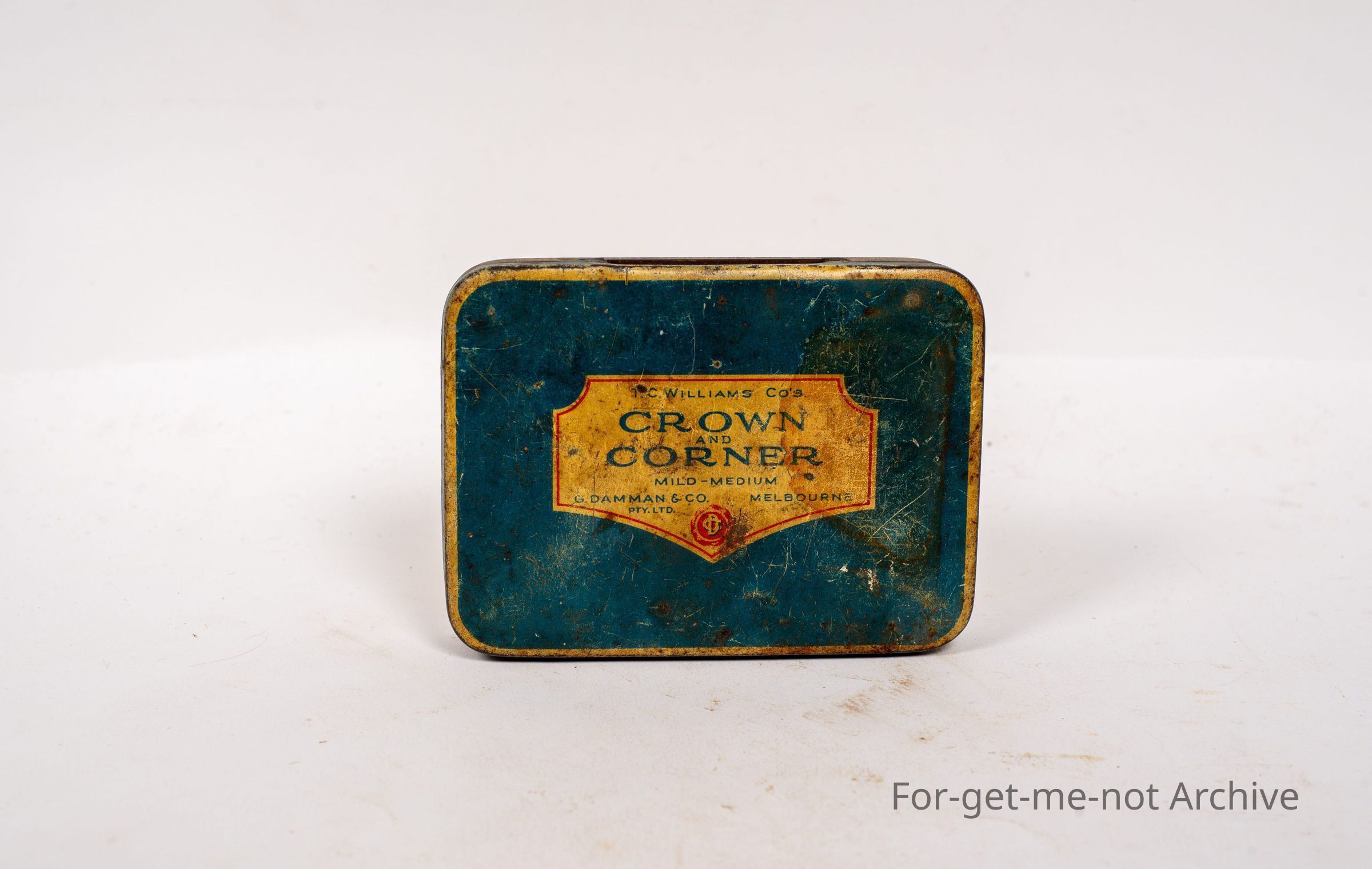 Tin of Crown and Corner, medium mild tobacco, packed by Damen and Co Melbourne, 2 ounce size, down condition,