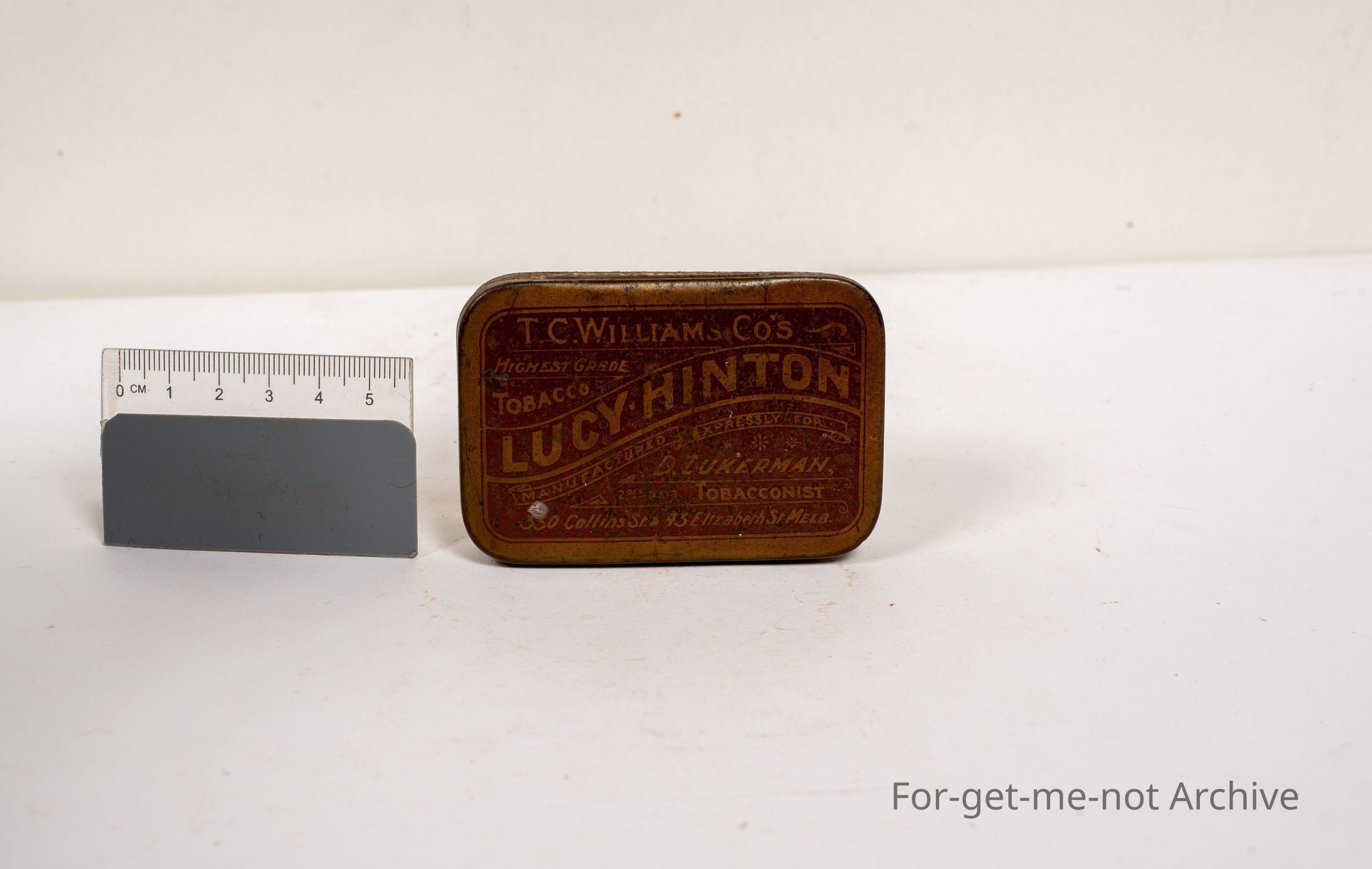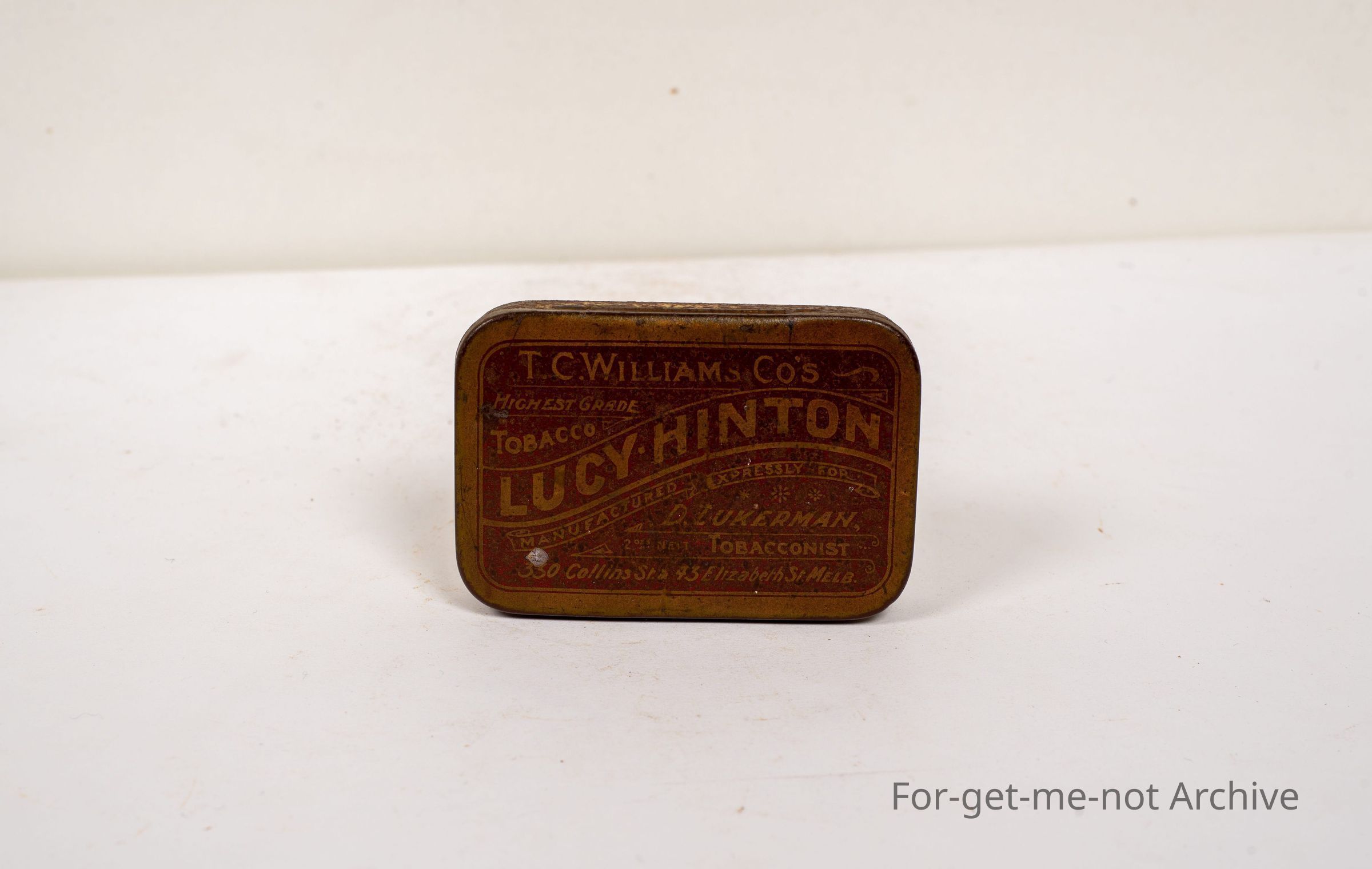 A tin of TC Williams Lucy Hinton, packed at 330 Collins Street and 43 Elizabeth Street, Melbourne. Early tin, D Zukerman tobacconist
