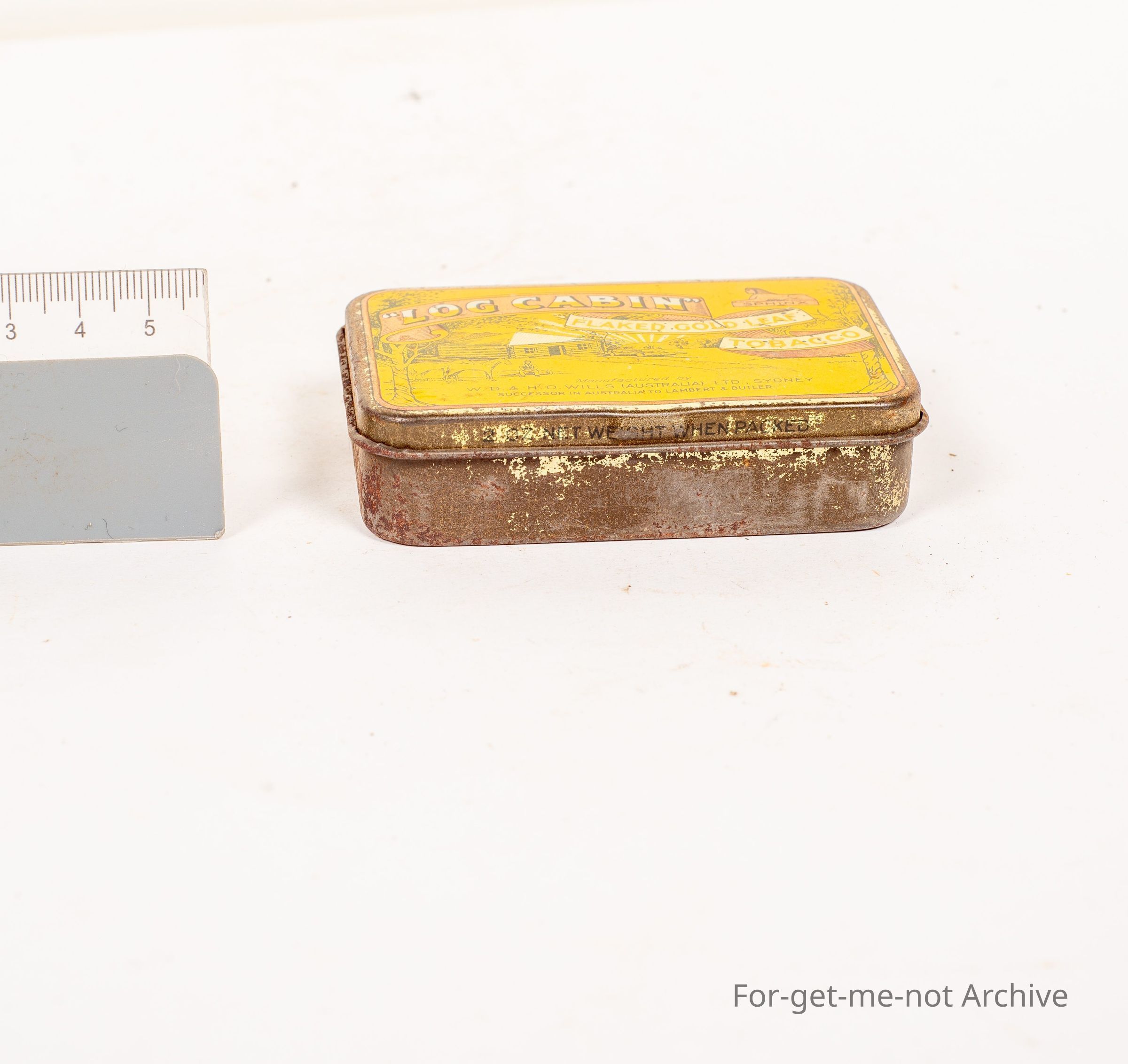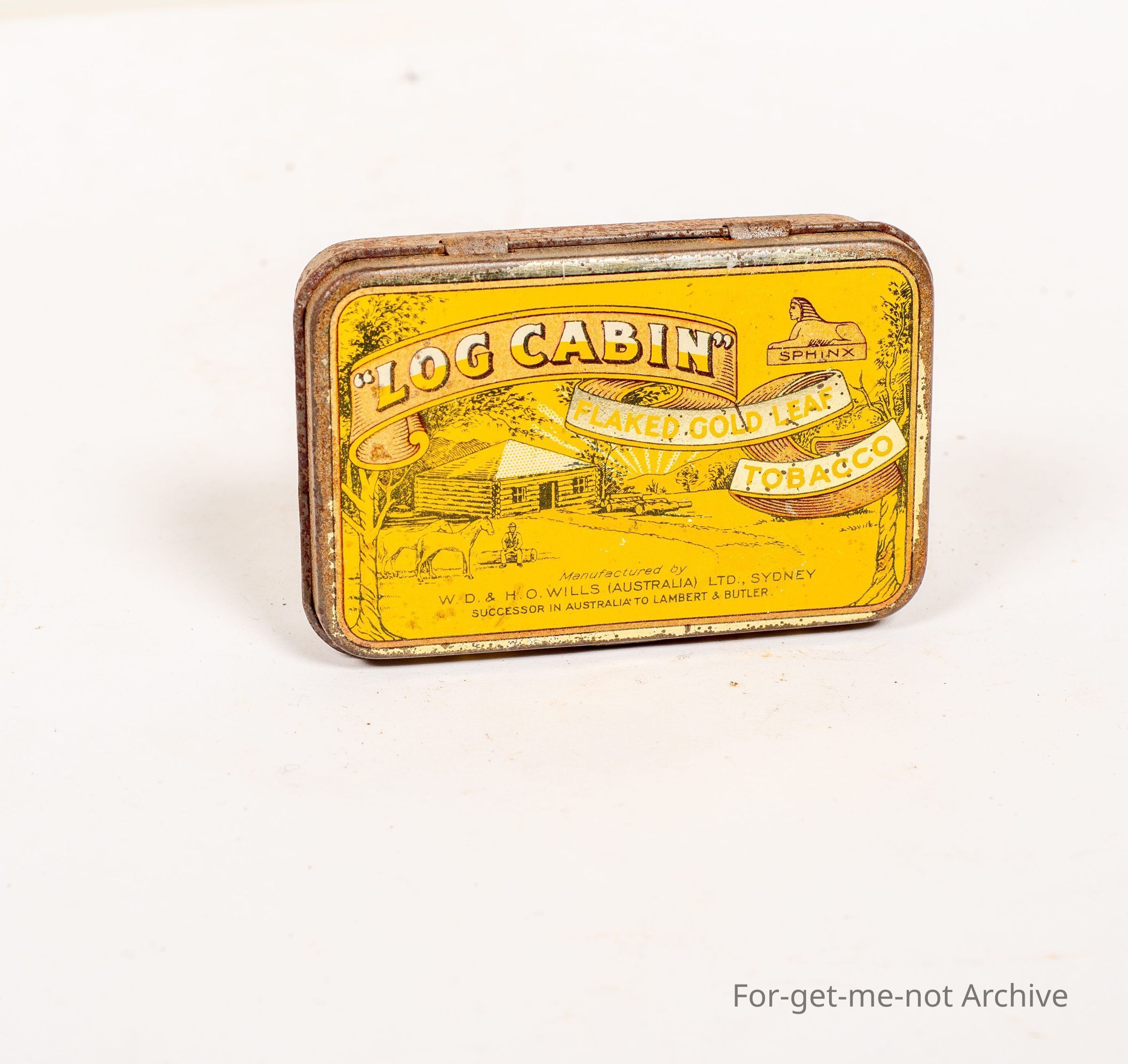 Log Cabin Flake, Gold Leaf Tobacco, WD and HO Wills Australia. 2 ounce, tin. Reasonable condition.