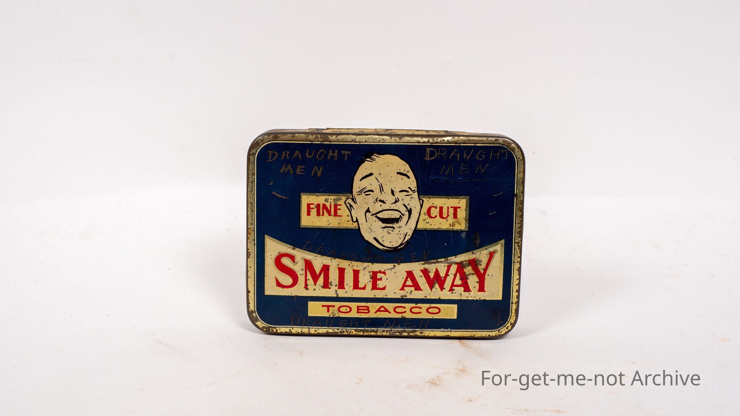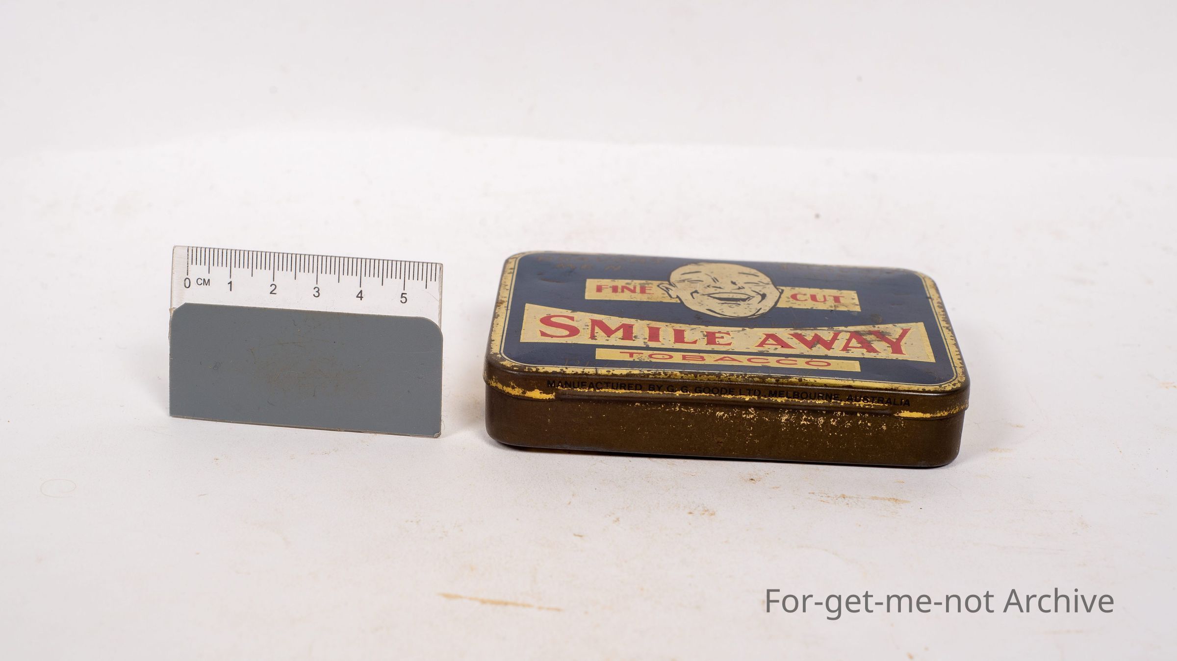 A 2 ounce tin of Fine Cut Smile Away Tobacco, a beautiful Australian tin, packed by Good Melbourne.