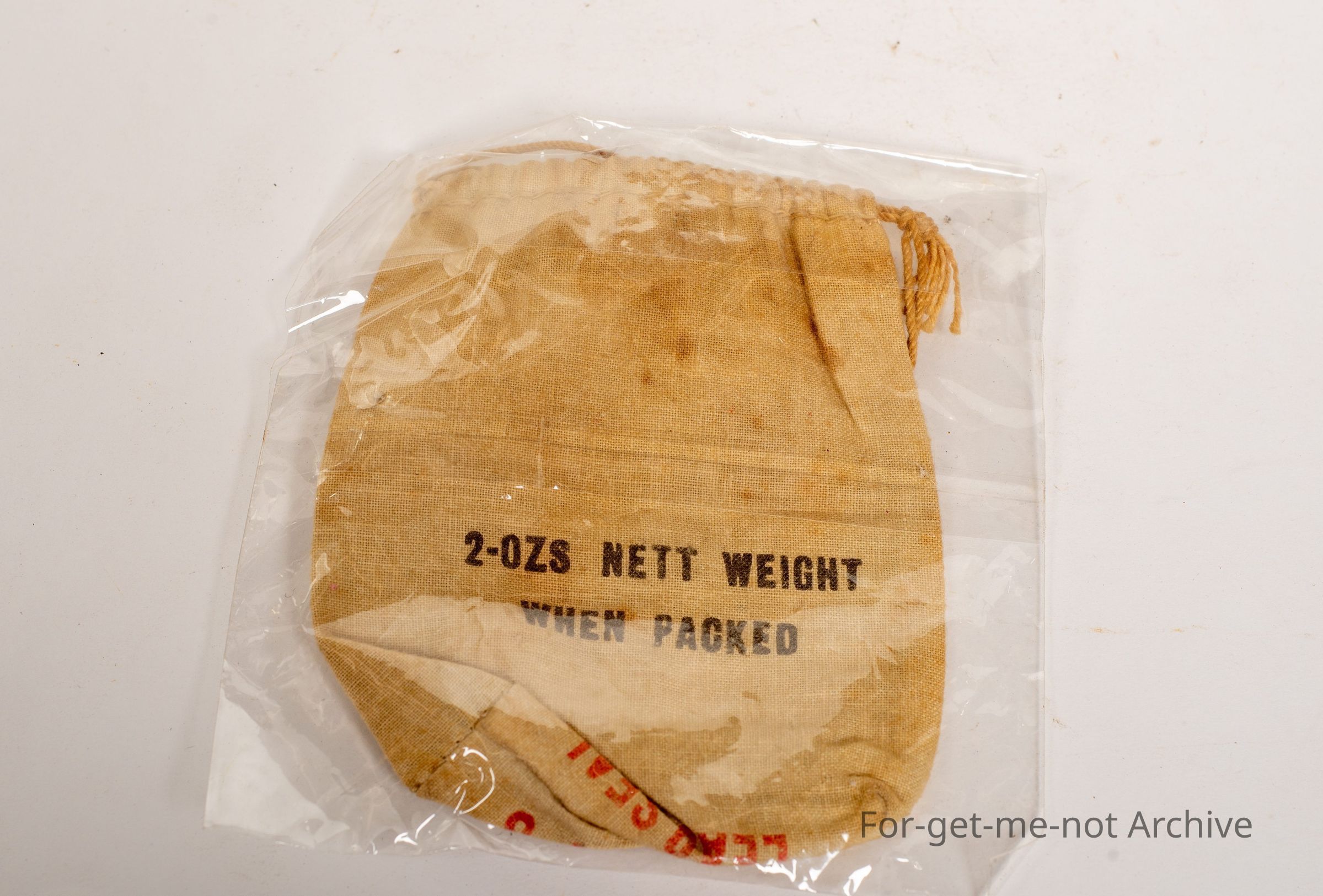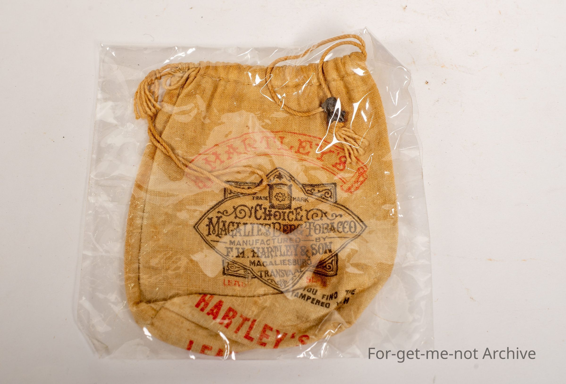 A Calico tobacco pouch, , Choice Magaliesberg tobacco , from Transvaal, F.H. Hartley and son which is once again South African. Quite an interesting little bag. 2 ounce package when net when packed.Collection