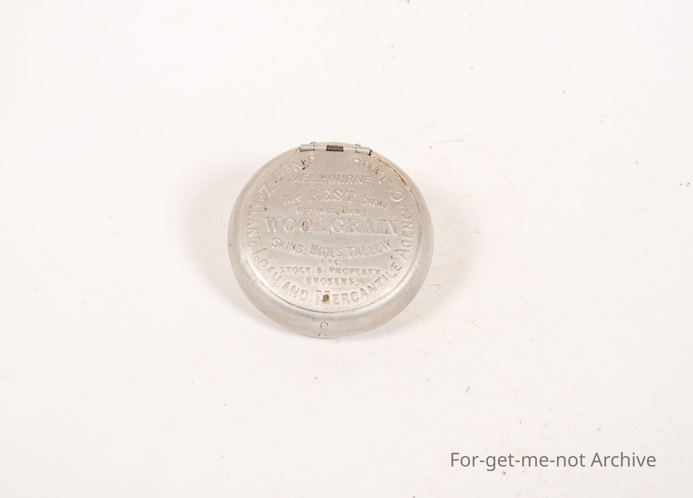 A beautiful aluminium tobacco cap pouch. Advertising New Zealand loan and mercantile agency company Melbourne, the best for handling wool grain skinned hide tallow. A rare piece in beautiful condition,Collection