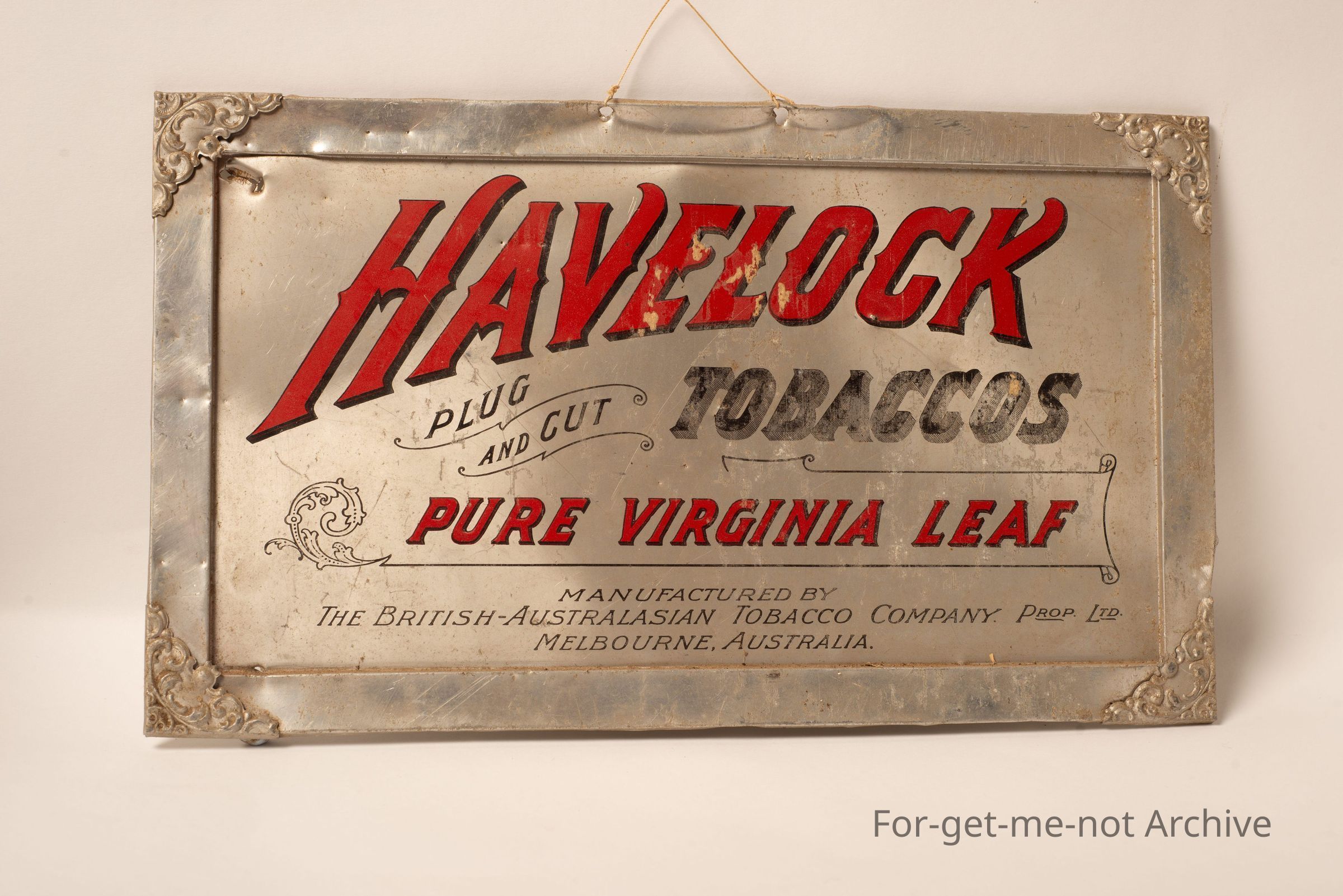 An aluminium advertising piece for Havelock tobaccos. Pure Virginia leaf, probably quite early. Australian