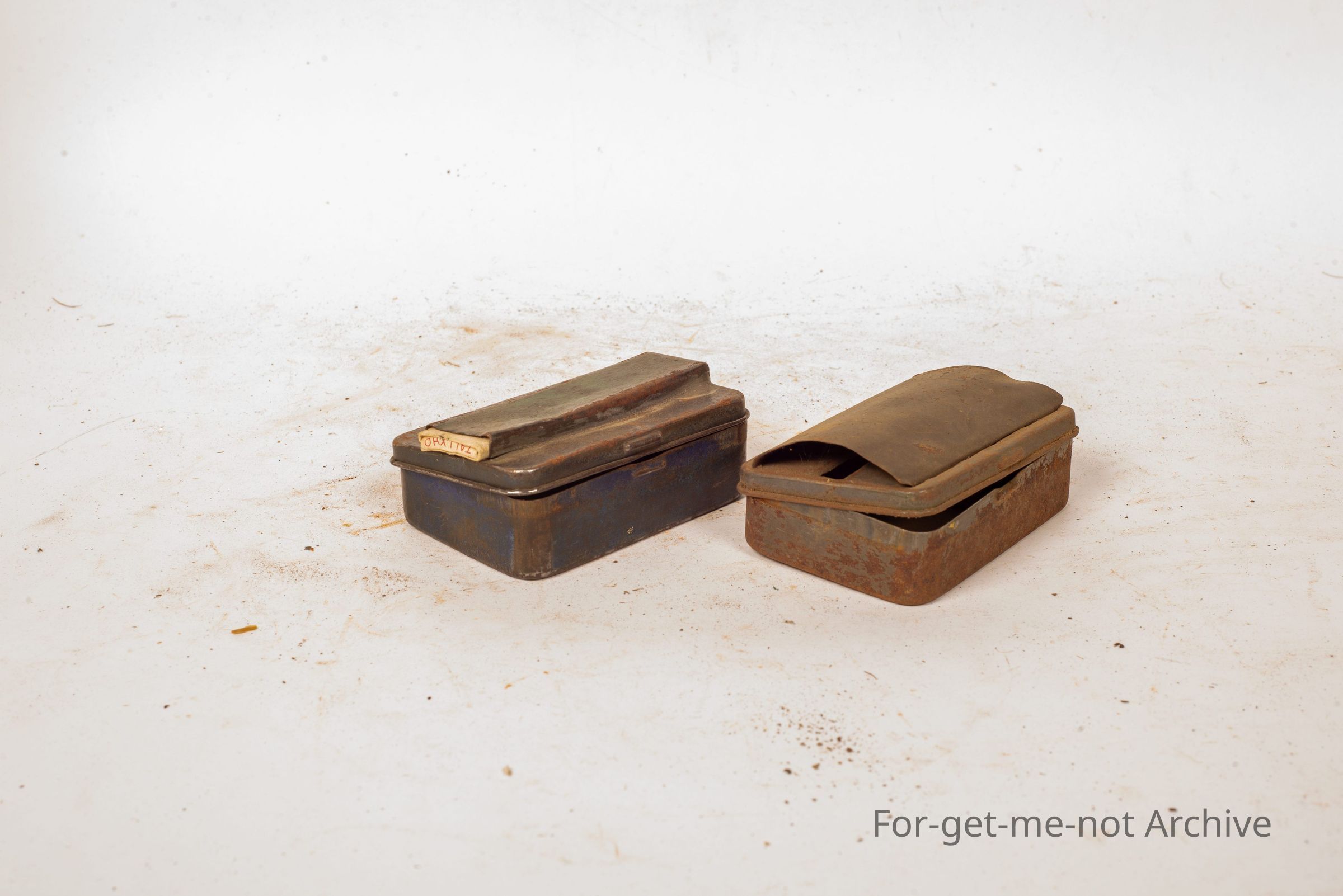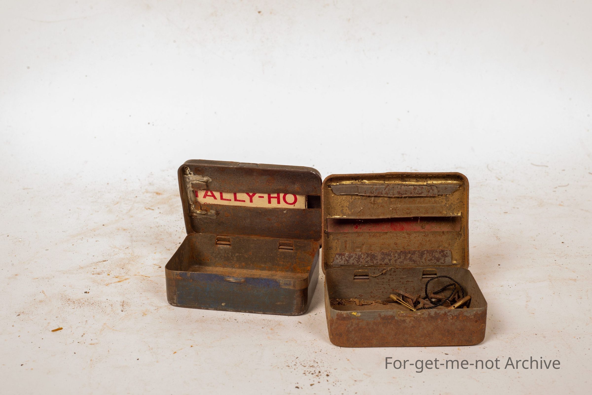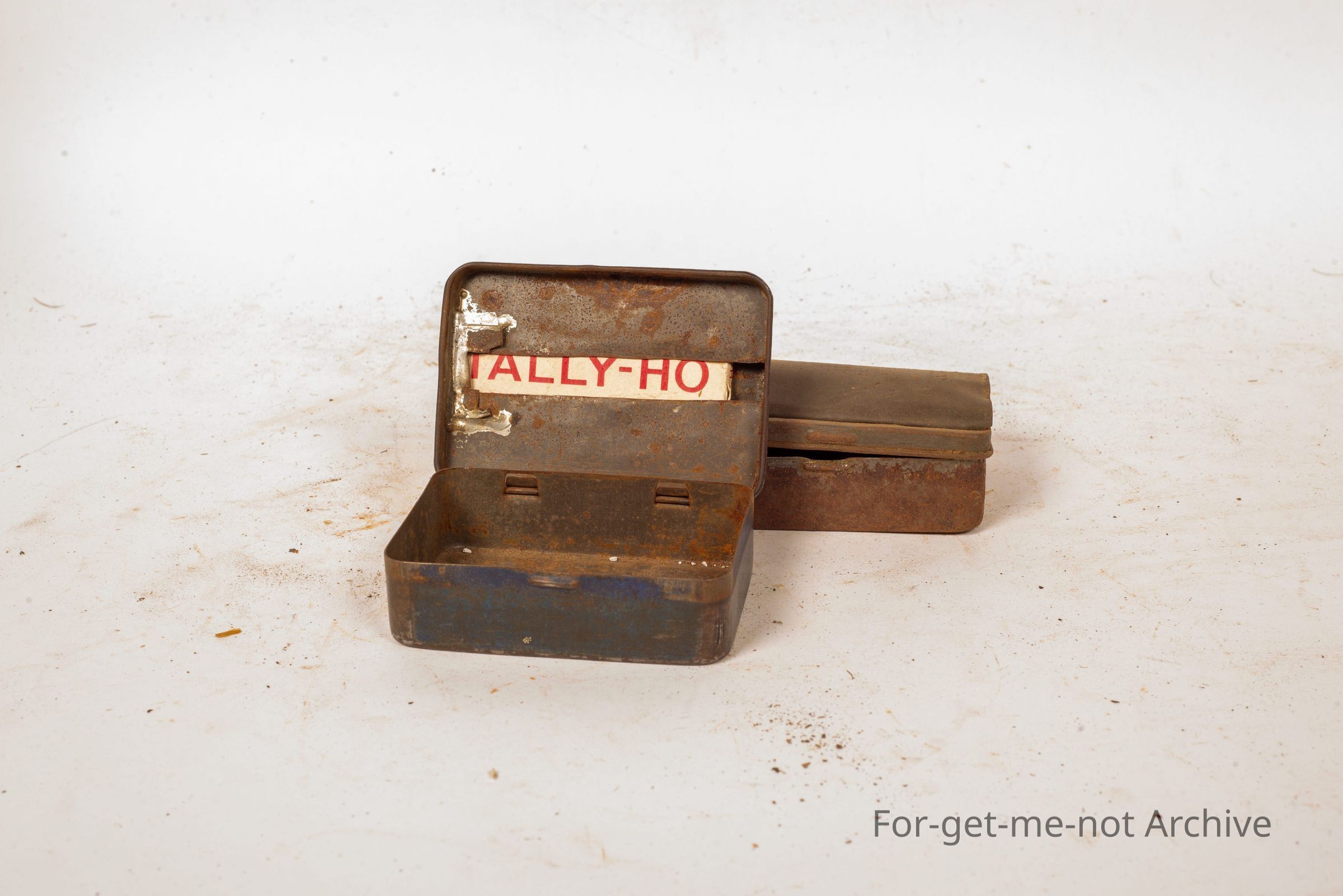 These are 2 tobacco tins that have had pieces added for holding the Rolly papers in the top of the tin. This is classic improvisation. One has the Rolly's, Tally Ho Rolly's still in the top, the other one, not doesn't have them. What do you reckon is the story of this one? So it's got a pressing in the name along there, but like it's got pieces of steel. I imagine that's for the papers. Oh yeah. Could it be for putting it, you put your papers in there in such a way that you can pull the paper out. Oh from the inside.Collection