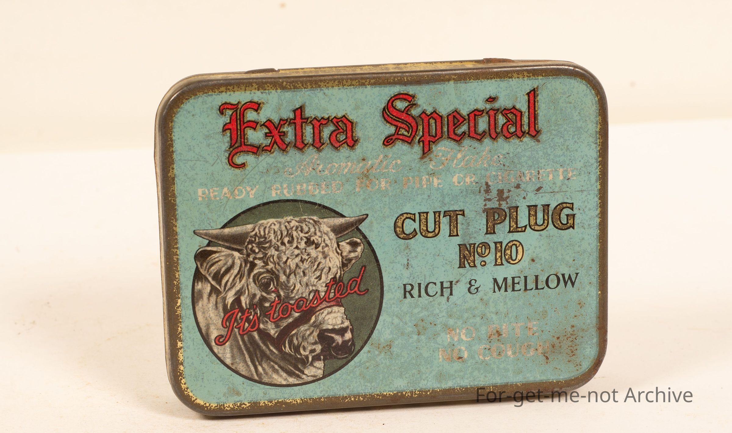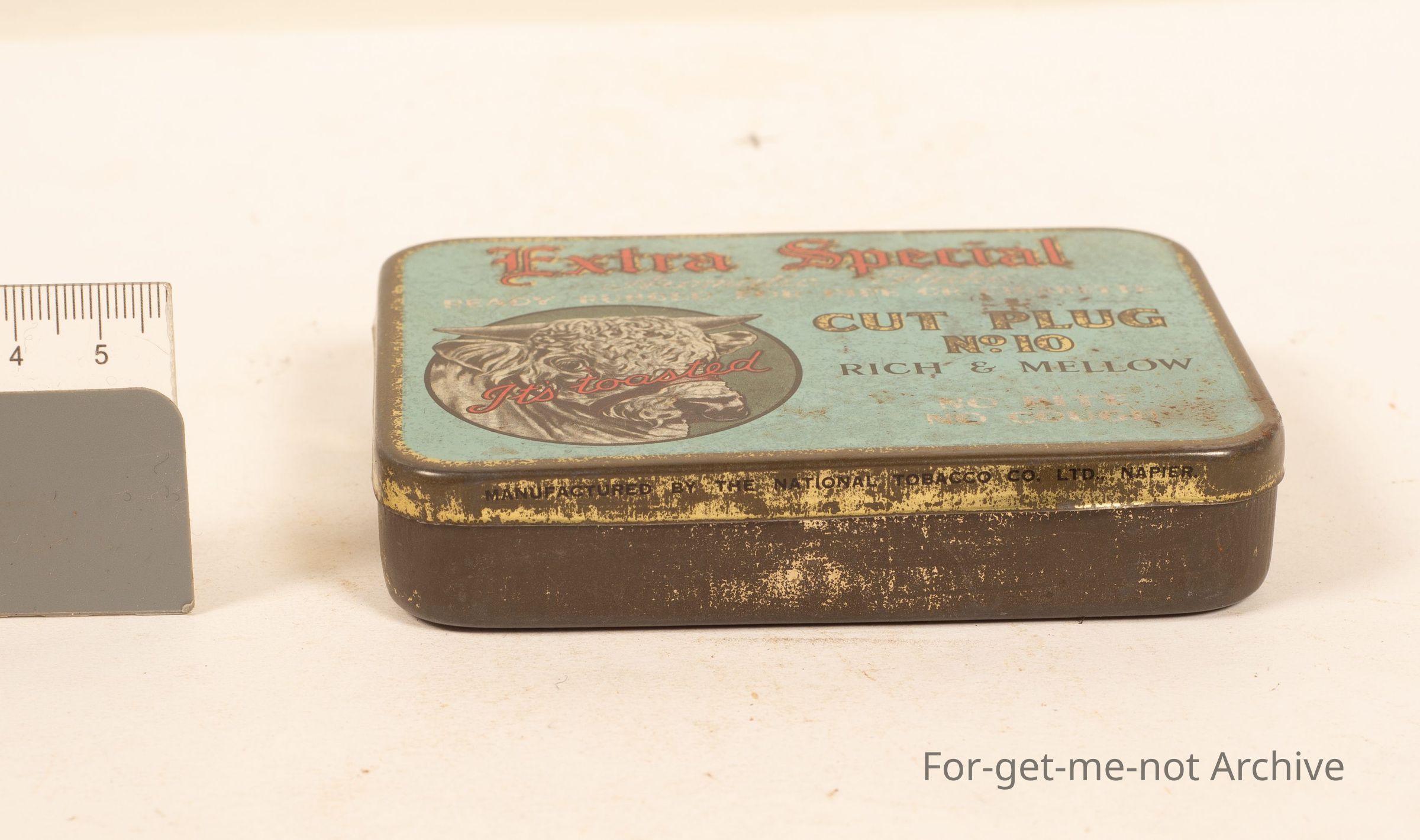 Extra special cut plug, rich and mellow, picture of a cow on the front. National Tobacco Company, Napier, New Zealand.