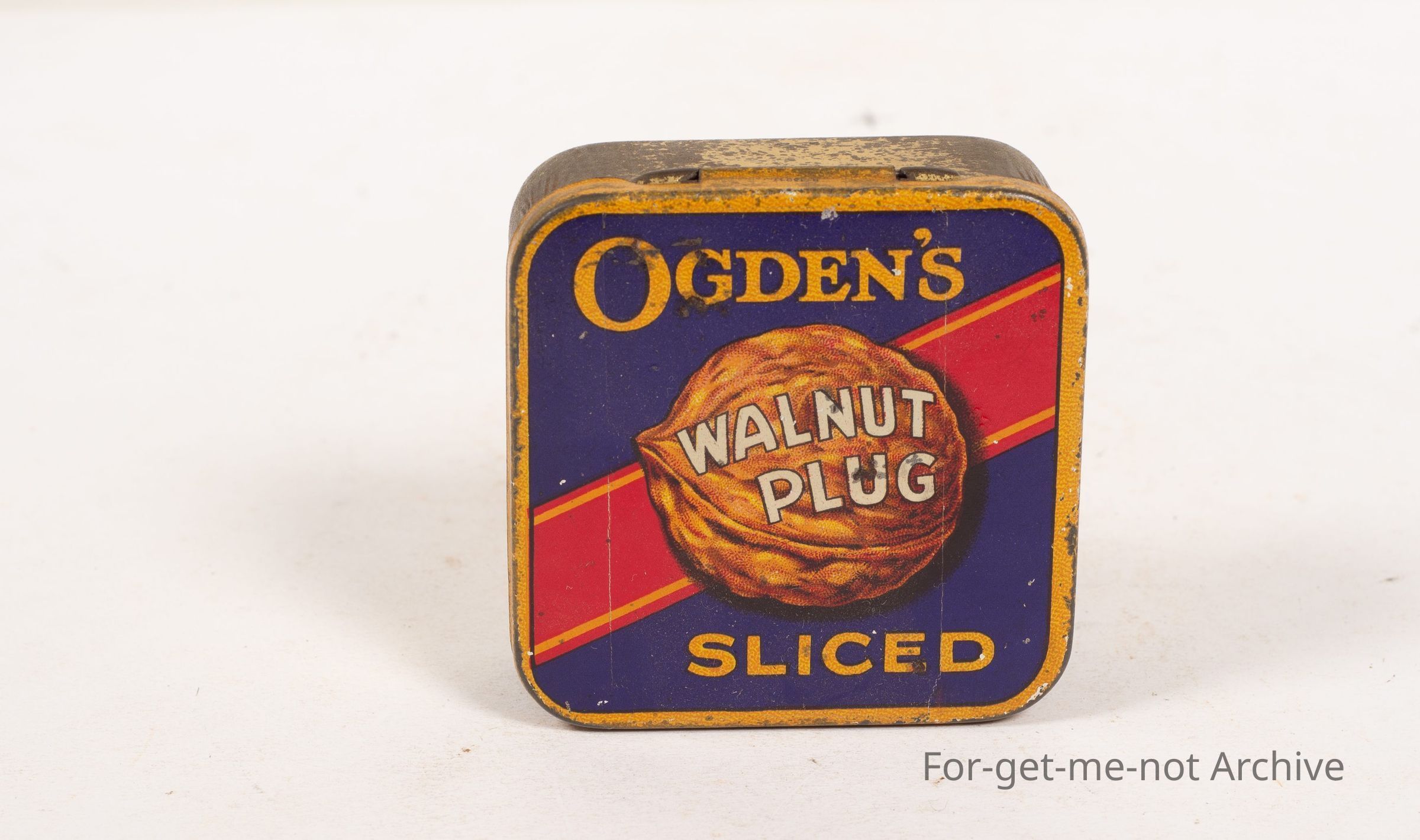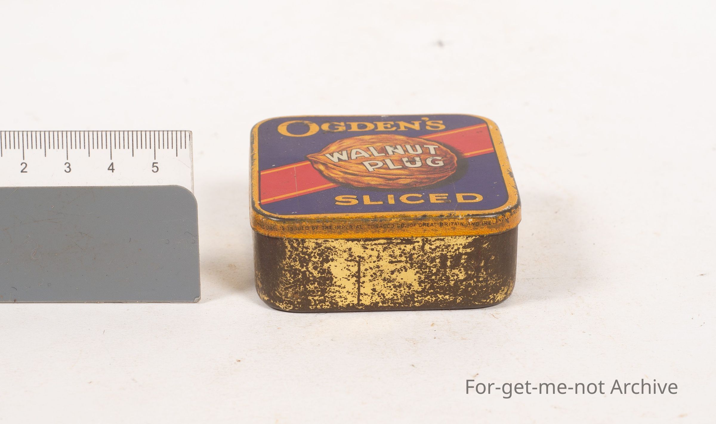 A small 1 ounce tin of Ogden's walnut plug, sliced. Imperial Tobacco.
