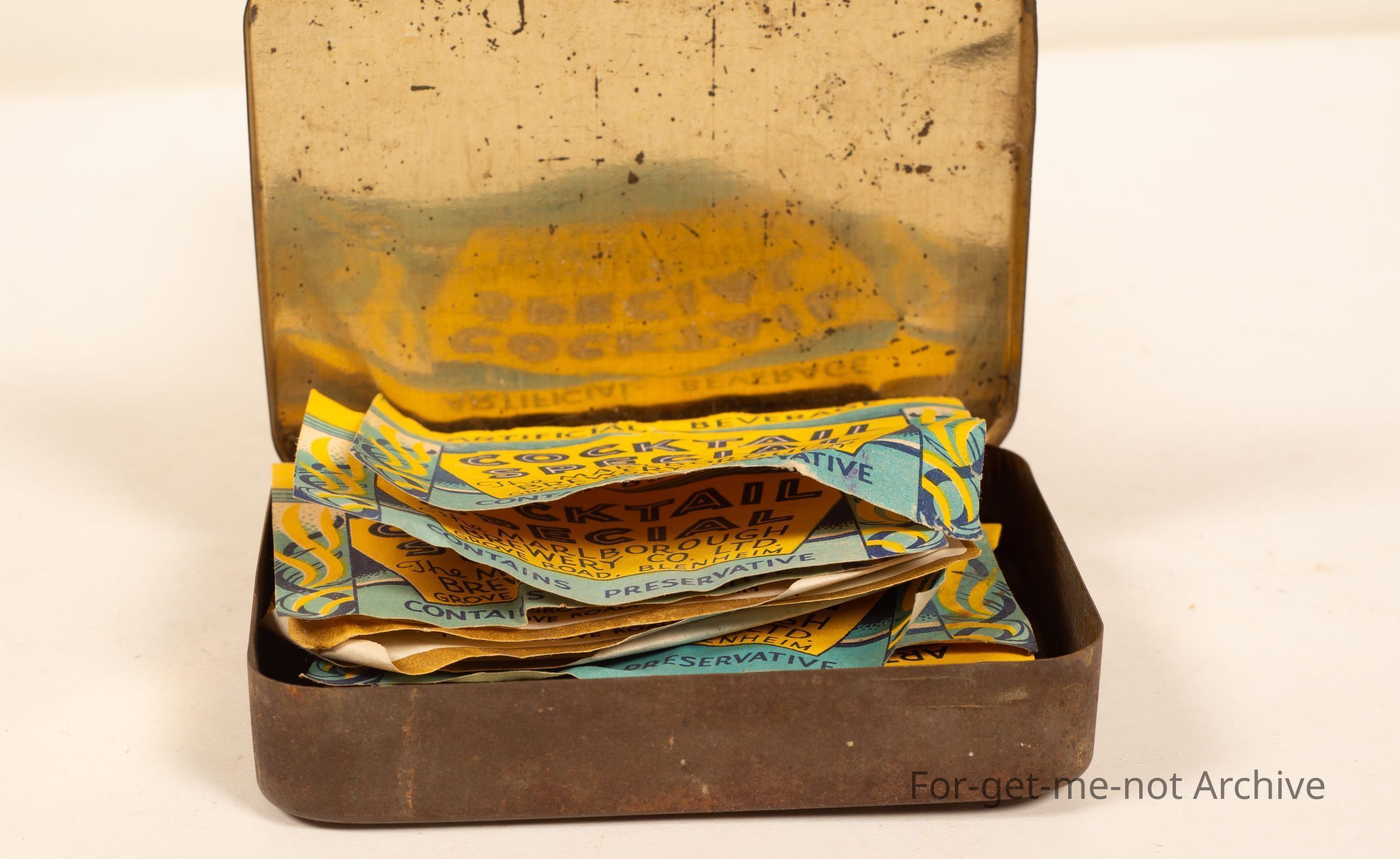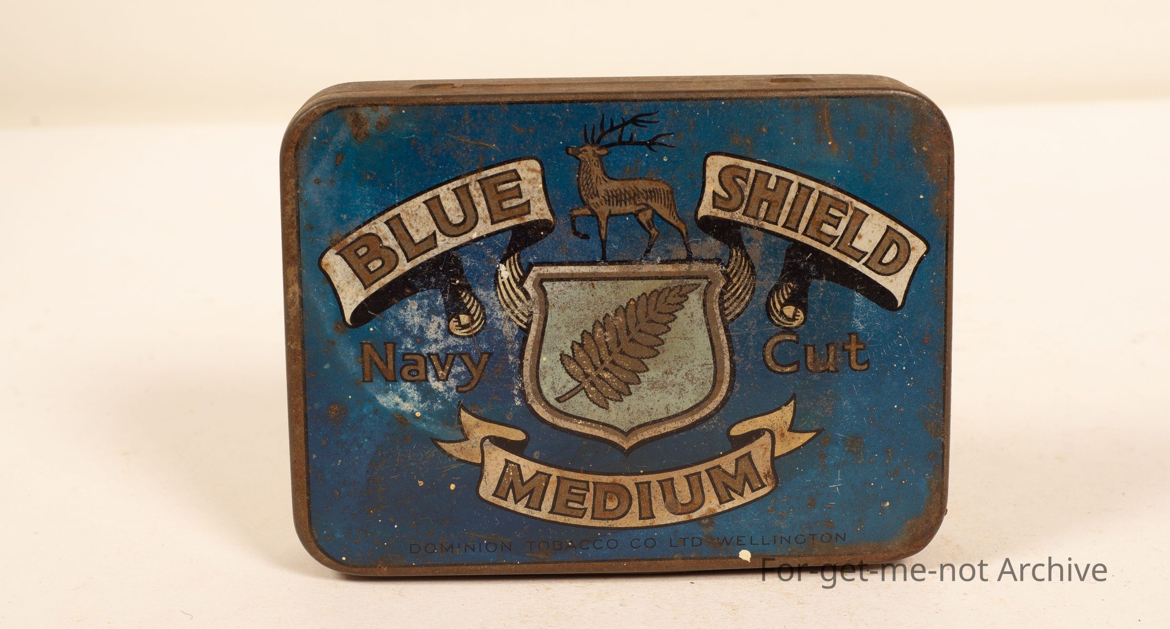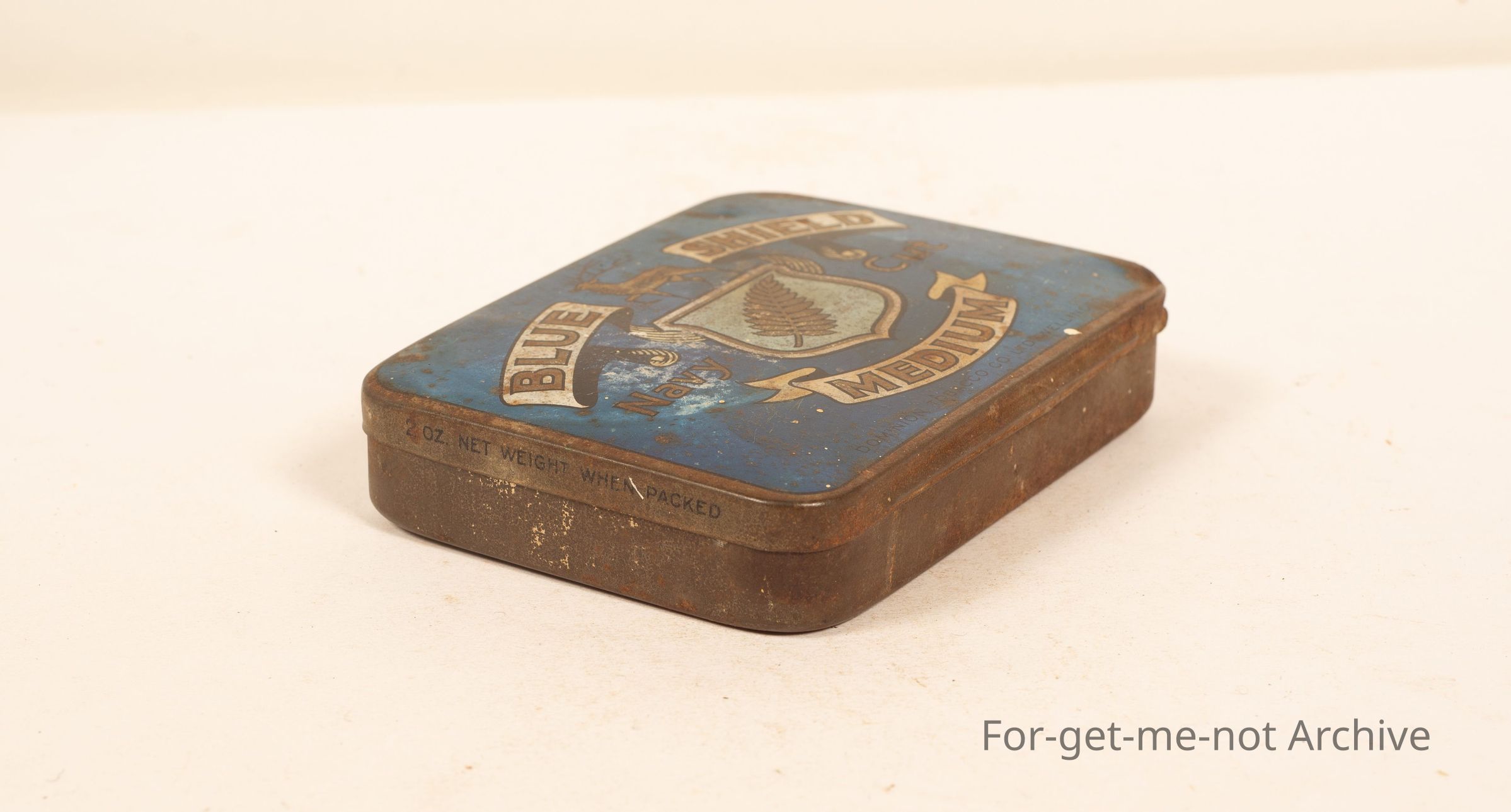 Blue Shield Medium, Dominion Tobacco Company, Wellington. This one is down a bit. Inside tin there are a bunch of cordial bottle labels