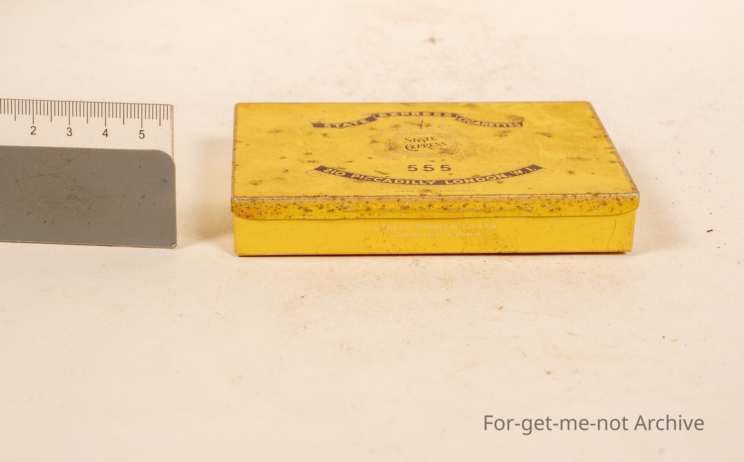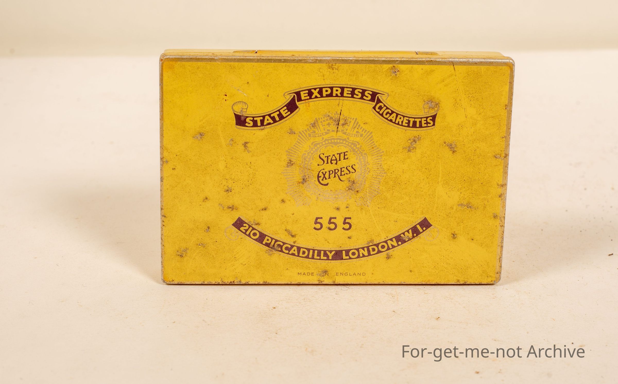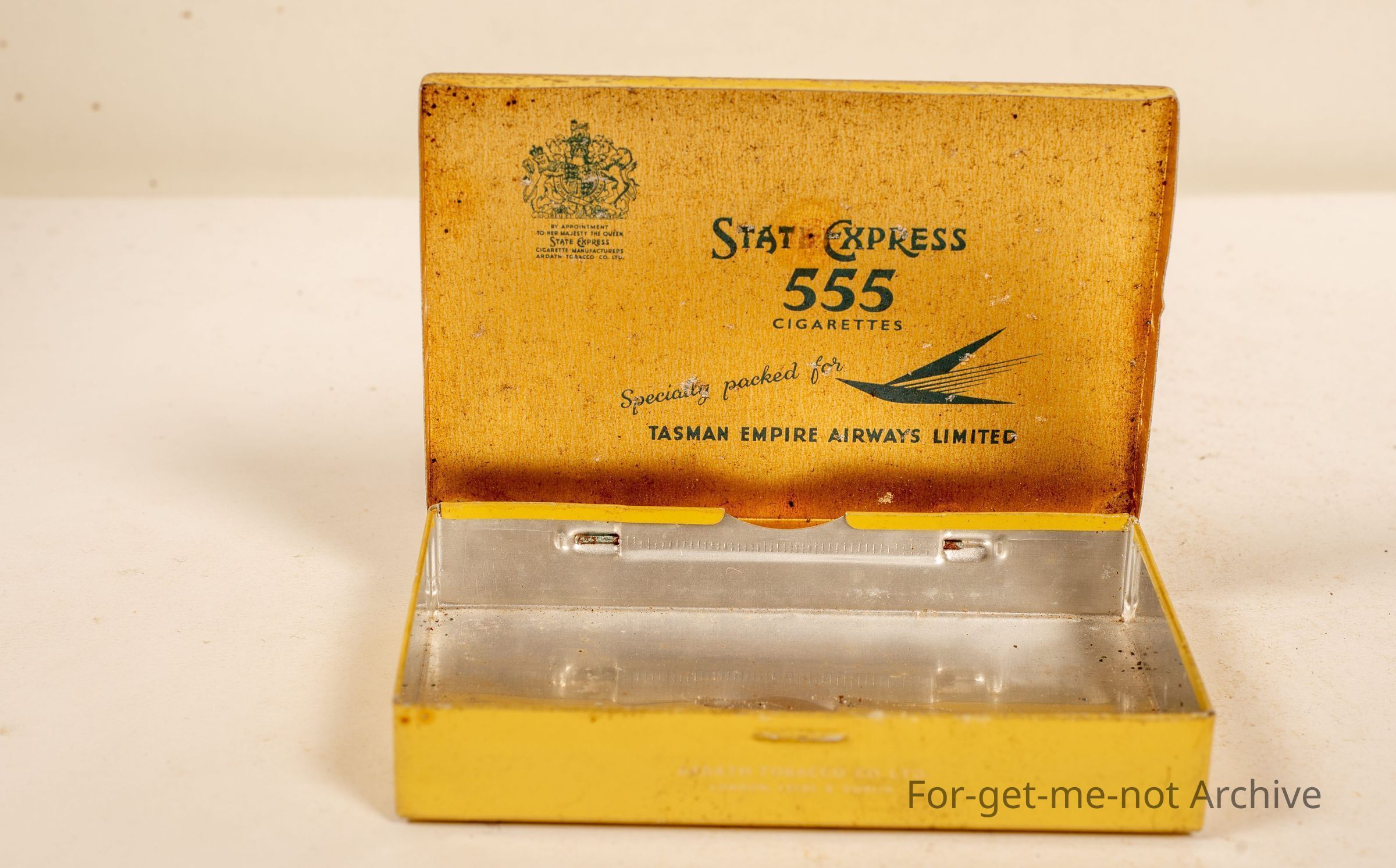 A very light tin of state express cigarettes, State express cigarettes 555 Piccadilly London value, The tin was especially packed for Tasman airways ltd, hence the aluminium tin construction, when smoking on planes was allowedCollection