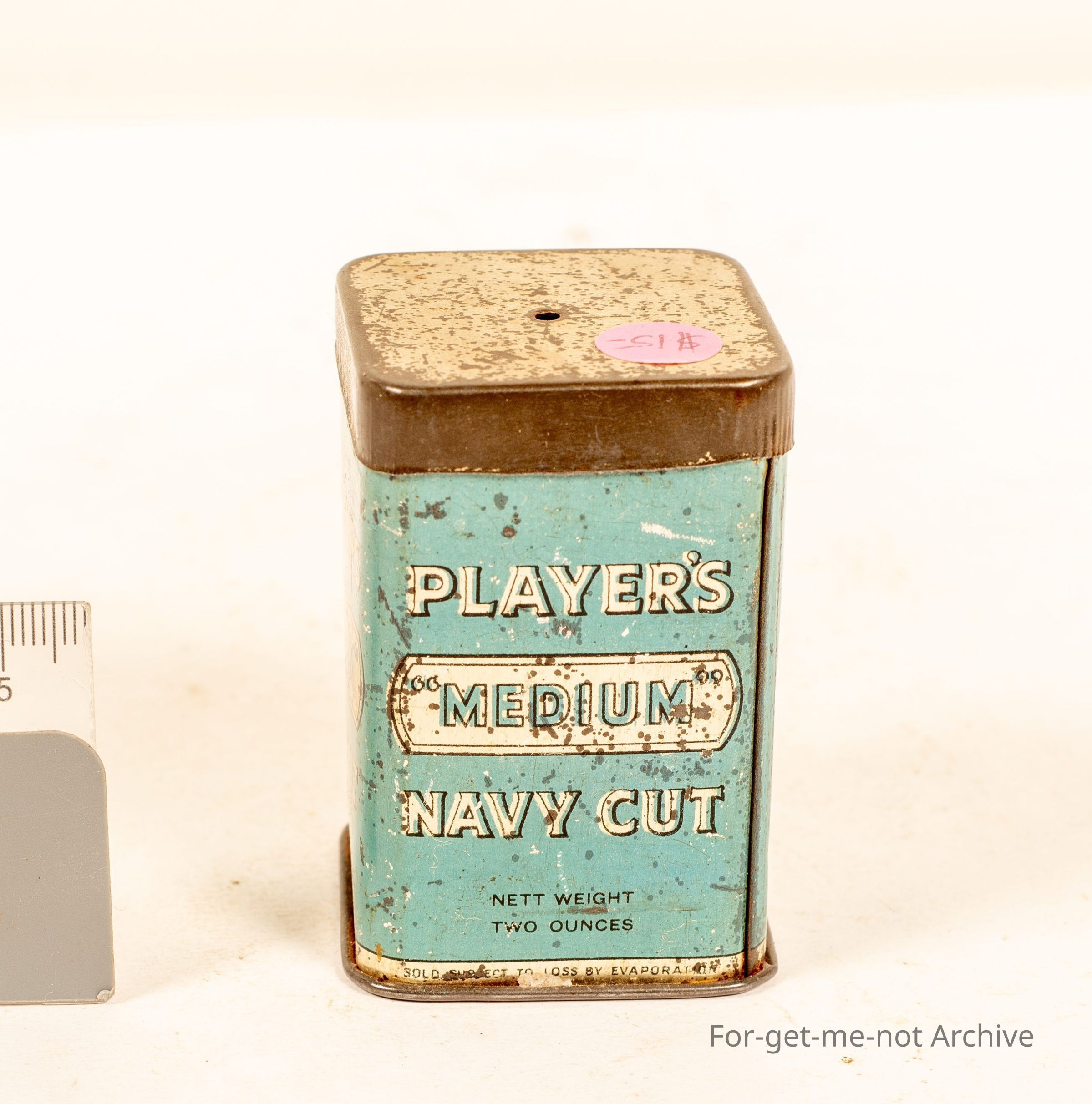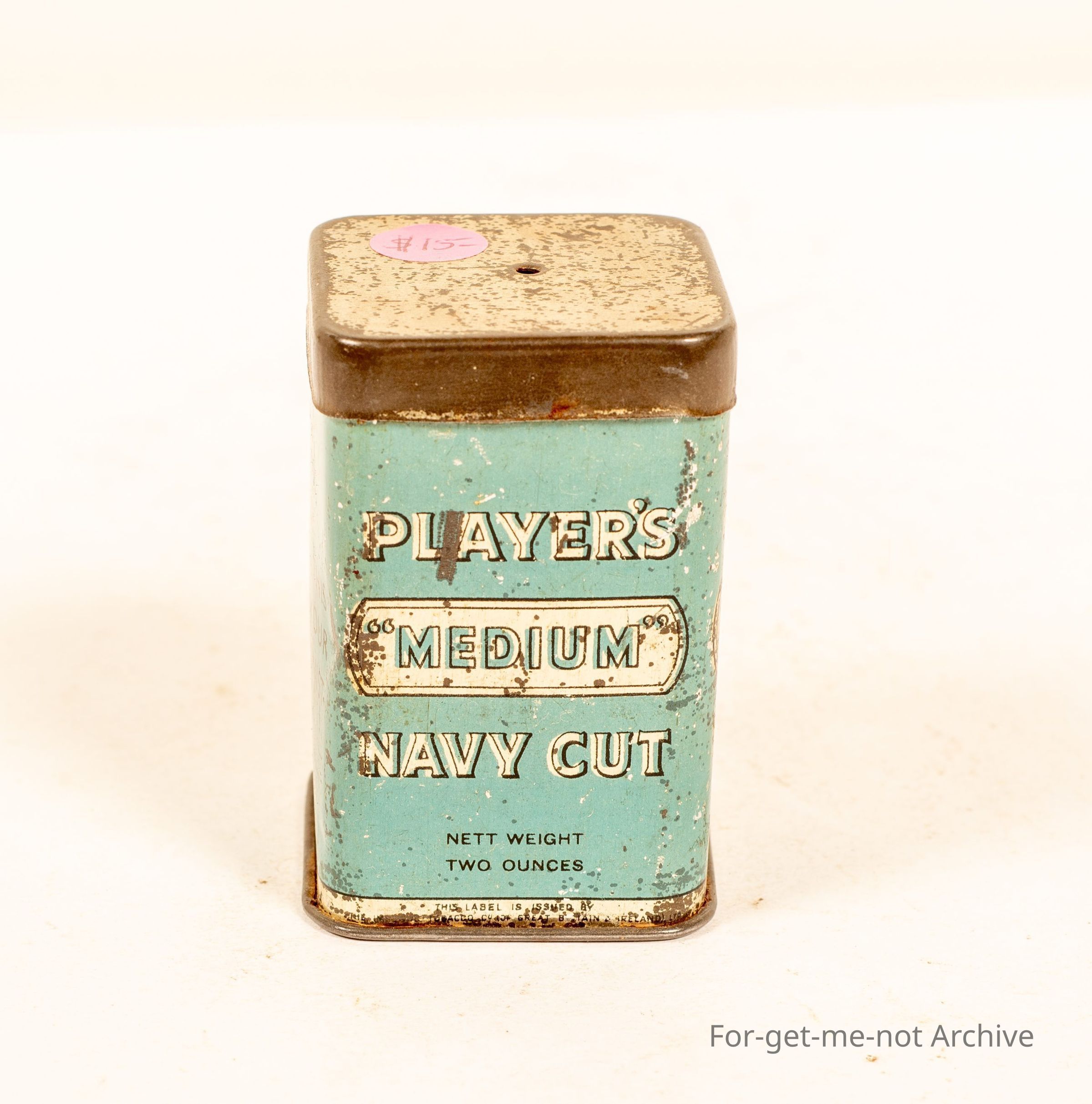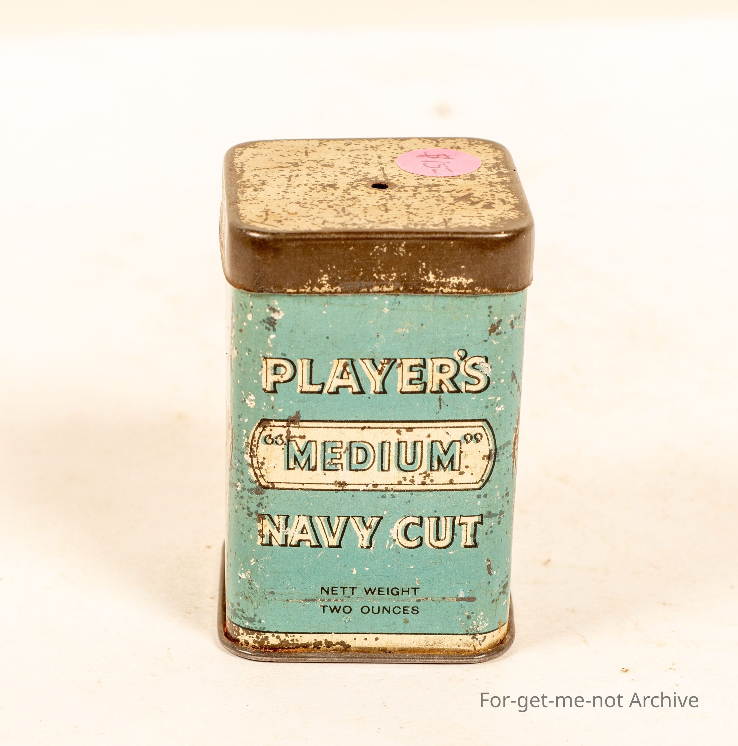 Players Medium Navy Cut, 2oz, little square compact tin, Please return this tin to your tobacconist written on tin, tin has vent holes in top and bottom