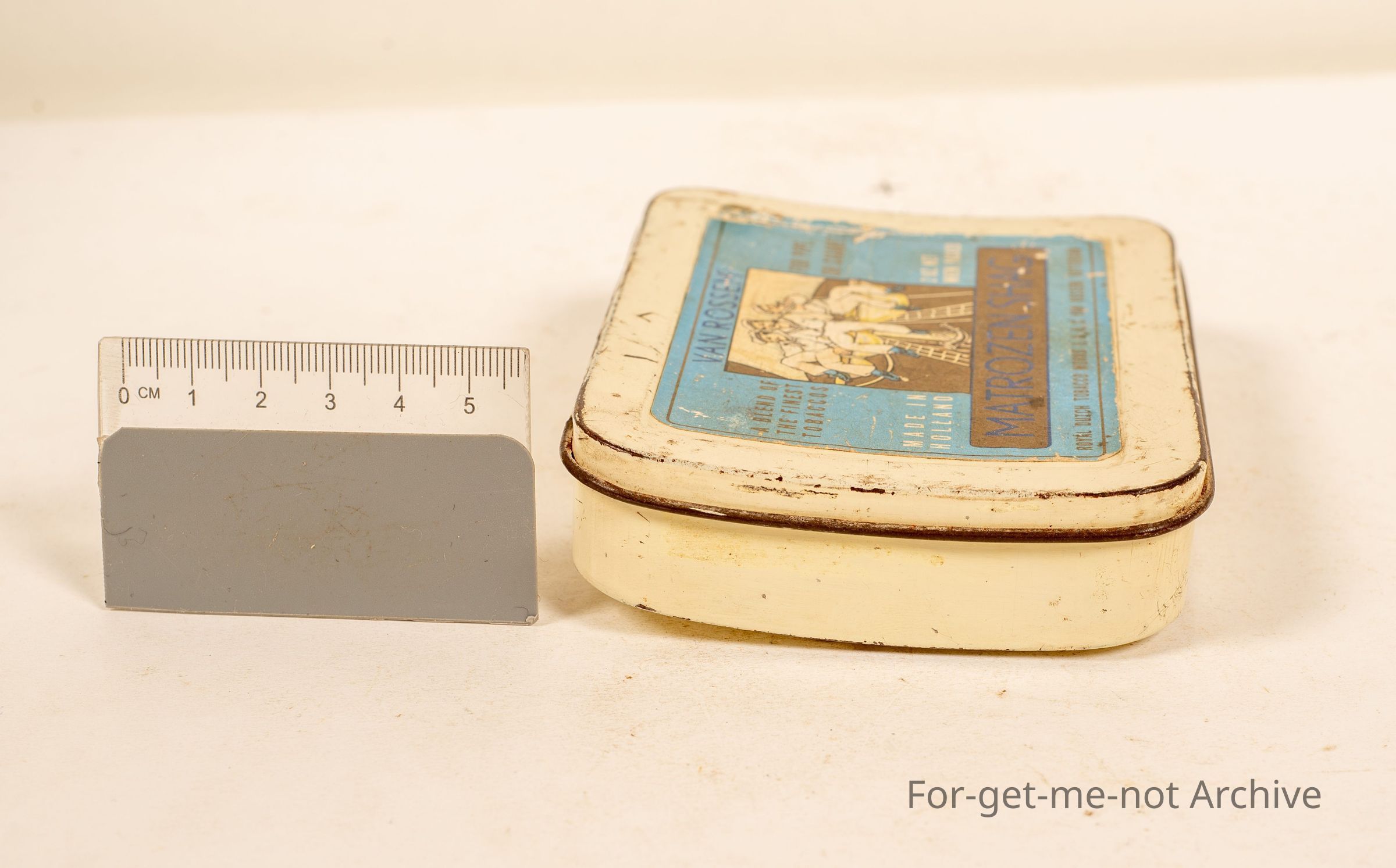 Van Rossens, Matrozen Shag. 2 ounces when packed. Made in Holland for pipe or cigarette. Pocket shaped curved tin,