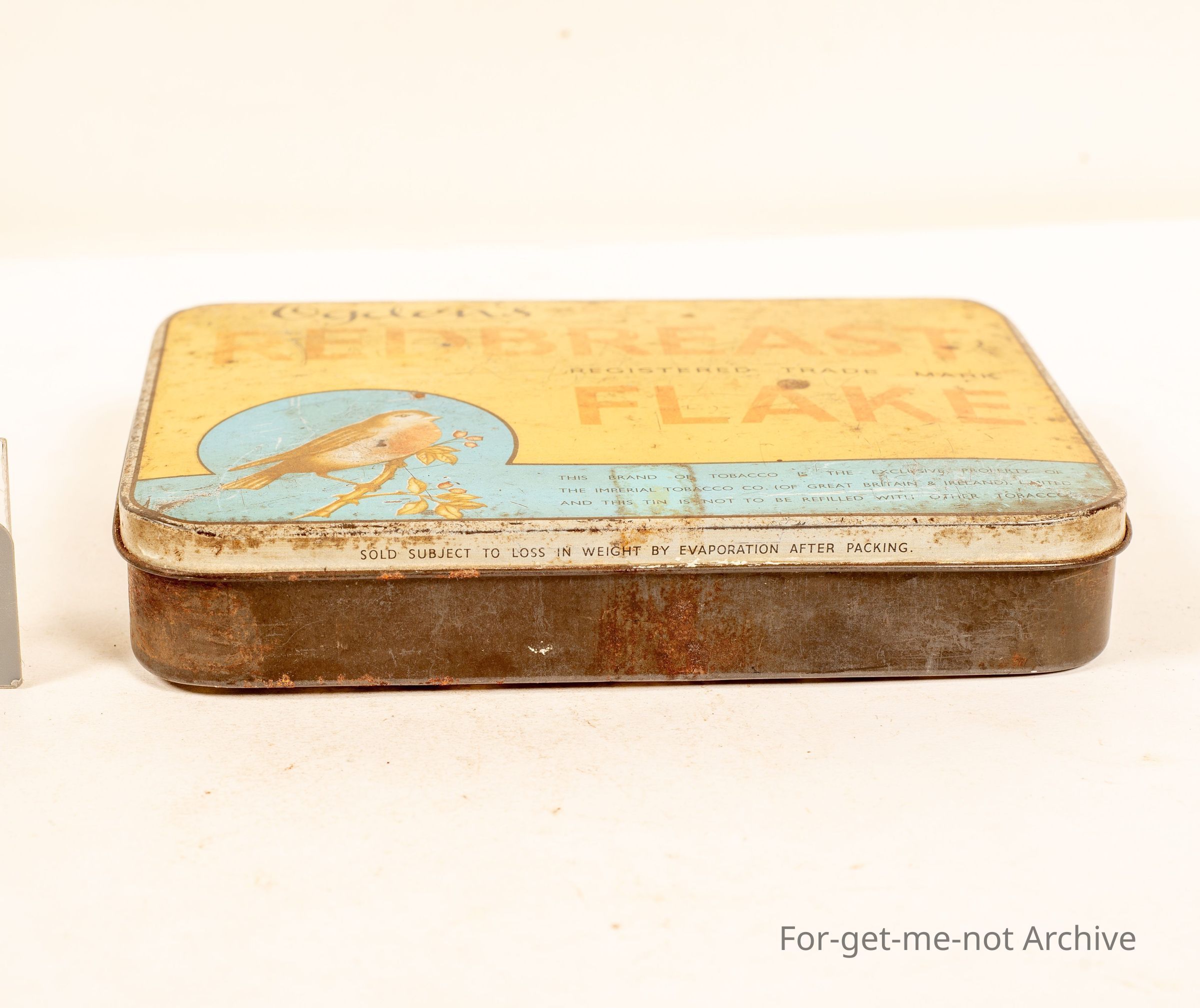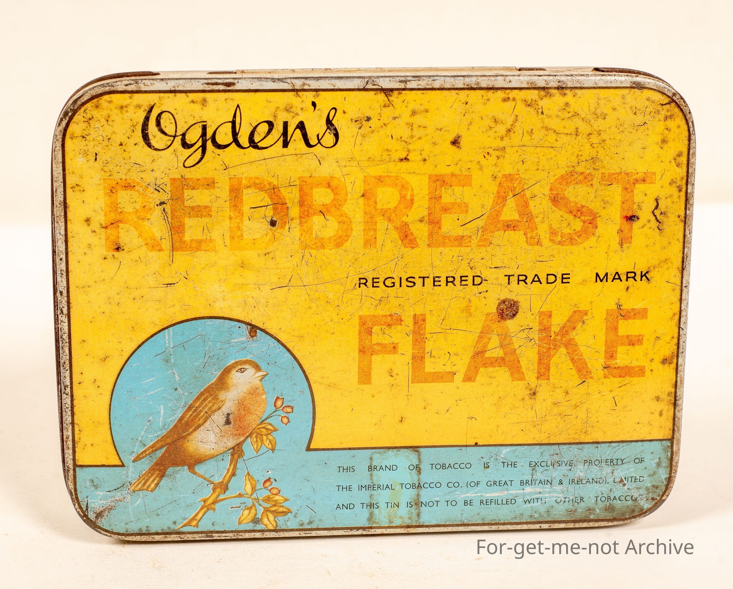 Ogden's Red Breast flake with an image of Robin Red Breast, pretty down in condition.1 pound tin with bulleting holes punched in the side.