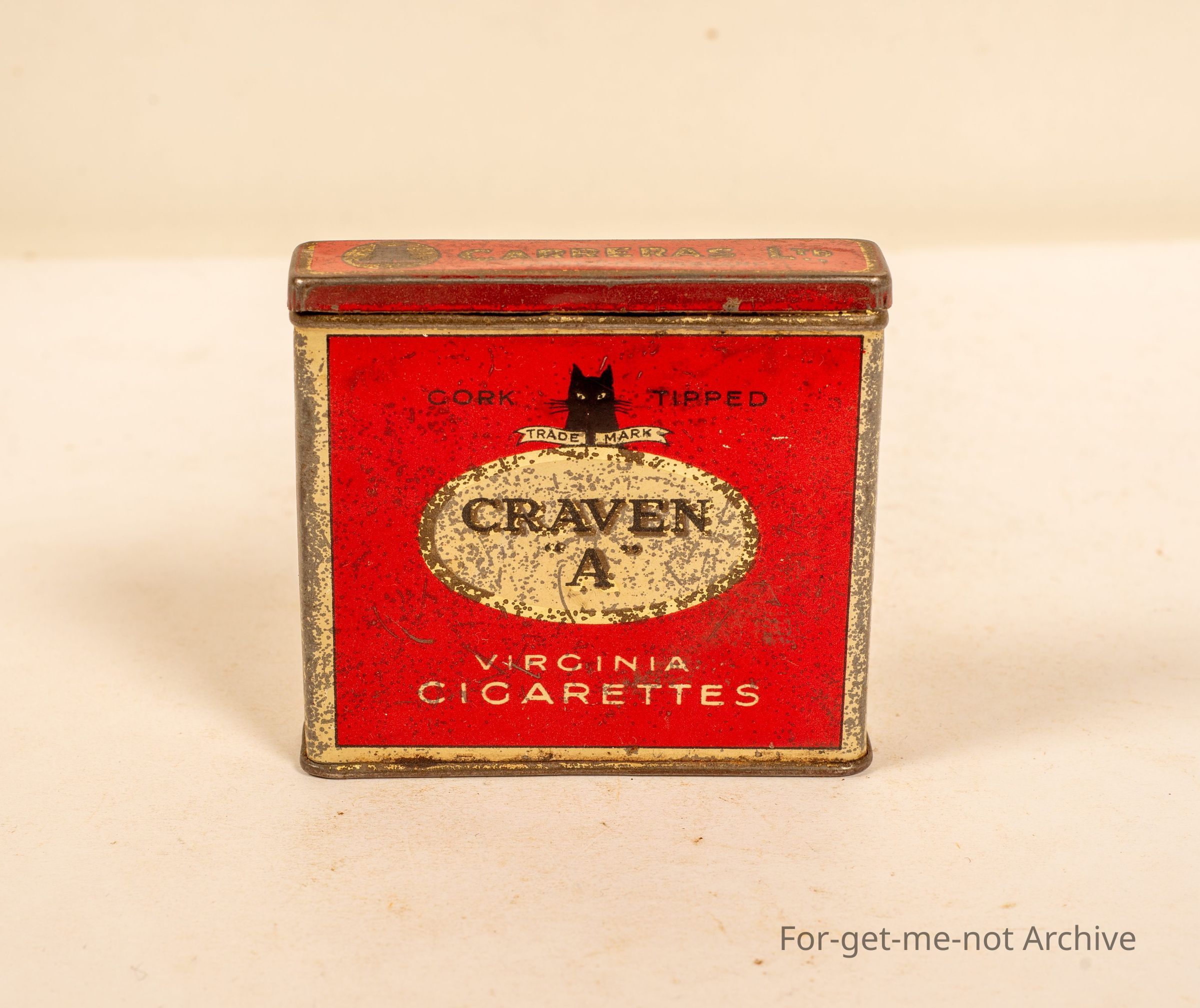A tin of Craven A Virginia Cigarettes, Carreras ltd London. Image of cat trade mark, Tin made by Barlow and sons London