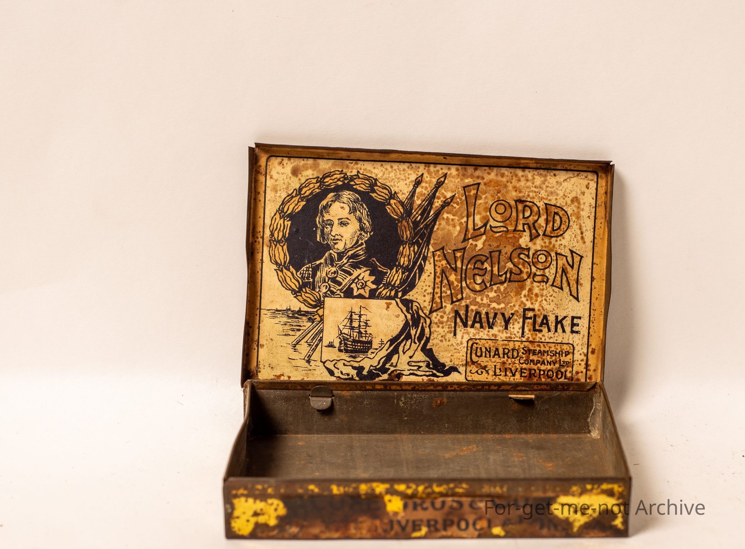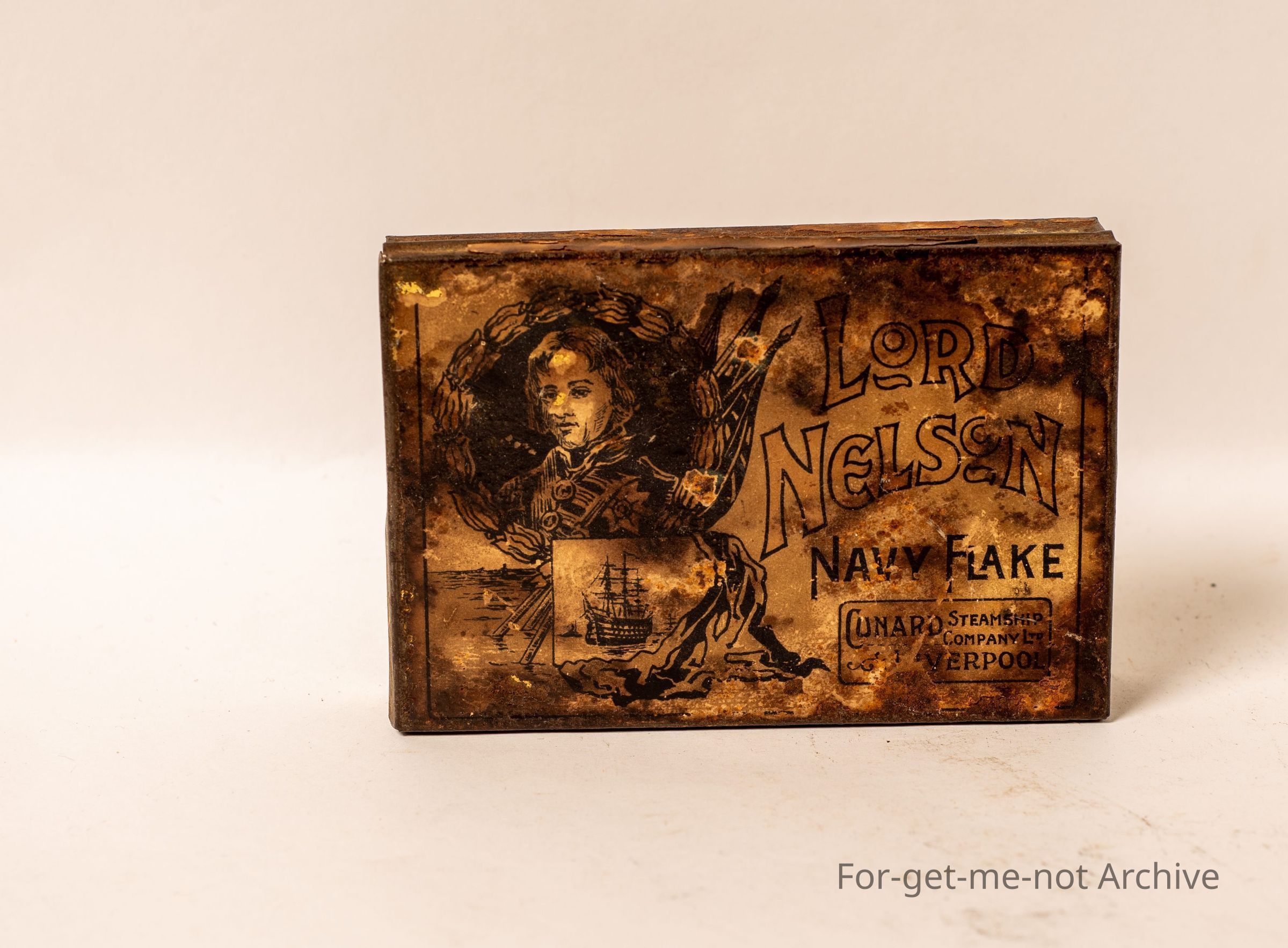 Paper labelled tin, very early, called Lord Nelson Navy Cut. This tin is from con Cunard Steamship Company, Liverpool, depicting a sailing ship. This is possibly very old. No further information on itCollection