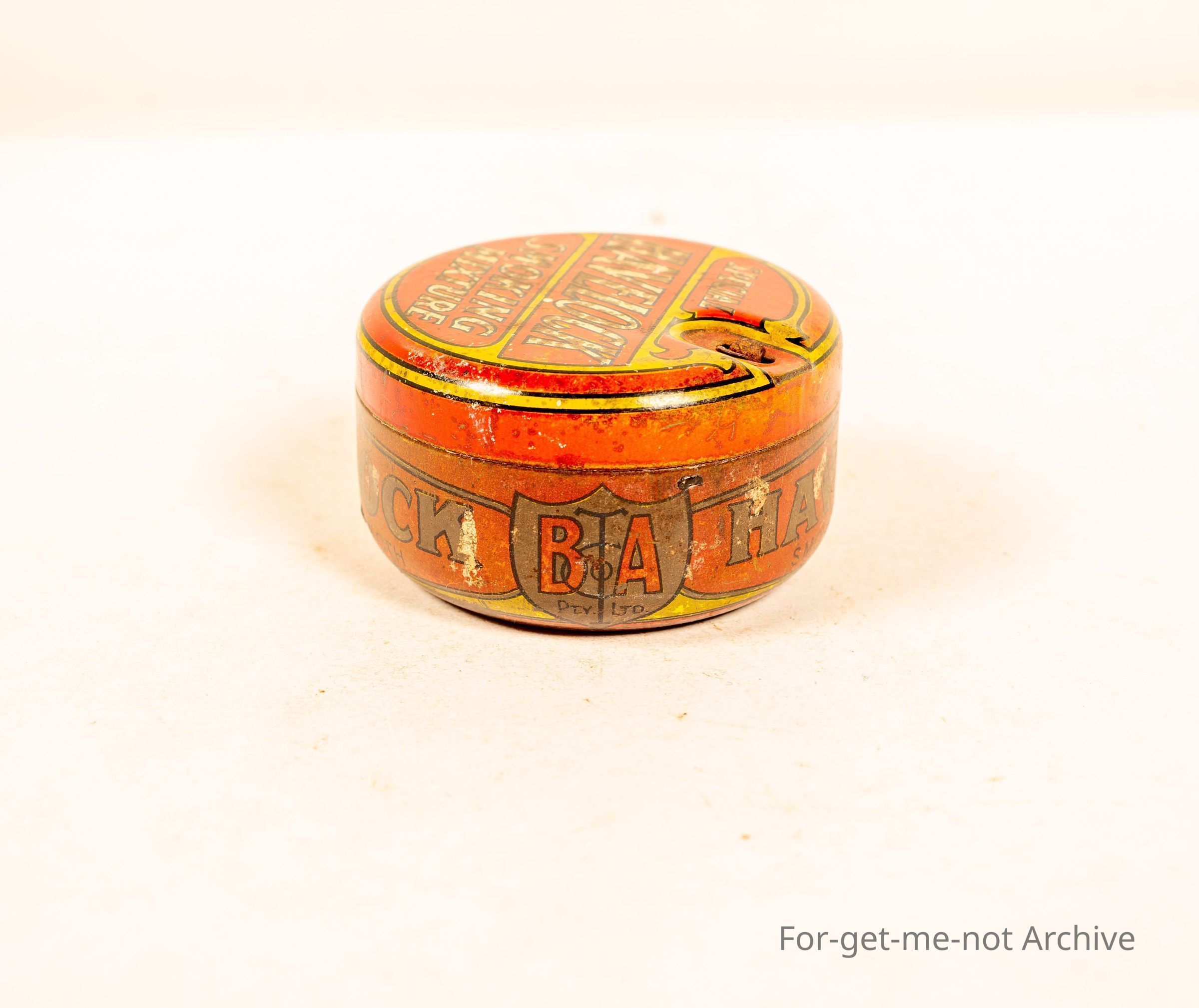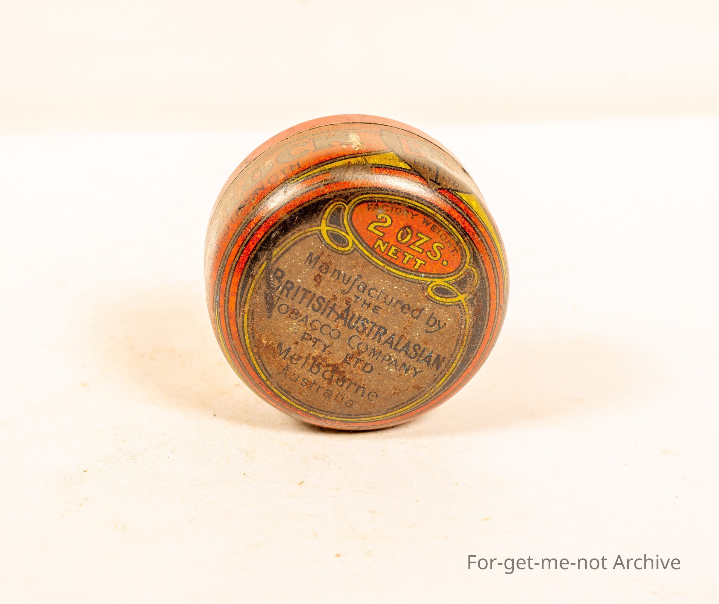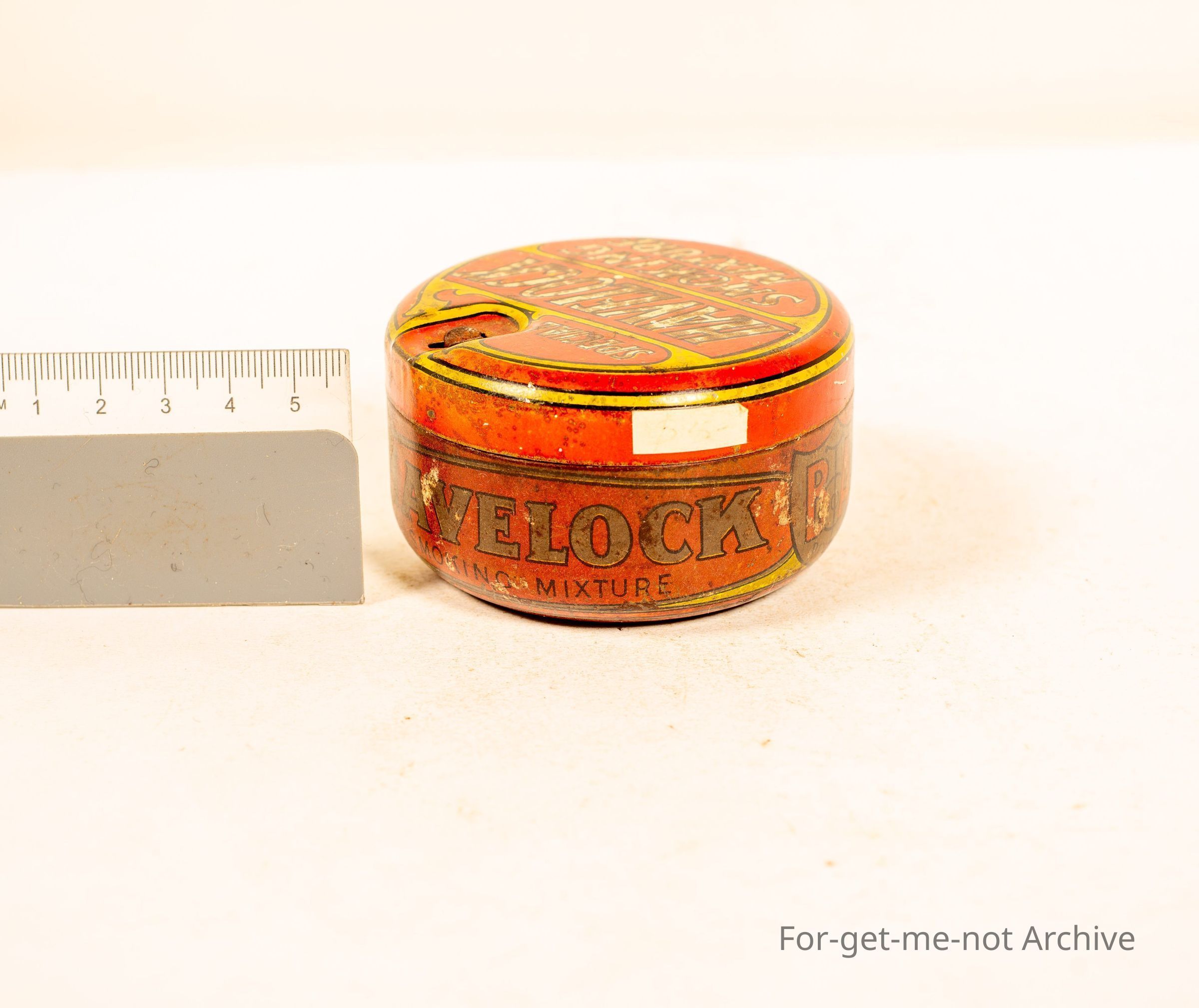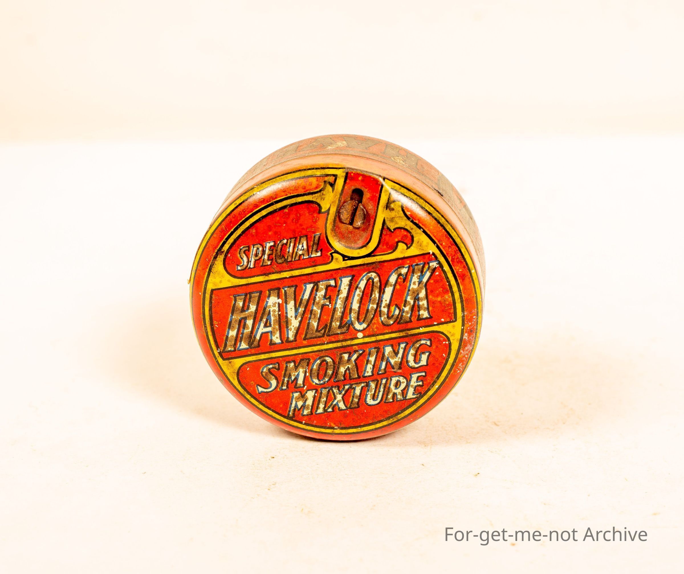 A round tin of special Havelock smoking mixture. Marsh and Son, makers of the tin Melbourne, unusual tin shape , would have been difficult to make