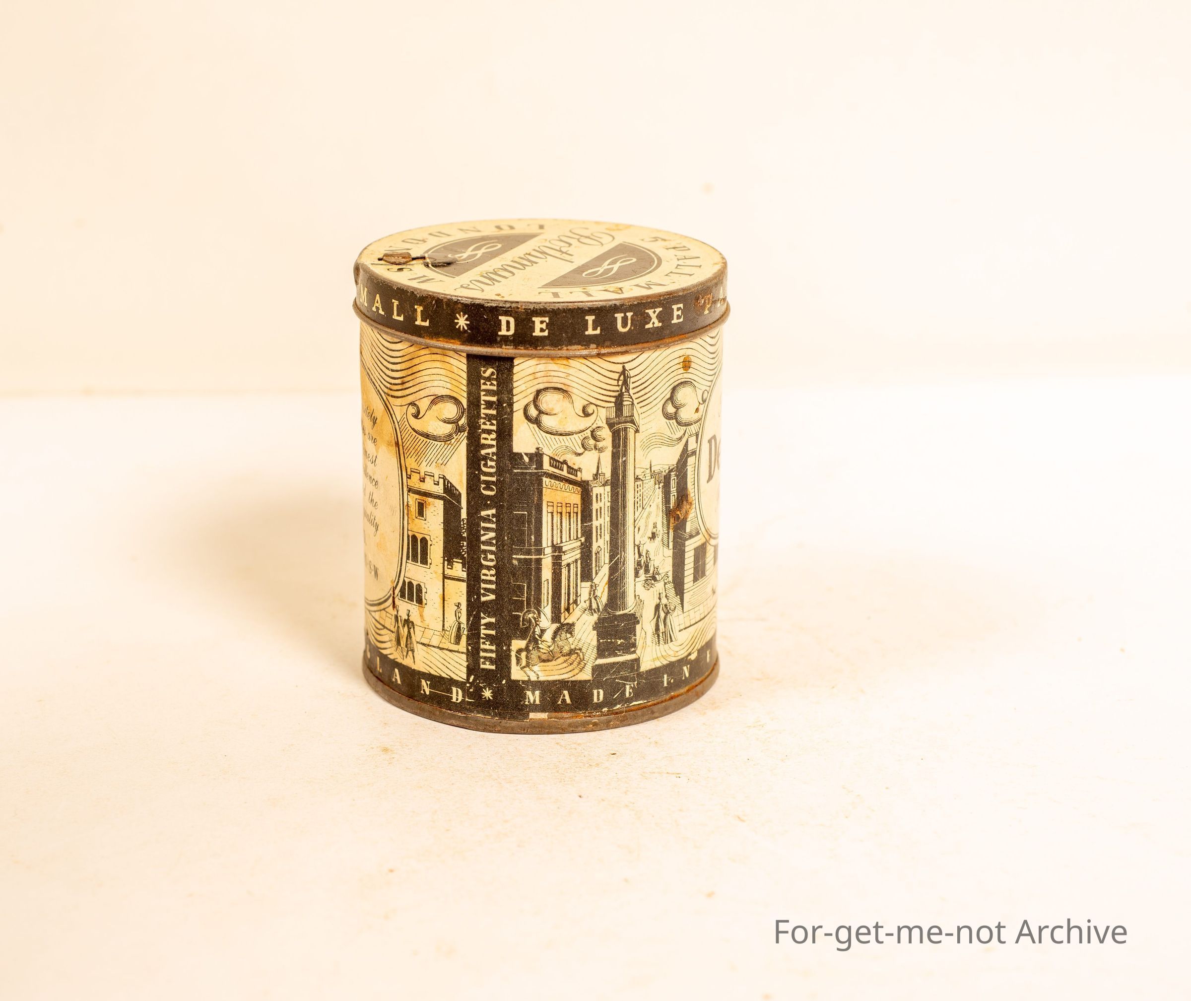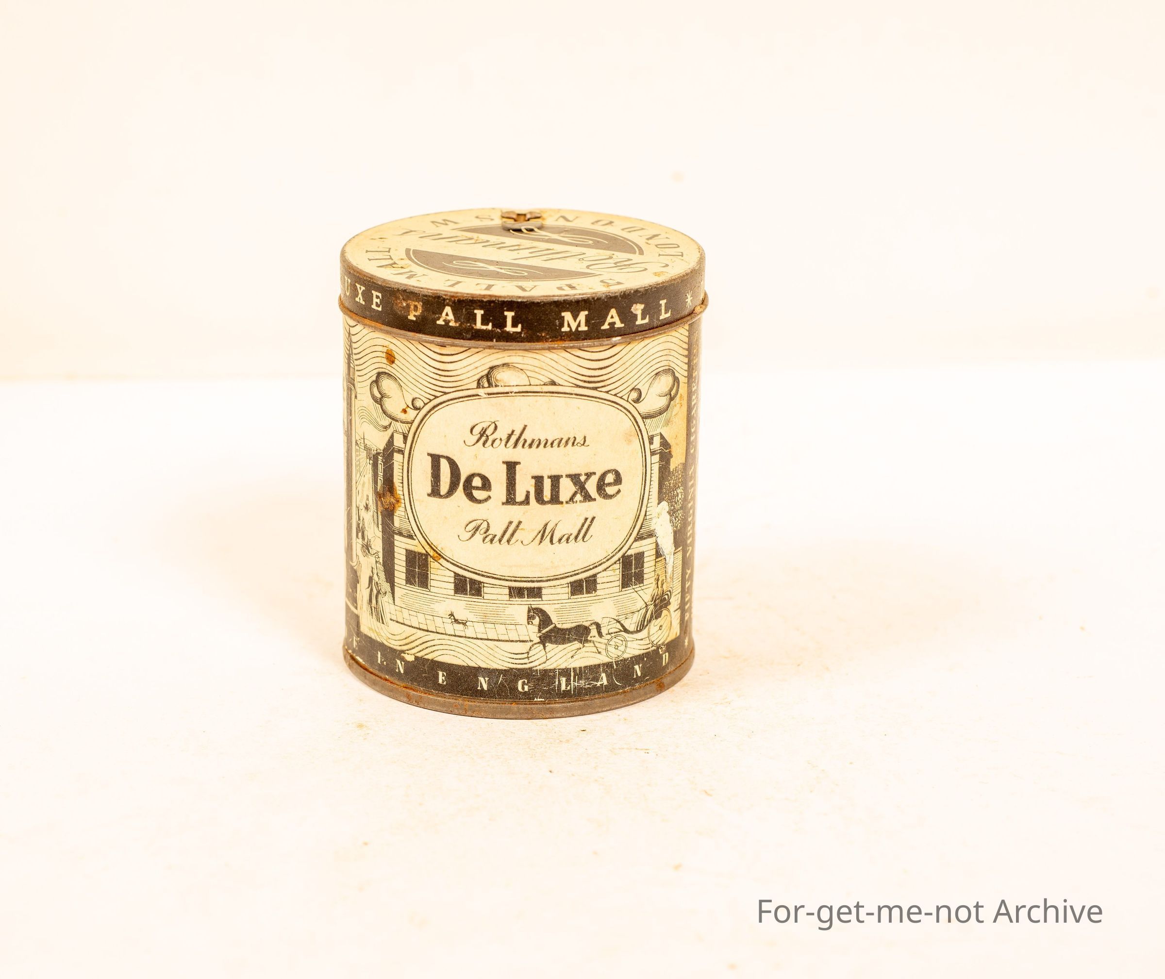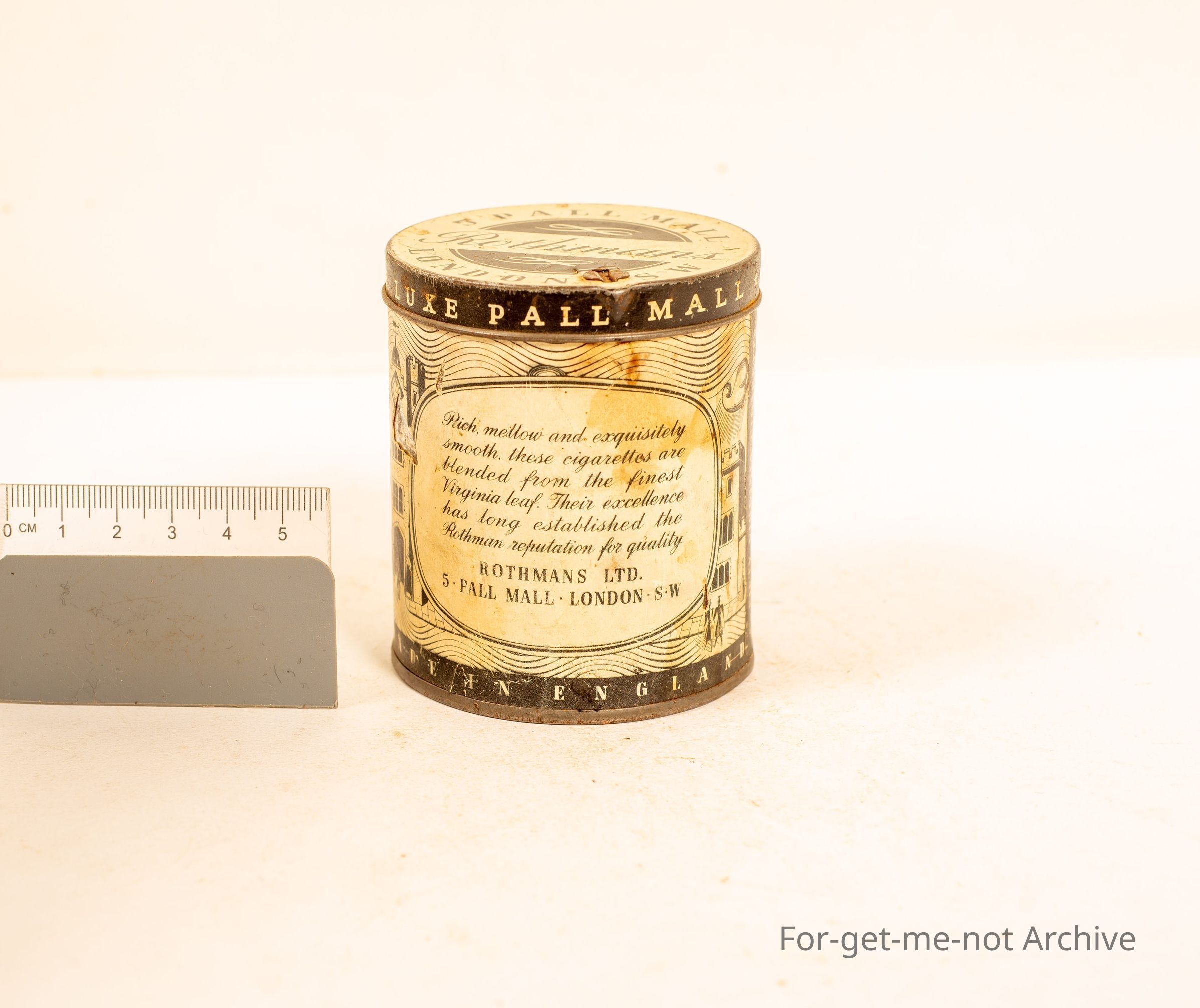 Rothman's Deluxe Pall Mall. Rich Mallow 5 Cornwall London. It's probably a 50 cigarette tin. Graphics all around