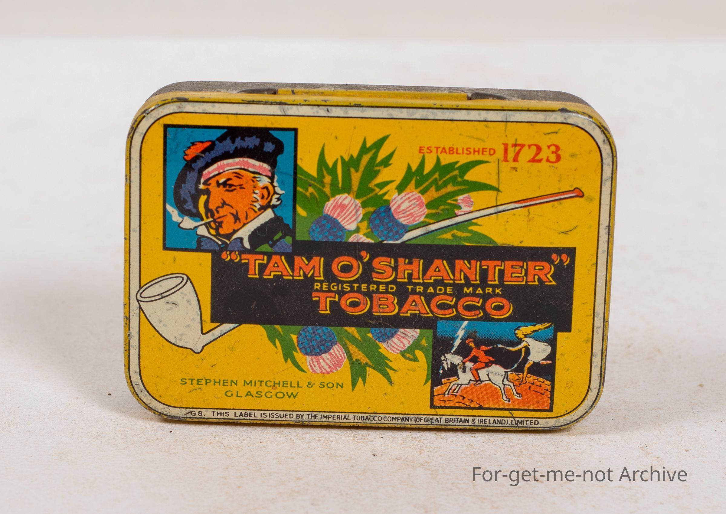 A Tam o' Shanter, Tobacco, beautiful graphics, Stephen Mitchell and Son, Glasgow, 2 ounce tin,