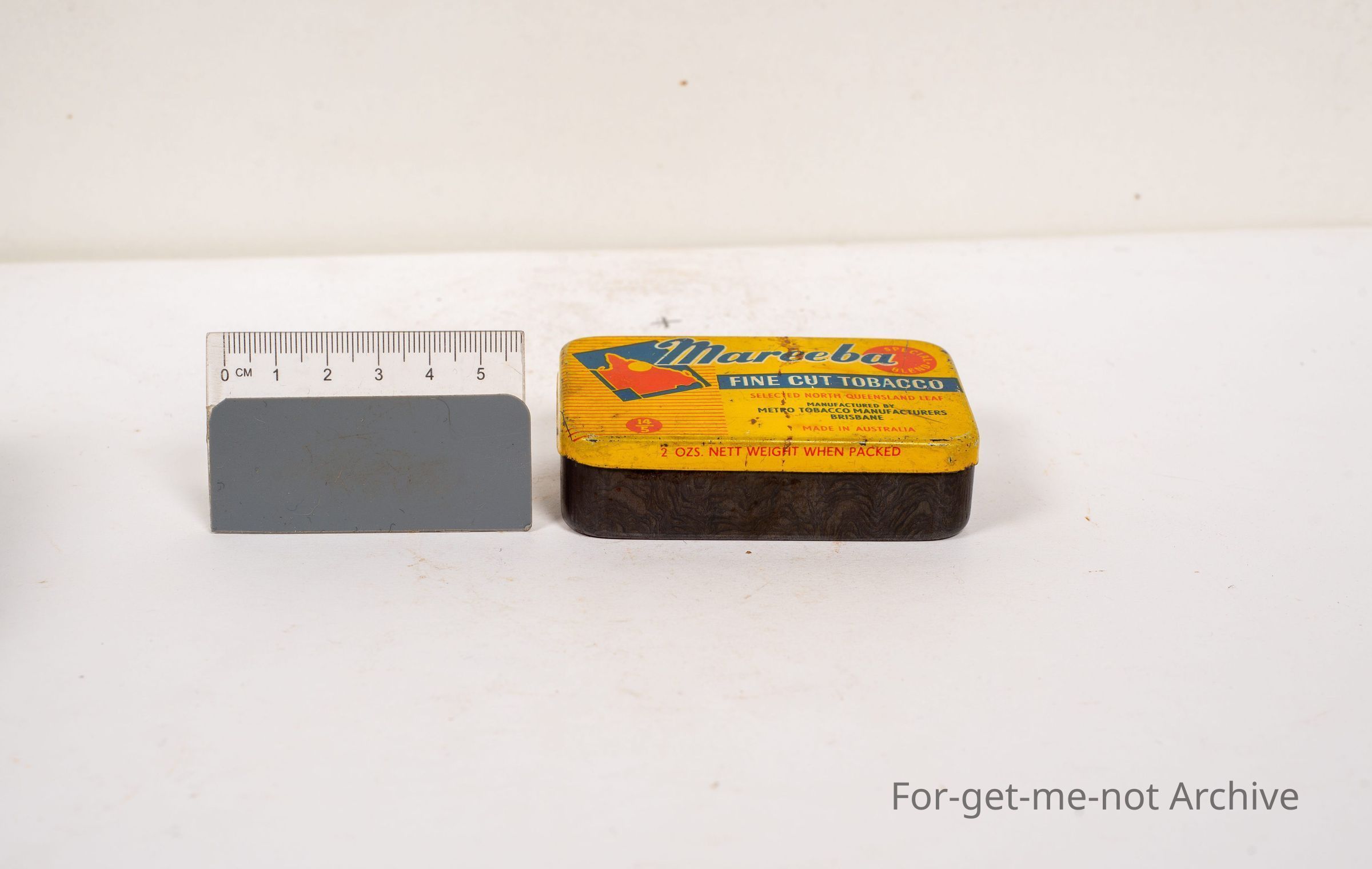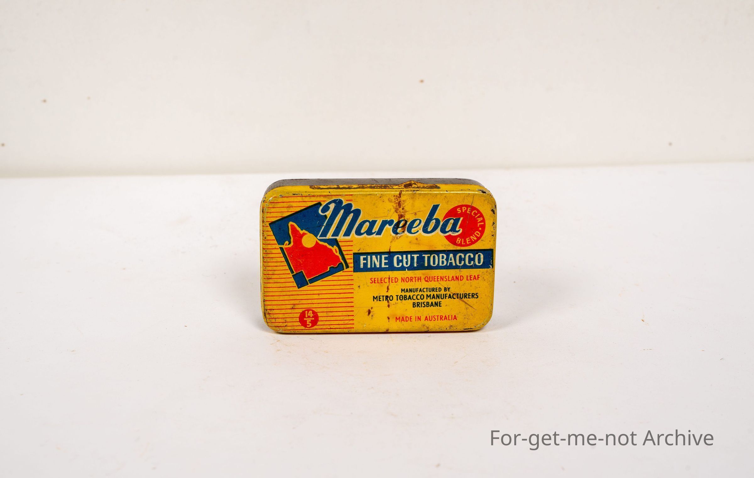 A tin of Mareeba Fine Cut Tobacco, manufactured by Metro Tobacco Manufacturers Brisbane. Selected North Queensland Leaf 2 ounce tin,