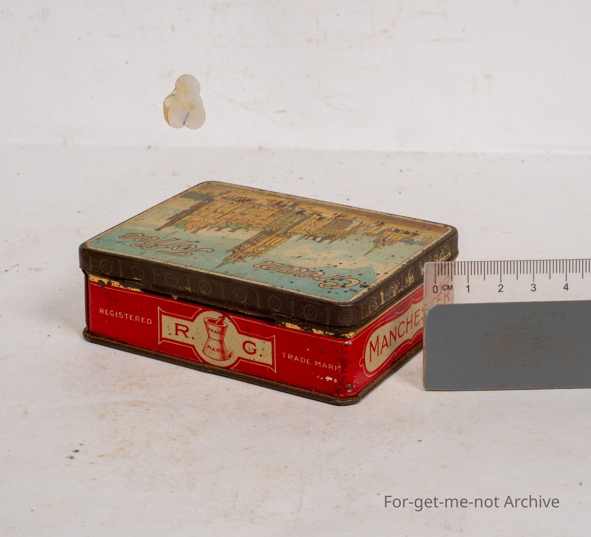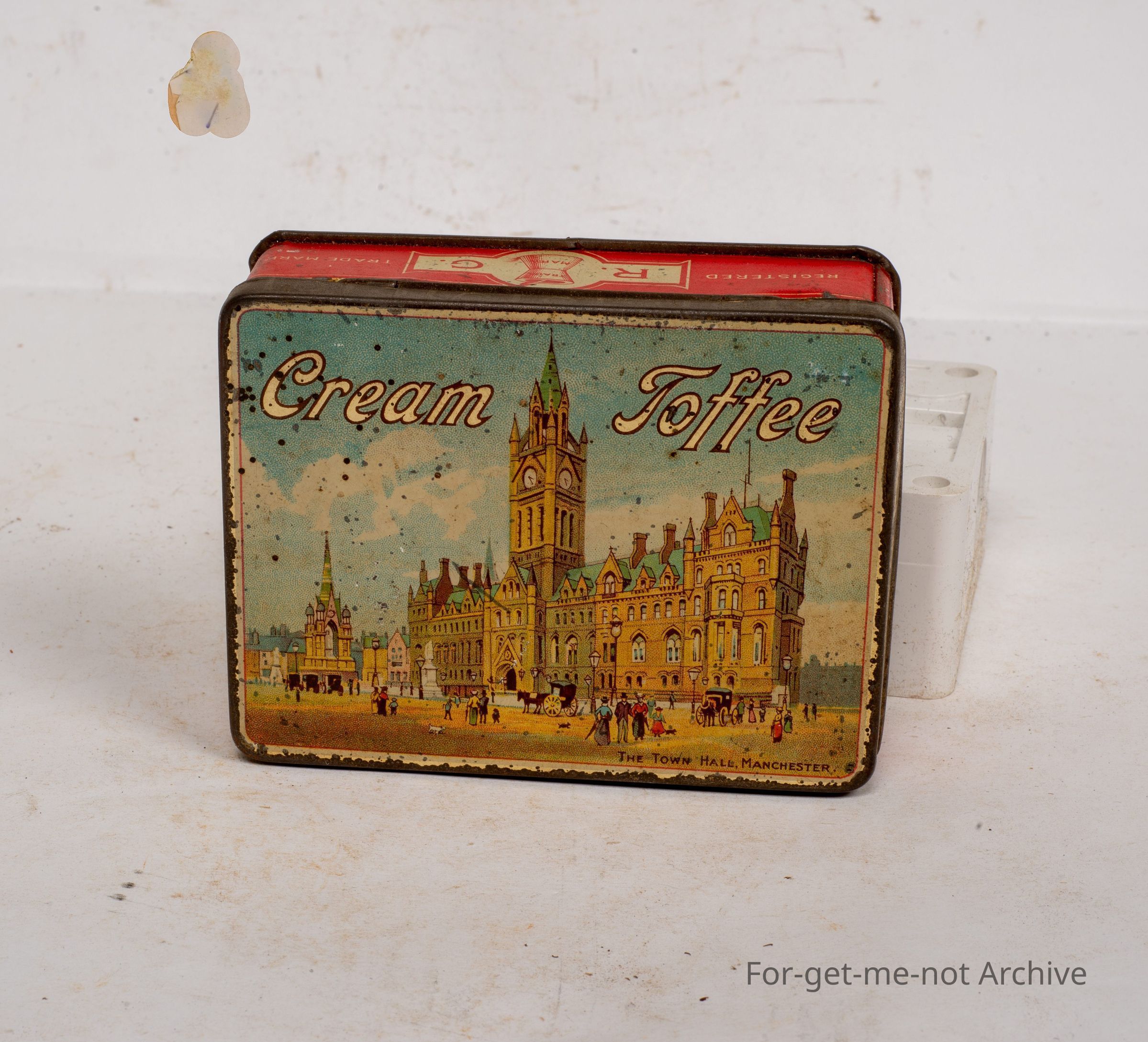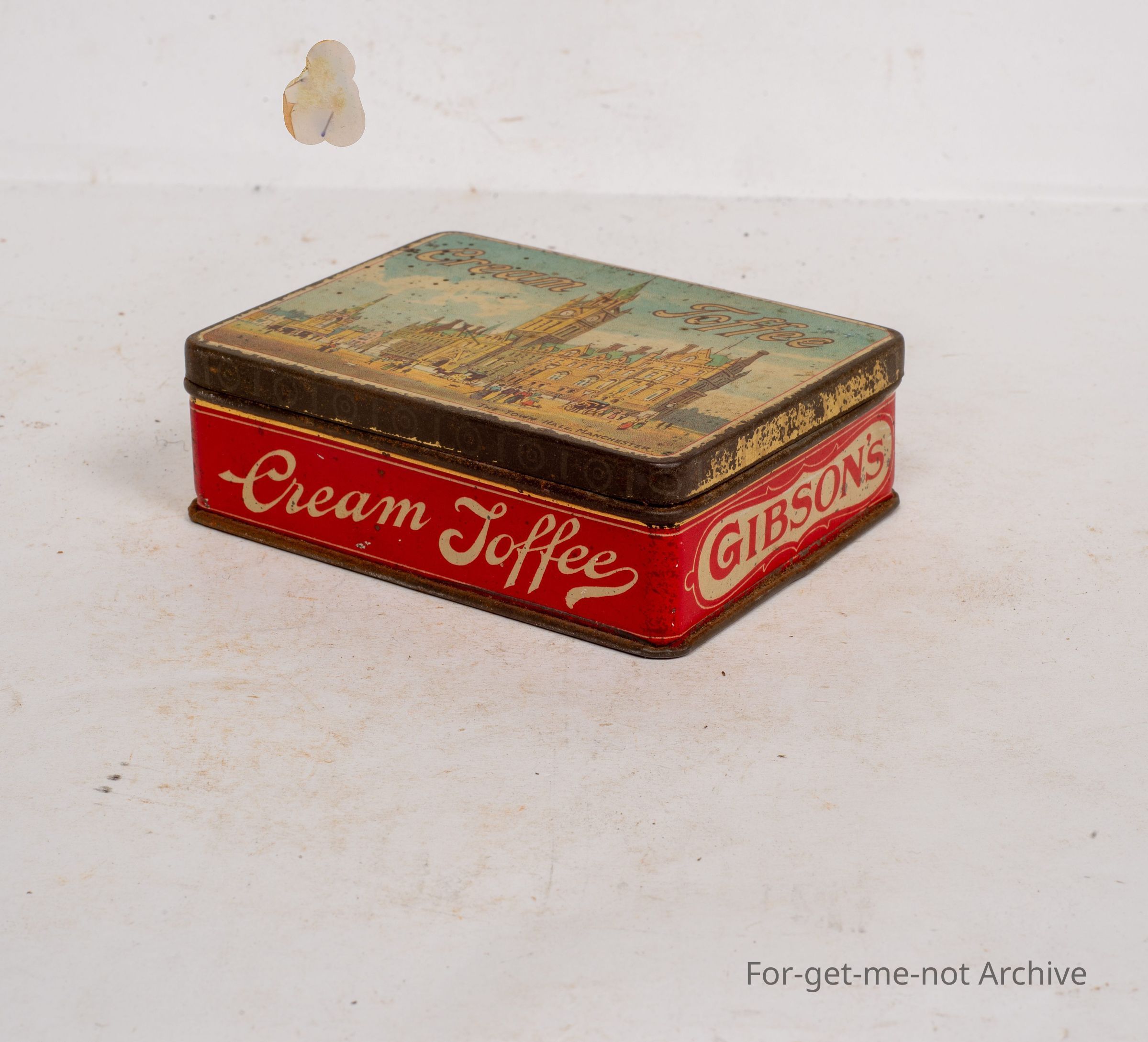 Is a, a toffee tin from Gibson's Cream Toffee Manchester. This tin is in pretty good nick, beautiful graphics of the Town Hall at Manchester in England. So it would go back to possibly 1900 or a bit after.Collection
