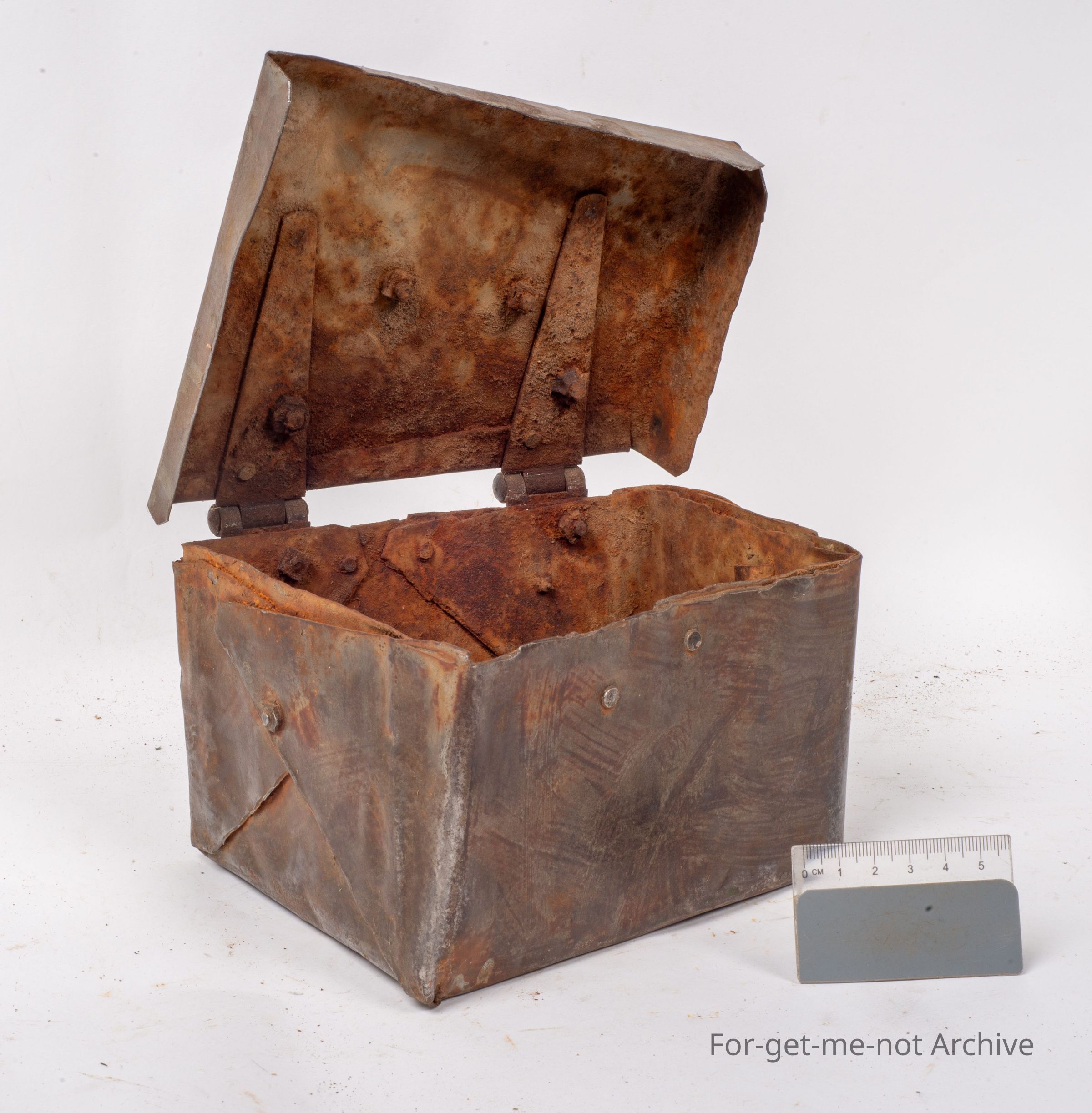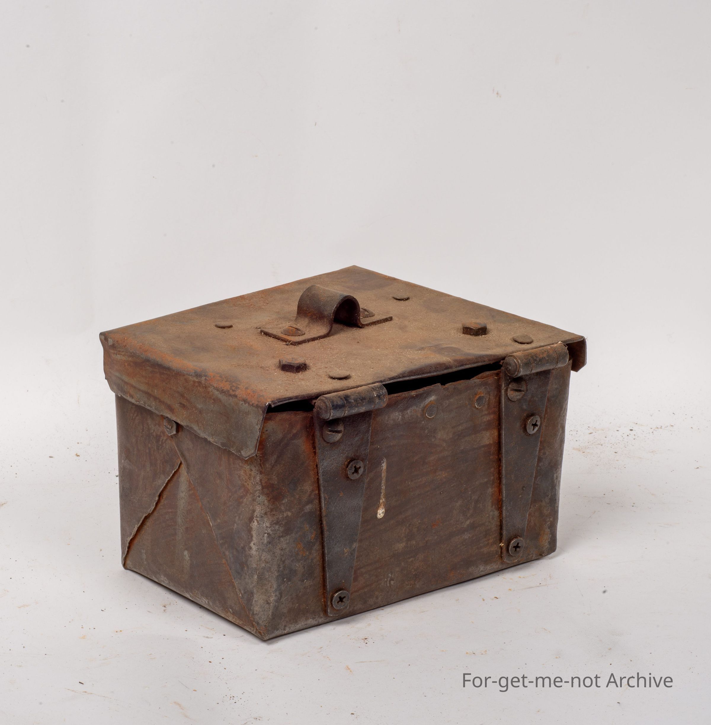 This is a homemade tin, toolbox, probably of some type as a piece of machinery. Very heavily built, sturdy hinges, the rest of it is riveted together. Quite crude but very solidly made.Collection
