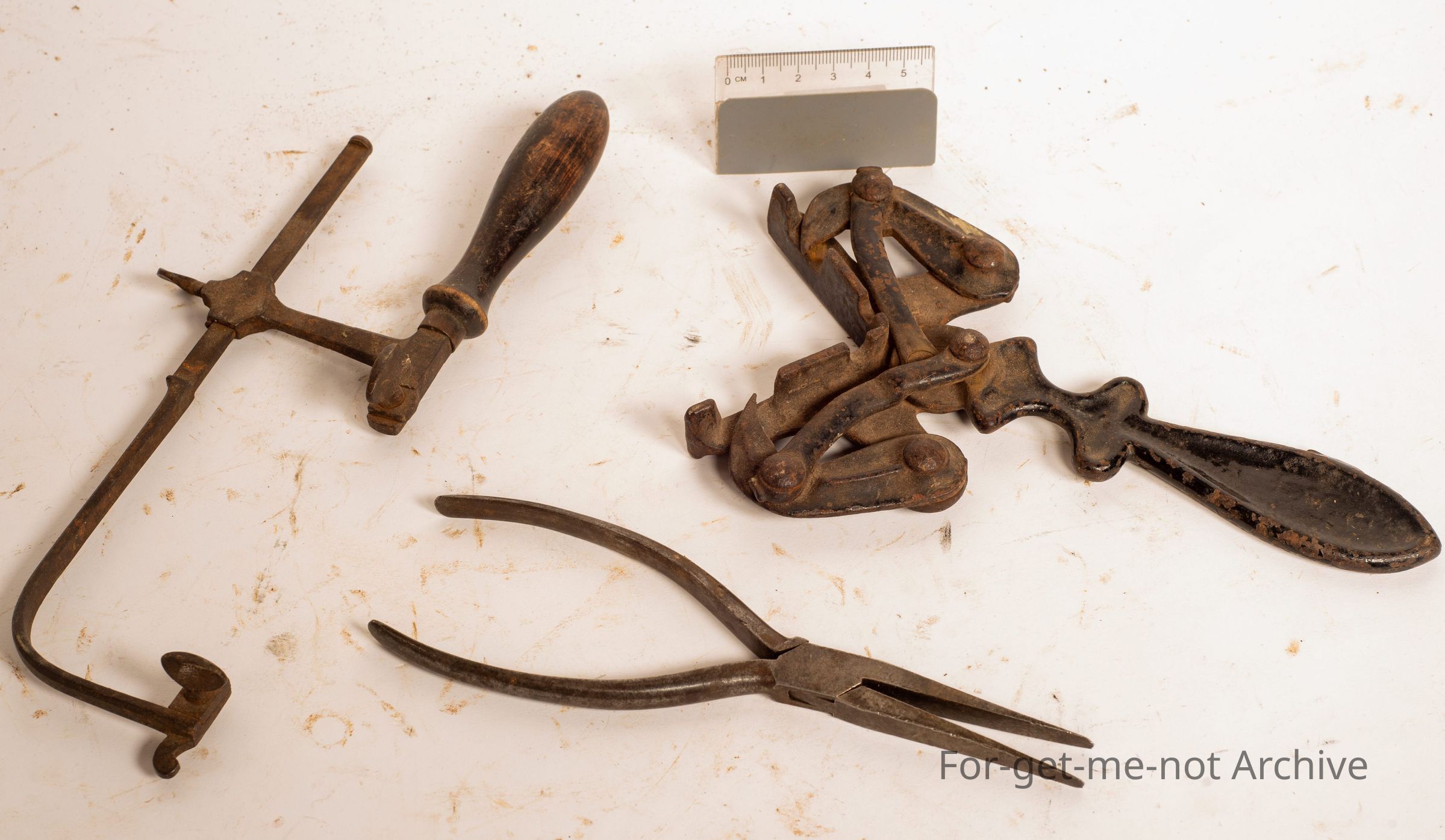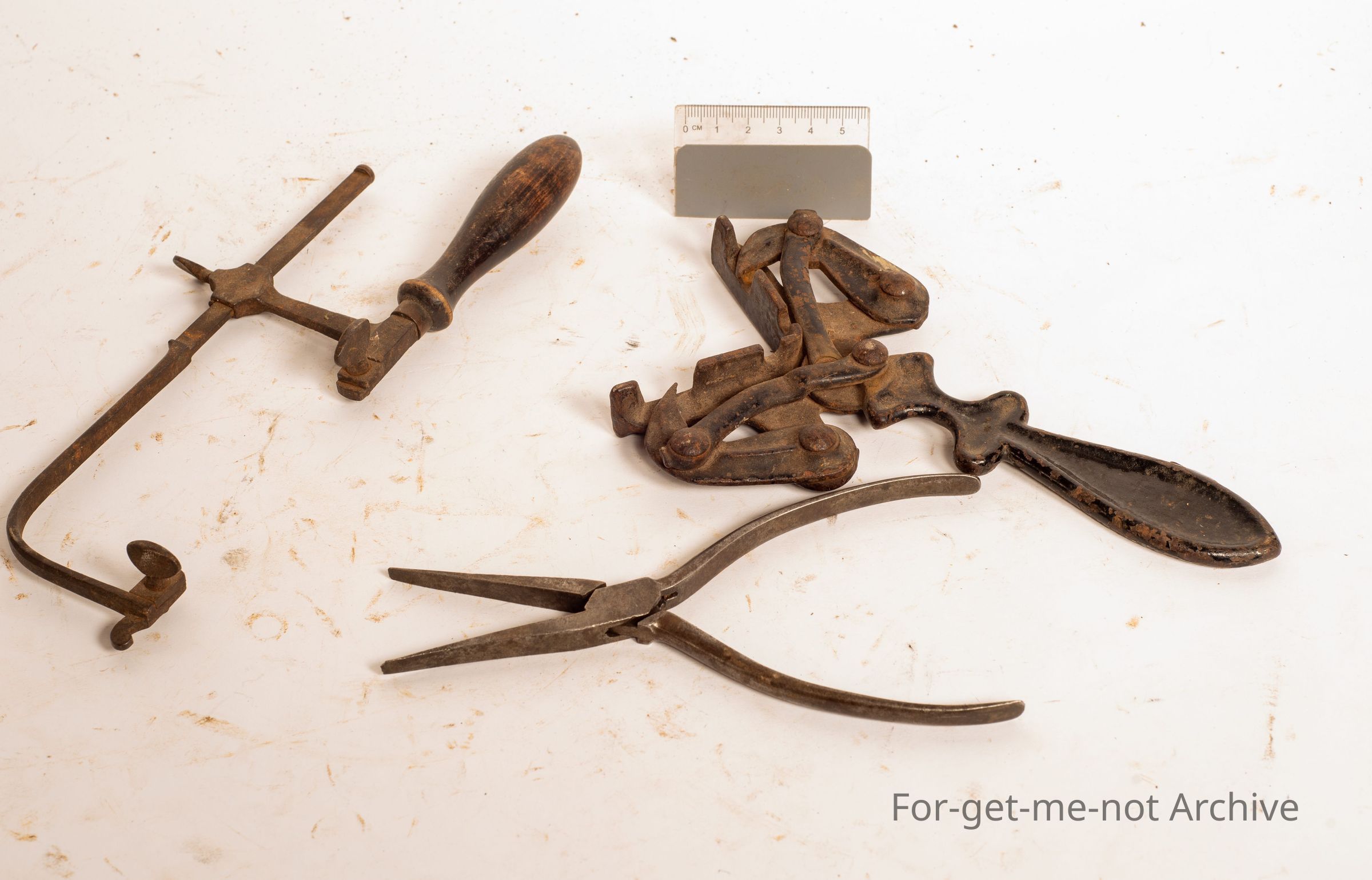 A group of 3 separate tools, rule tools category description. One is an unusual set of pliers. Another one is a picture framers, corner set. The third one is a jeweller's hacksaw,
