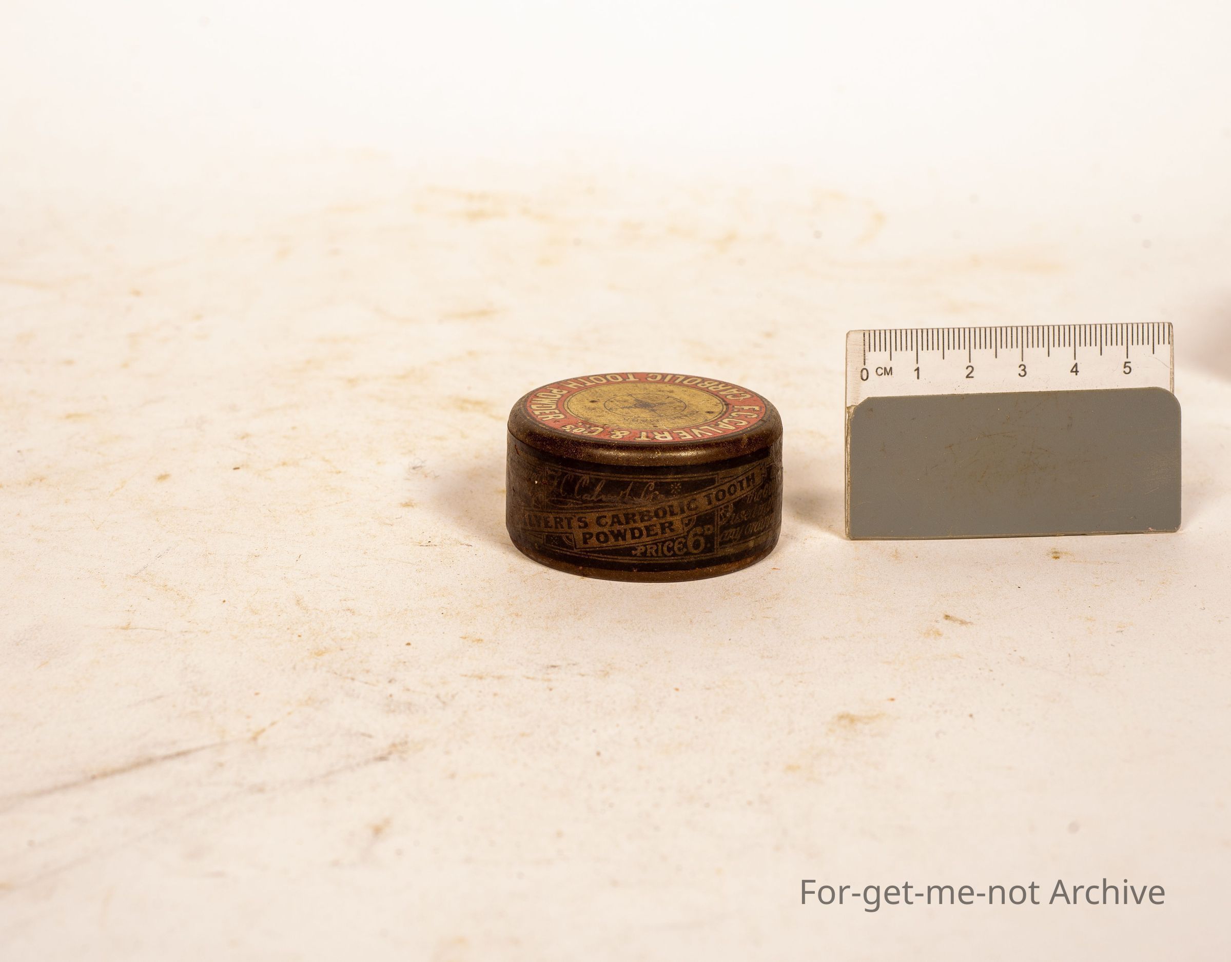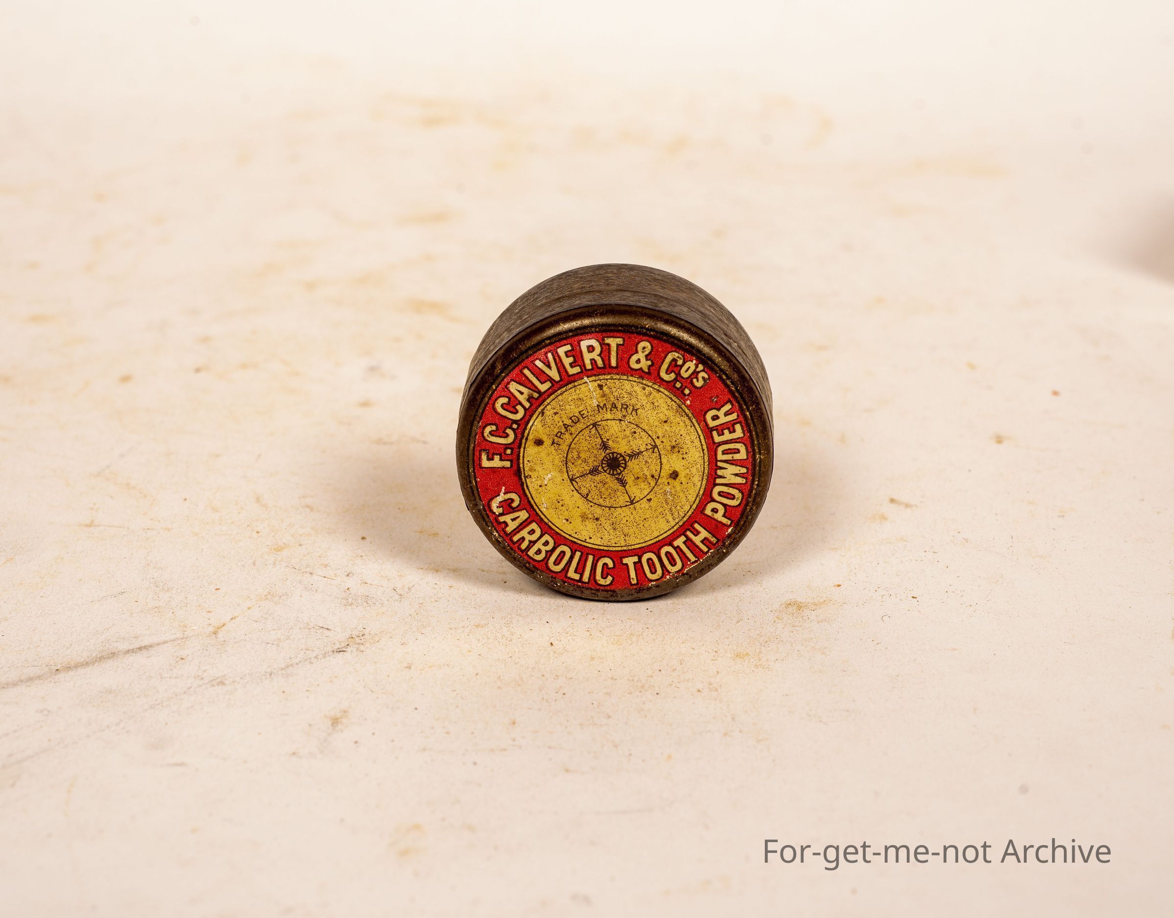 Is a tin of carbolic tooth powder by FC Calvert and Co. Lovely little tin. Lots of graphics around the outside which is barely readable.