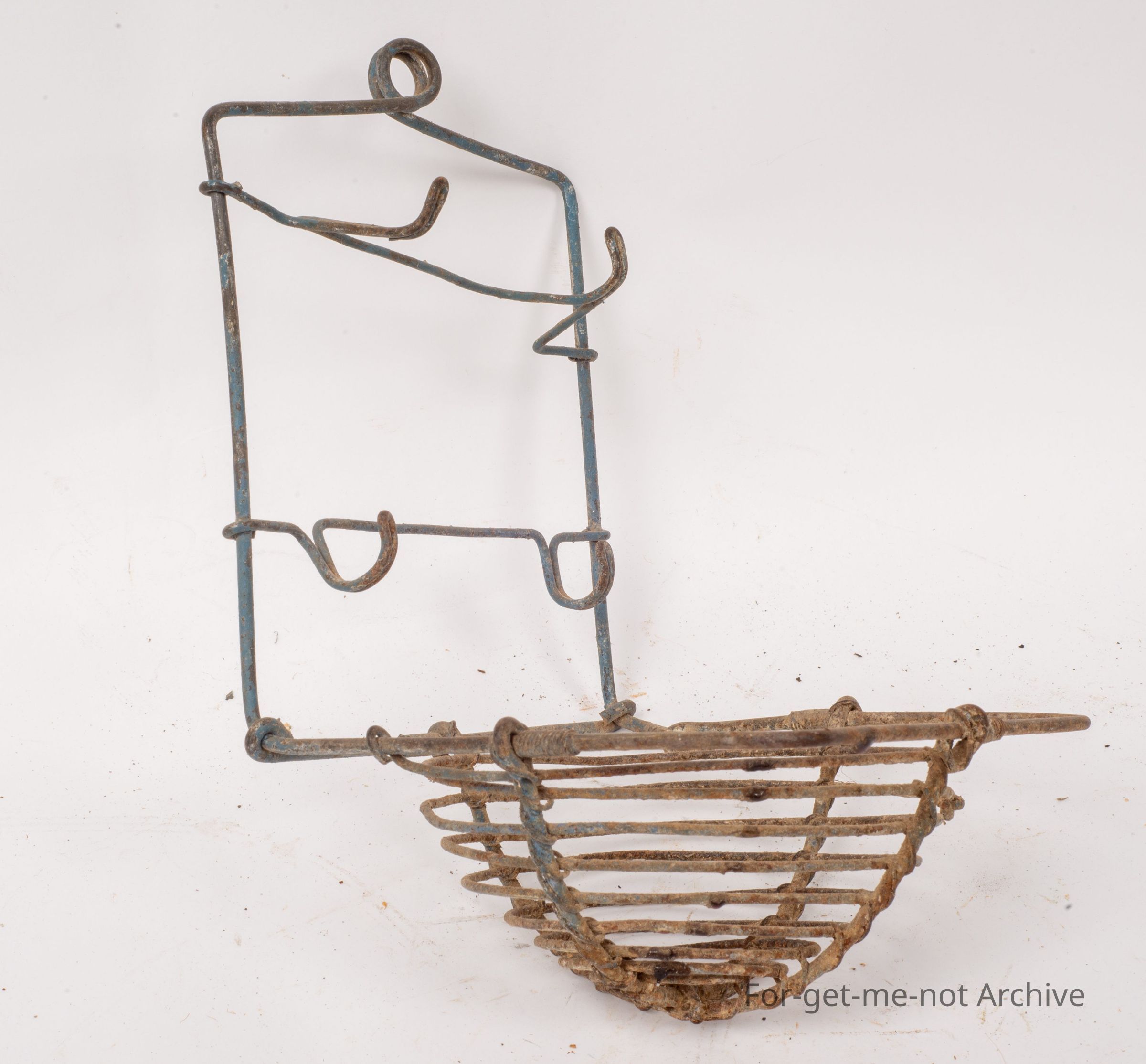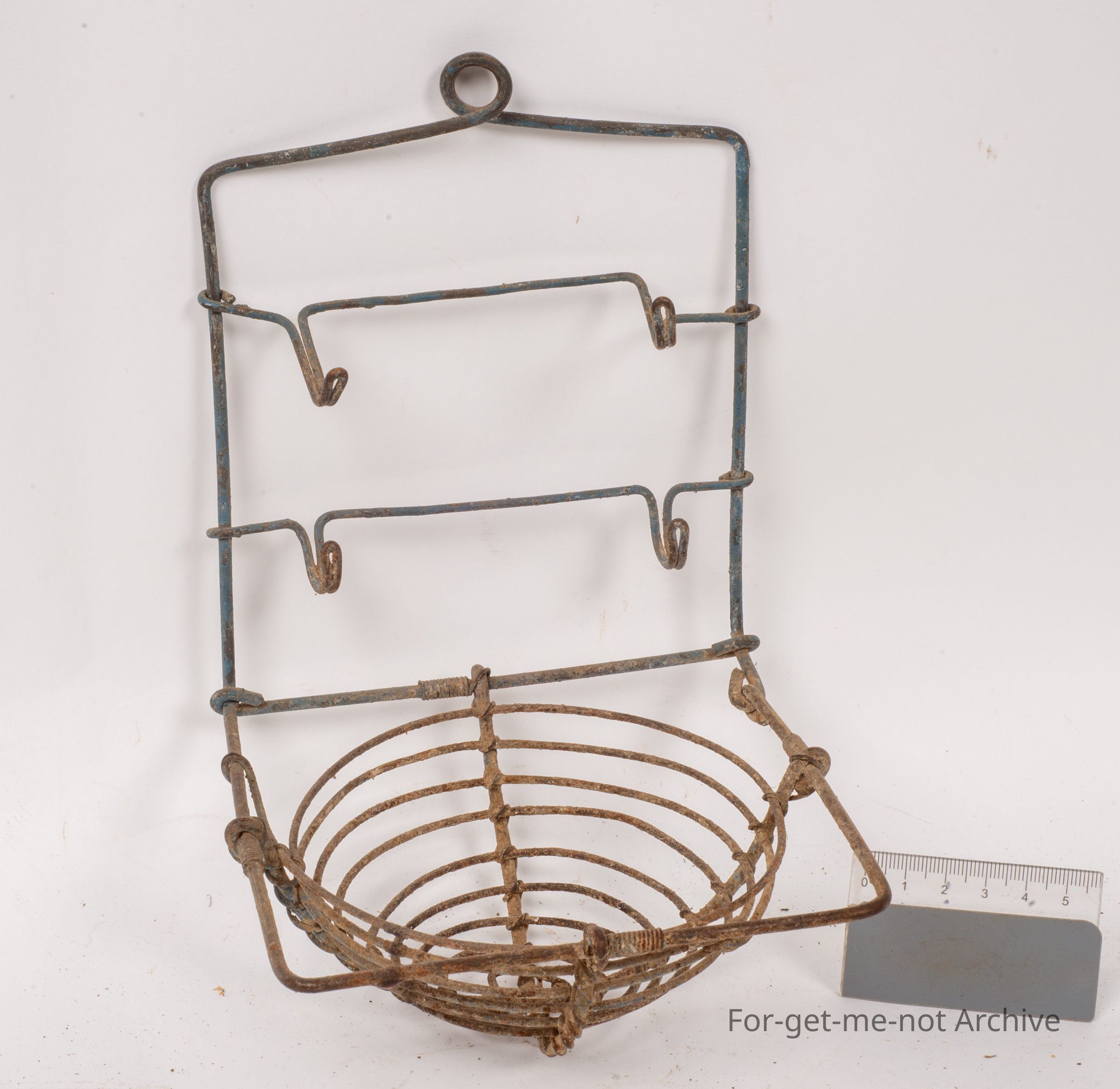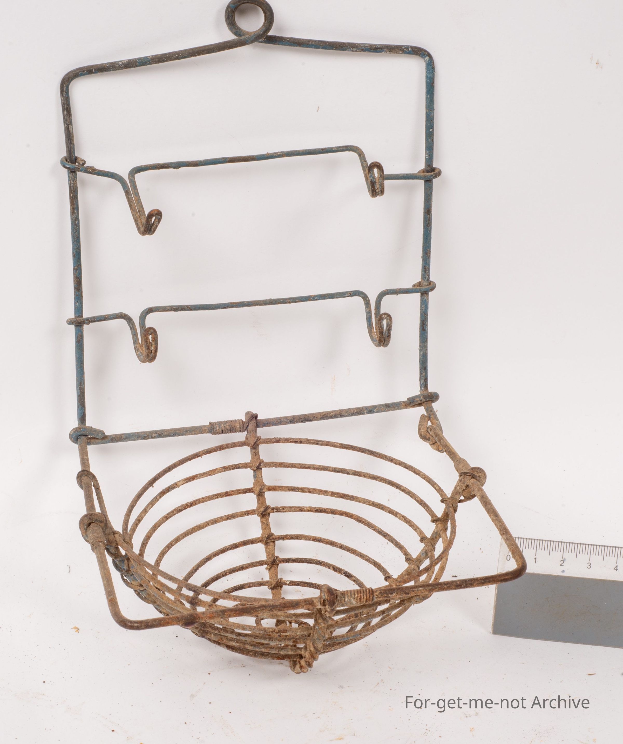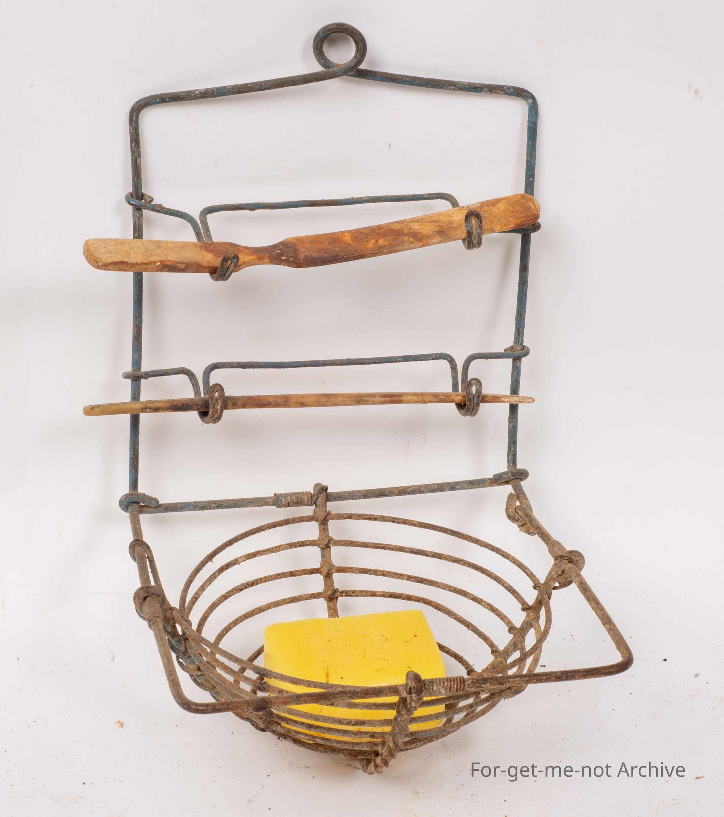 This is a lovely early piece of wire work. Once again, a bathroom piece. Two bone handled toothbrushes in pretty down condition. Piece of velvet soap in the red thing. All handmade. Very similar to the last one, but this one is a second one.Collection