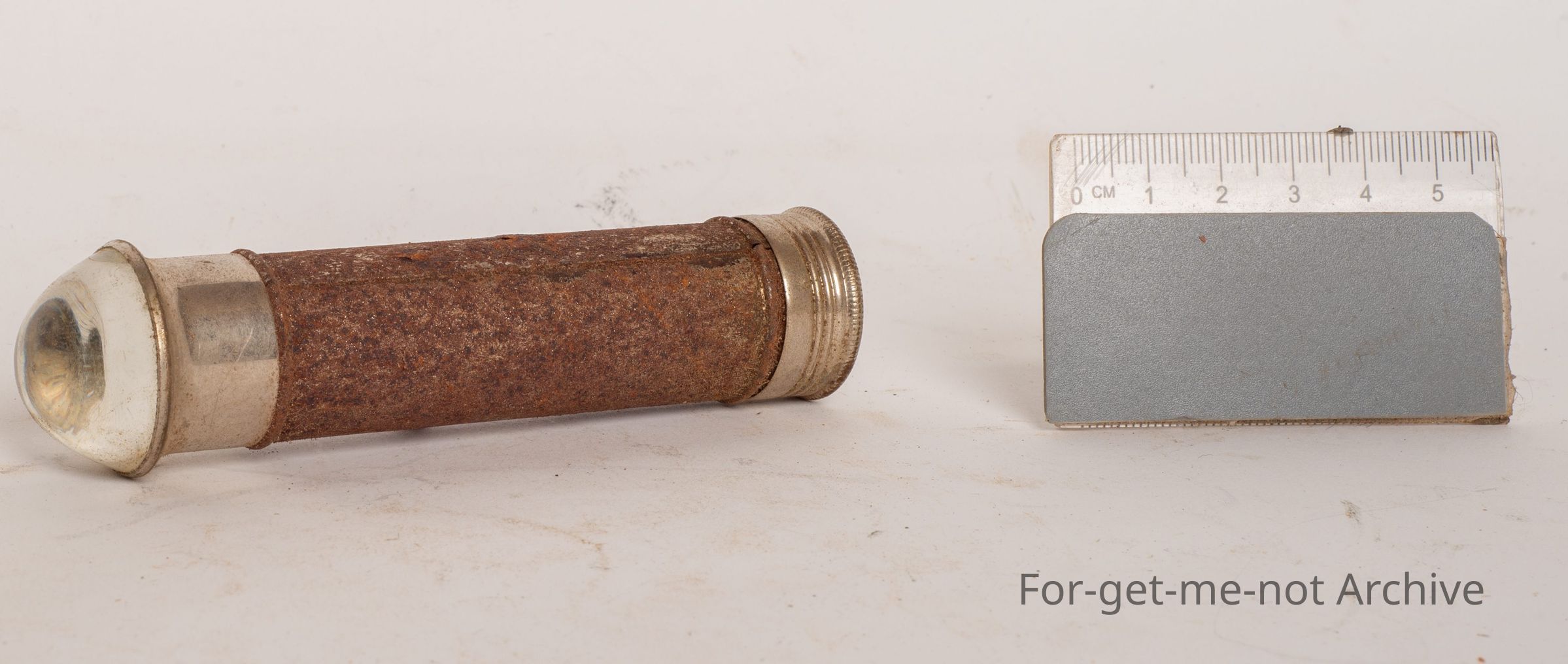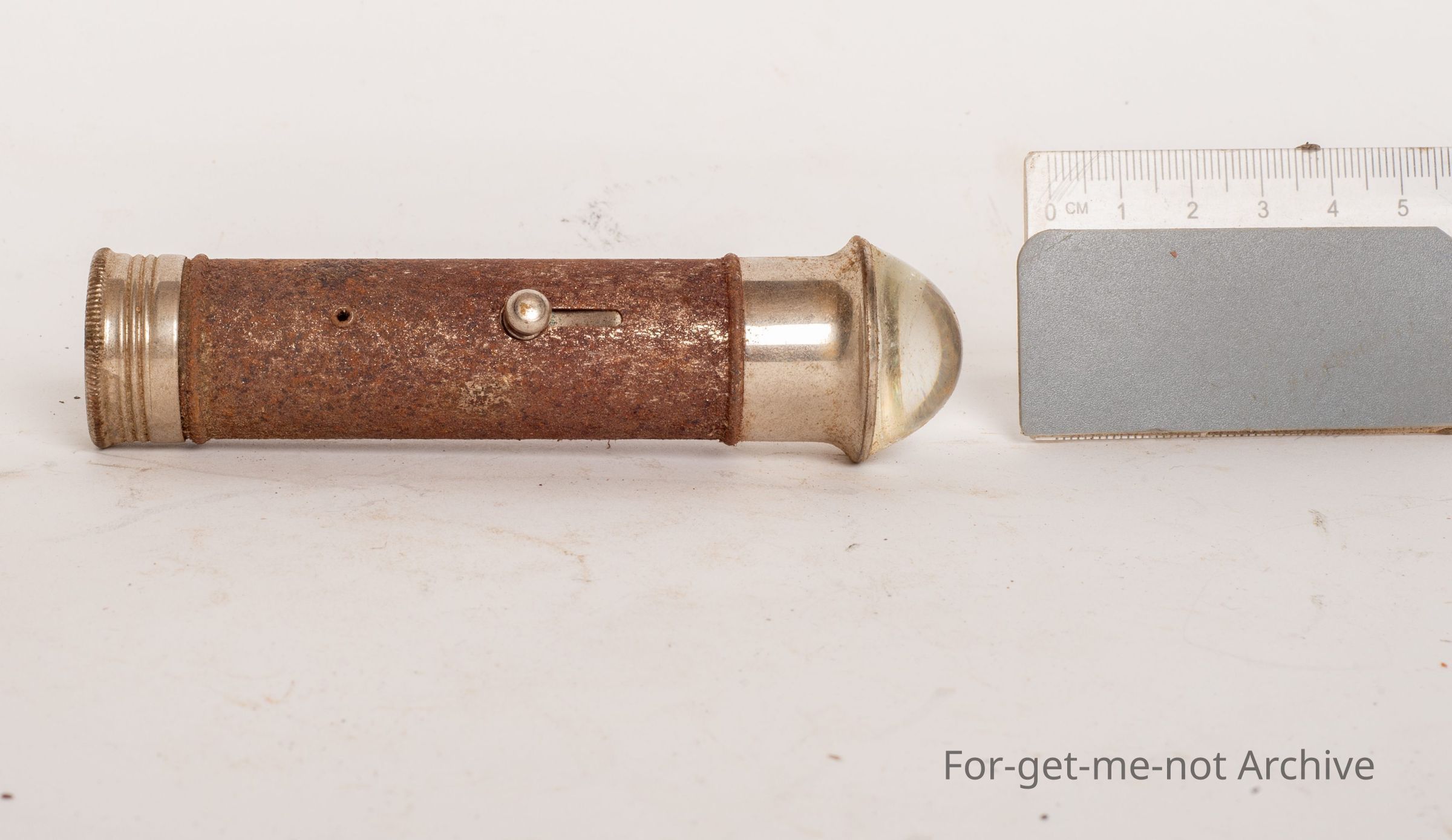 This is a little lightly made tin torch with, bull eye glass in it. Would push out a fair bit of light, with a battery made in Czechoslovakia by a company called Dimon.