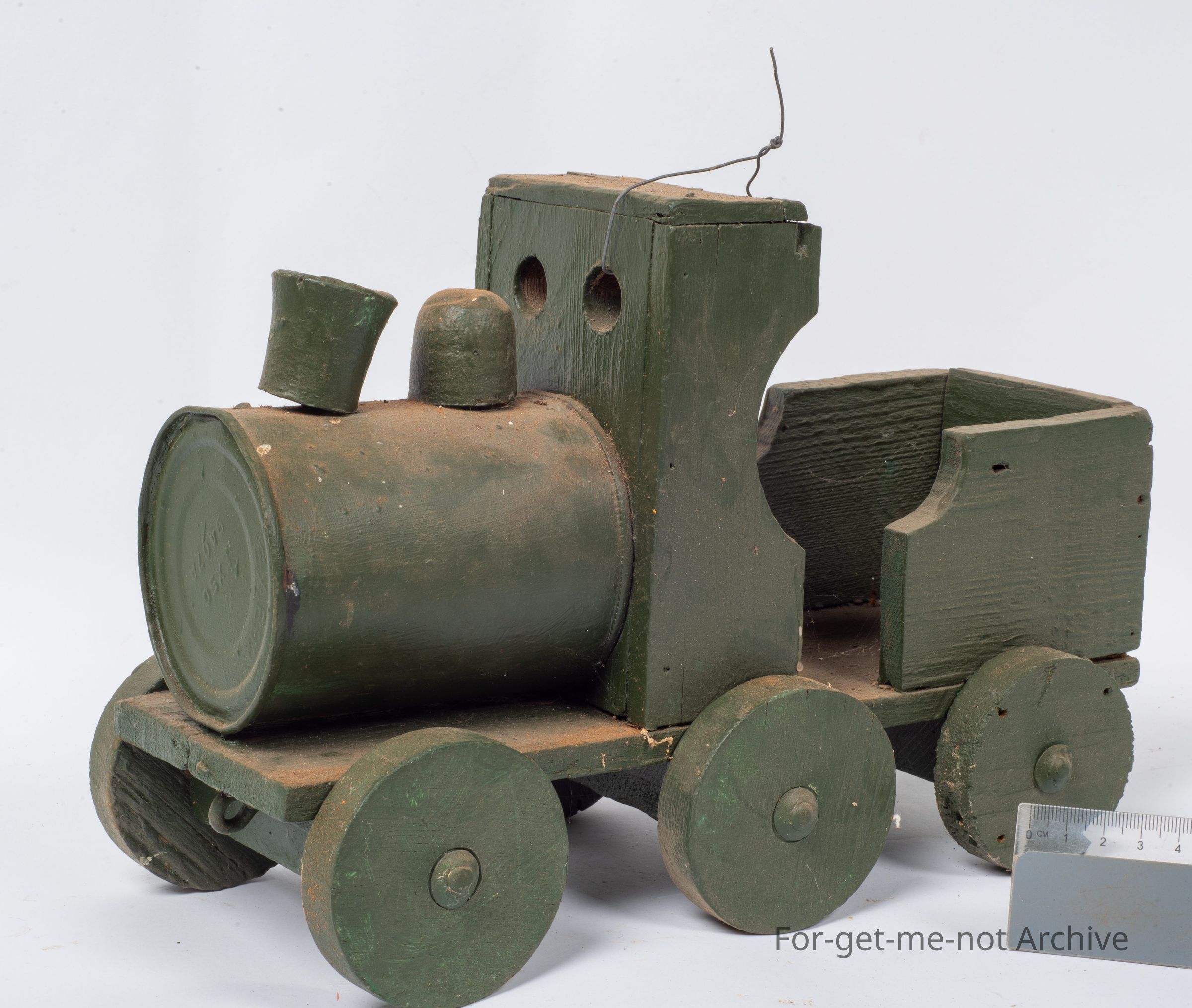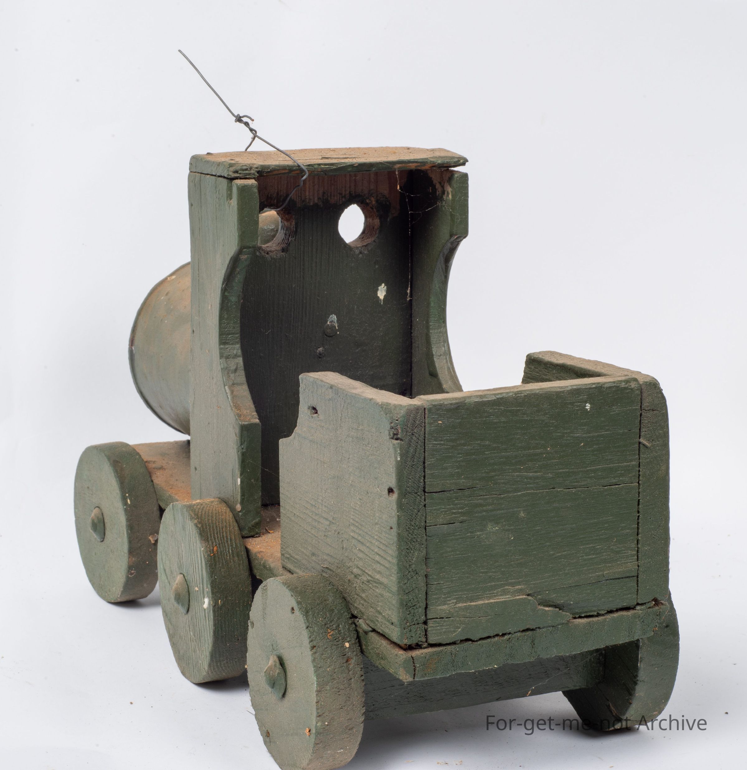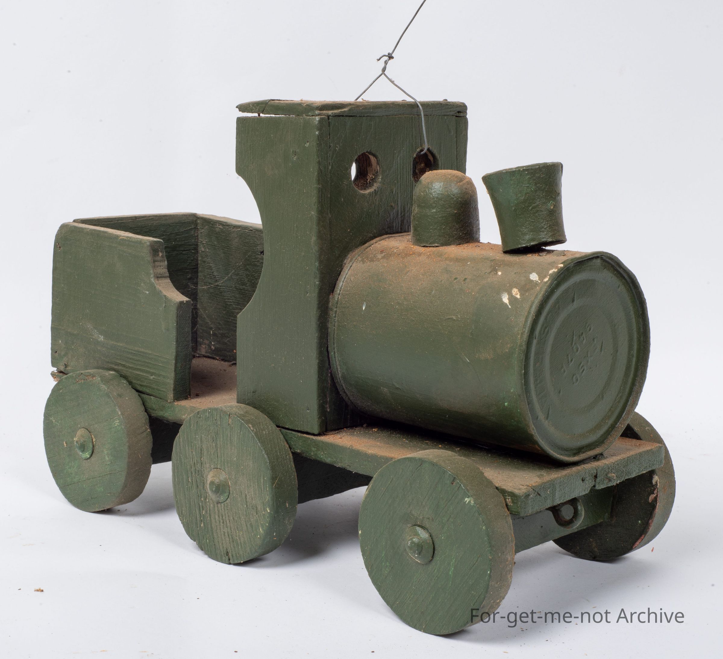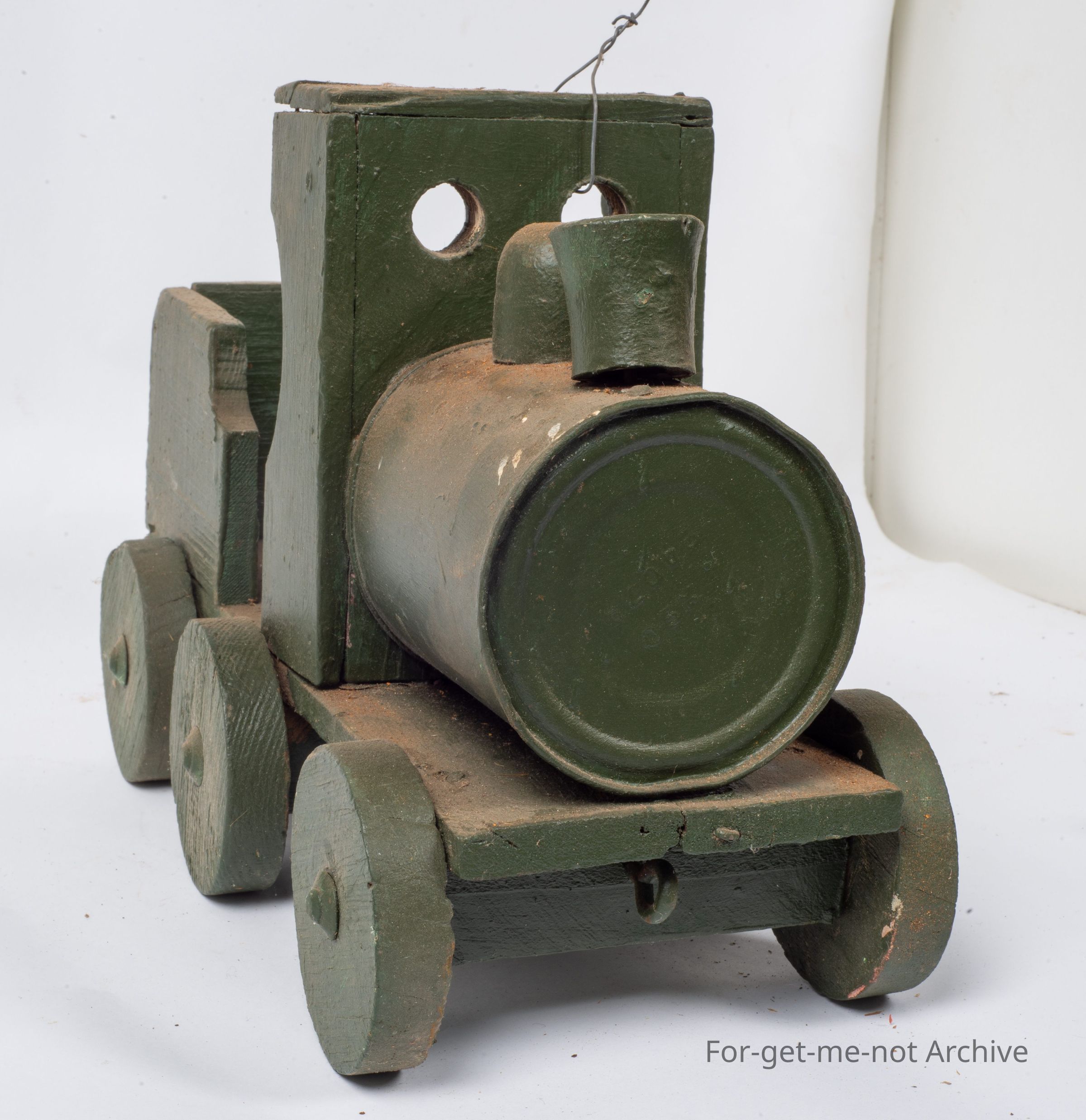 This is a Depression era toy made for a child from scrap. It has a tin can for the front body of the train, the rest of it is made from wood or scrap pieces and, some child would like this for a present at some stage. It has an attachment on the front to put a piece of string to pull it along.Collection