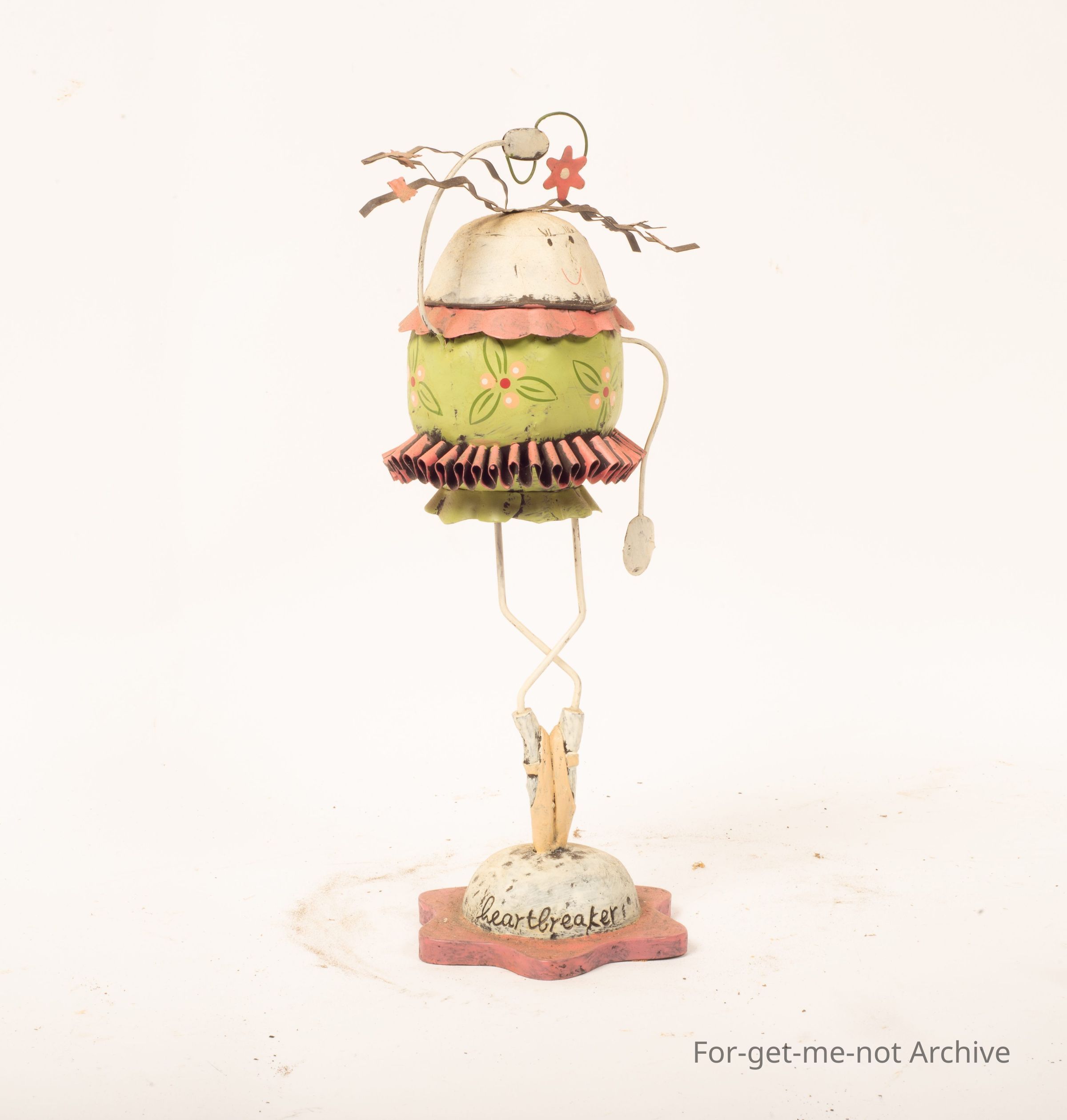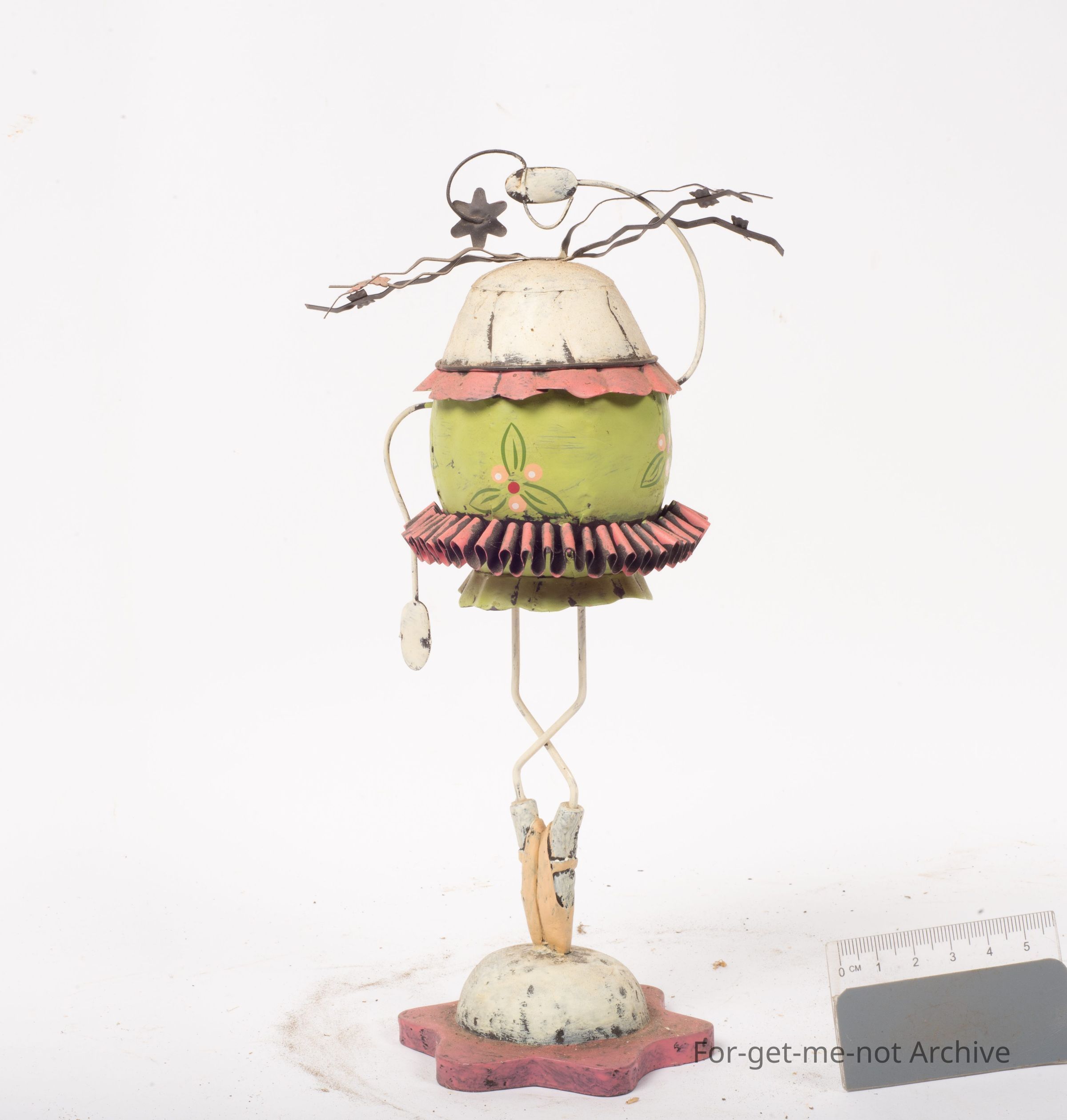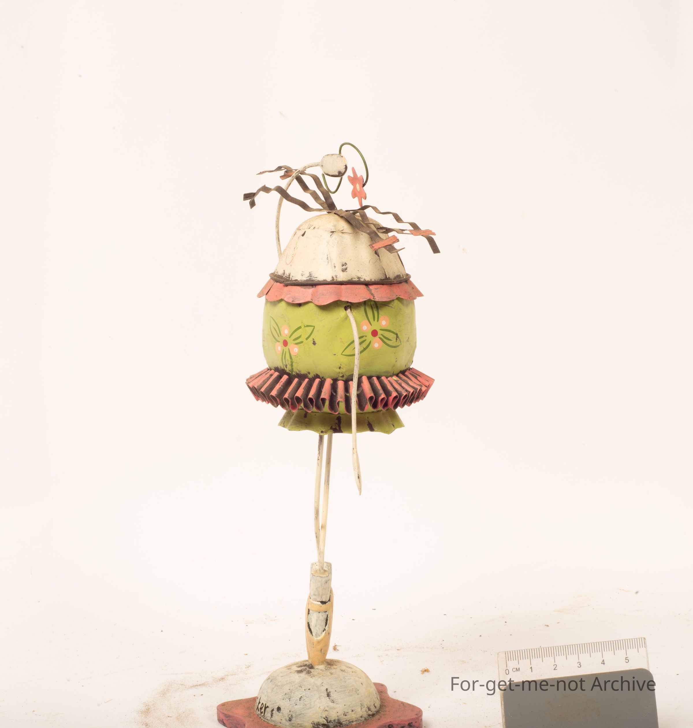 Is a child's toy. This is an amazing little piece built on a spring inside like an egg. When it's touched at the top, it bounces up and down on a stand. It has pieces of wire for hair. The arms are pieces of wire. This would have been a delightful little toy from someone. This was bought from Jimmy Trigger in Daylesford.Collection