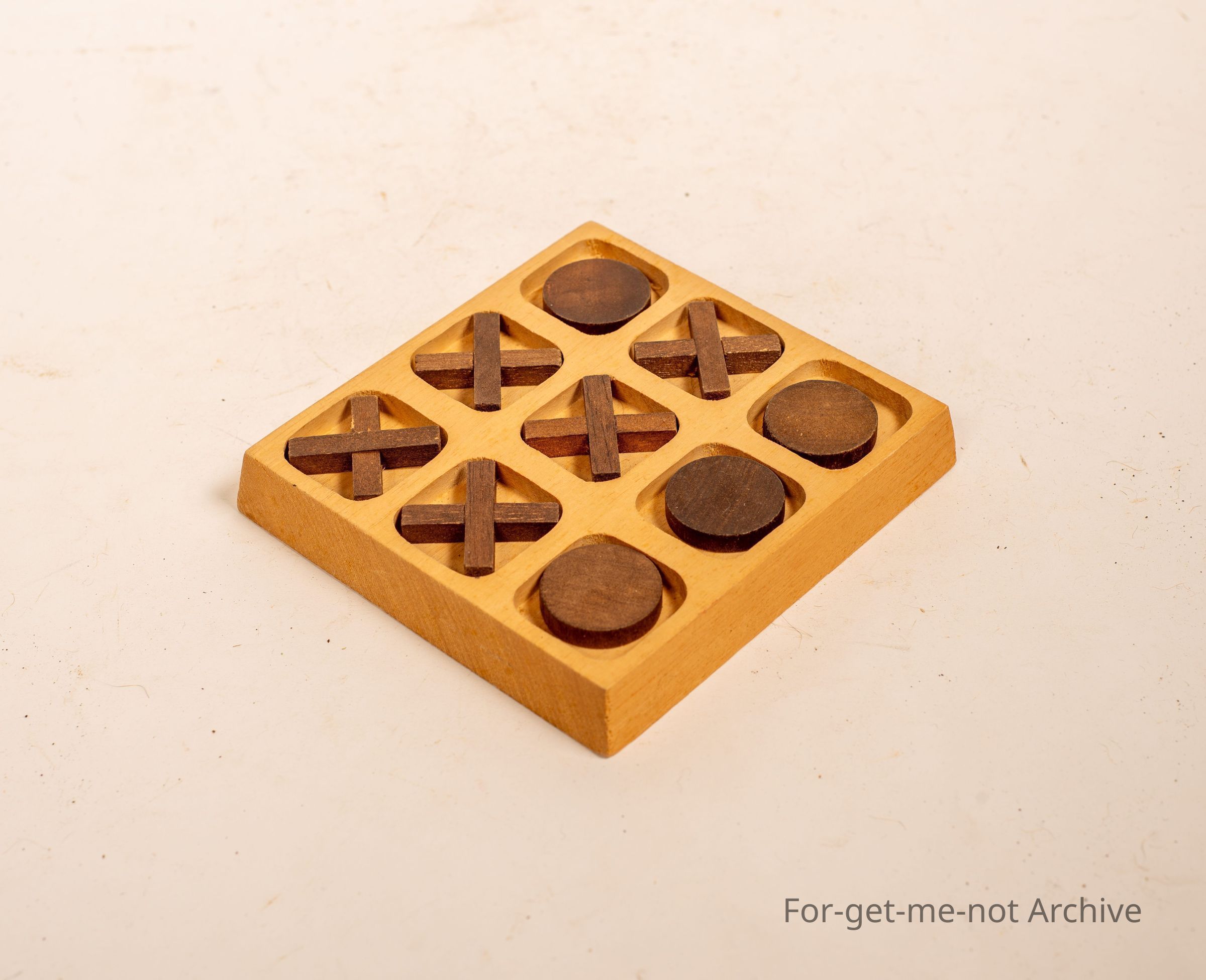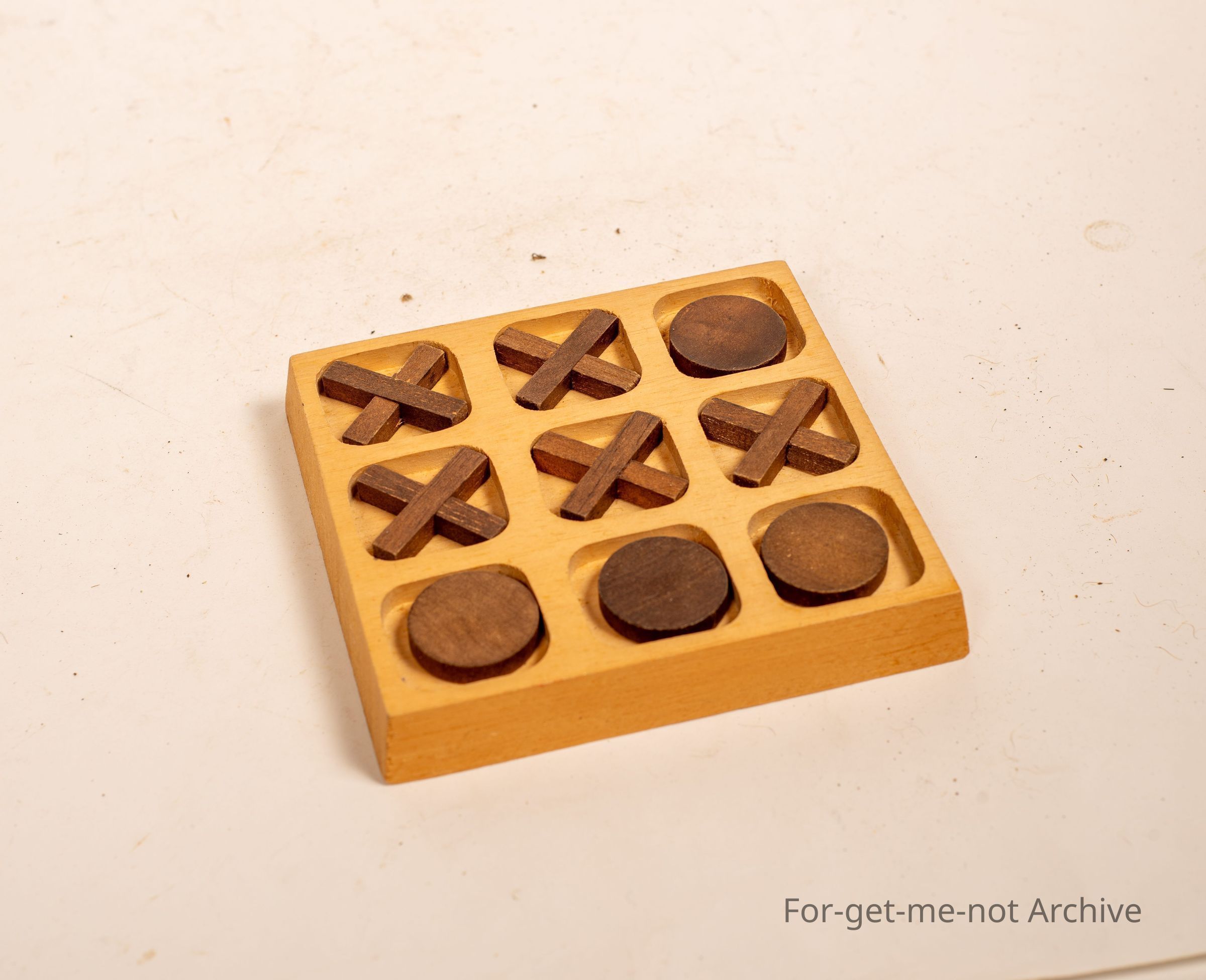 A wooden board, with 5 crosses and 4 circular pieces inserted for training kids how to count and to coordinate into different patterns. Could play Noughts and Crosses