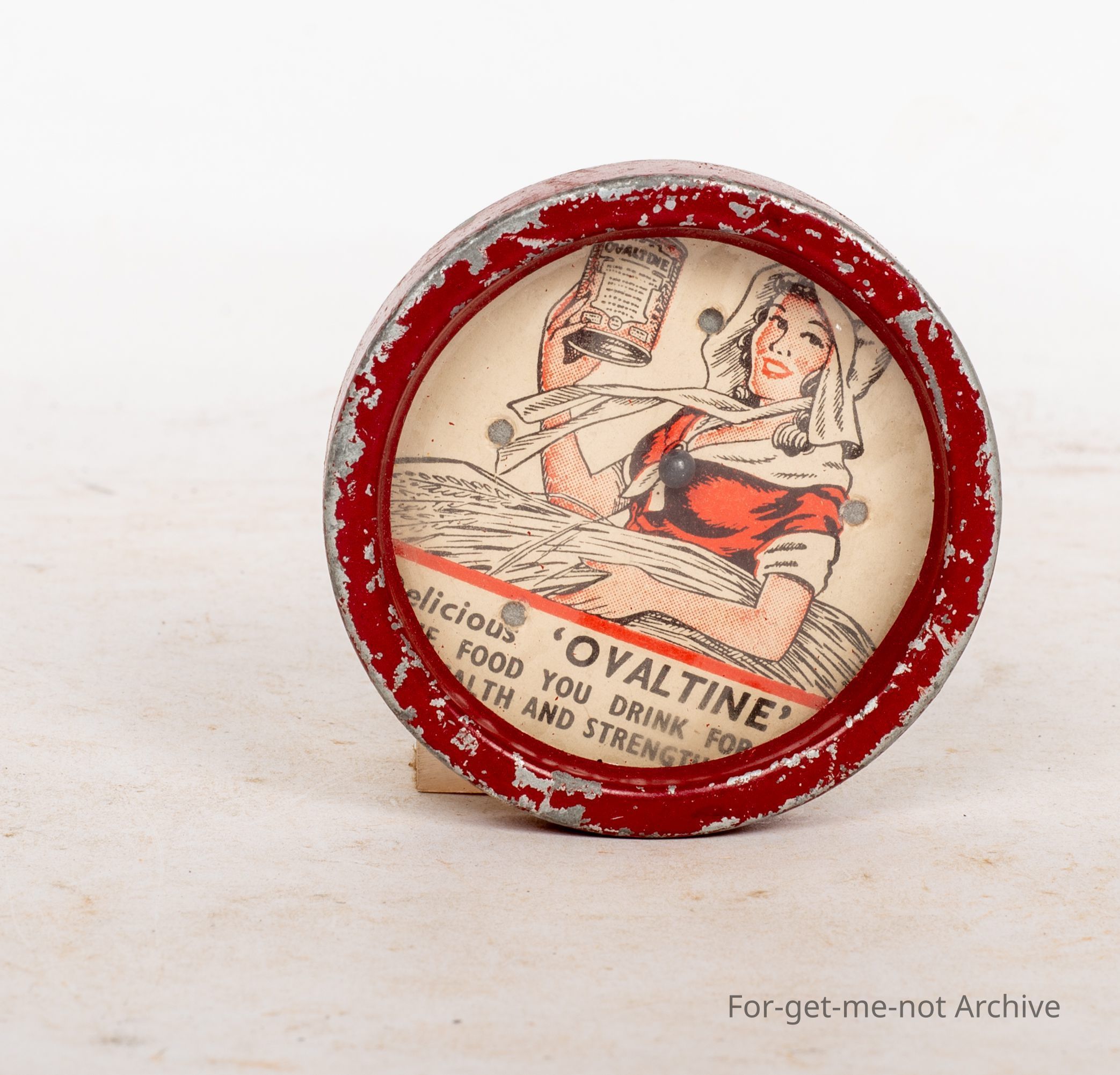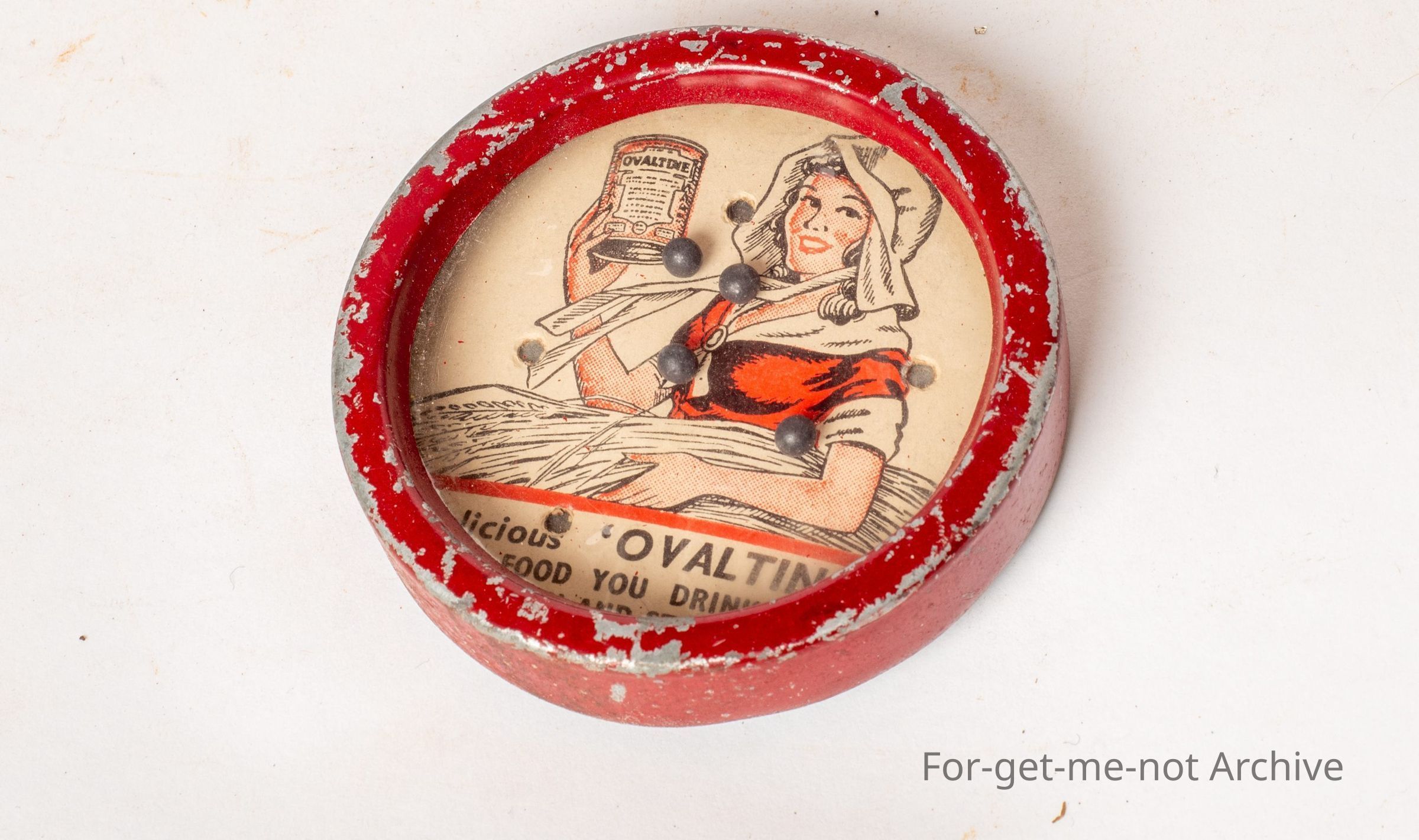 This is a small game with metal balls. You roll them around to get them to sit in a position. This one is advertising Ovaltine,
