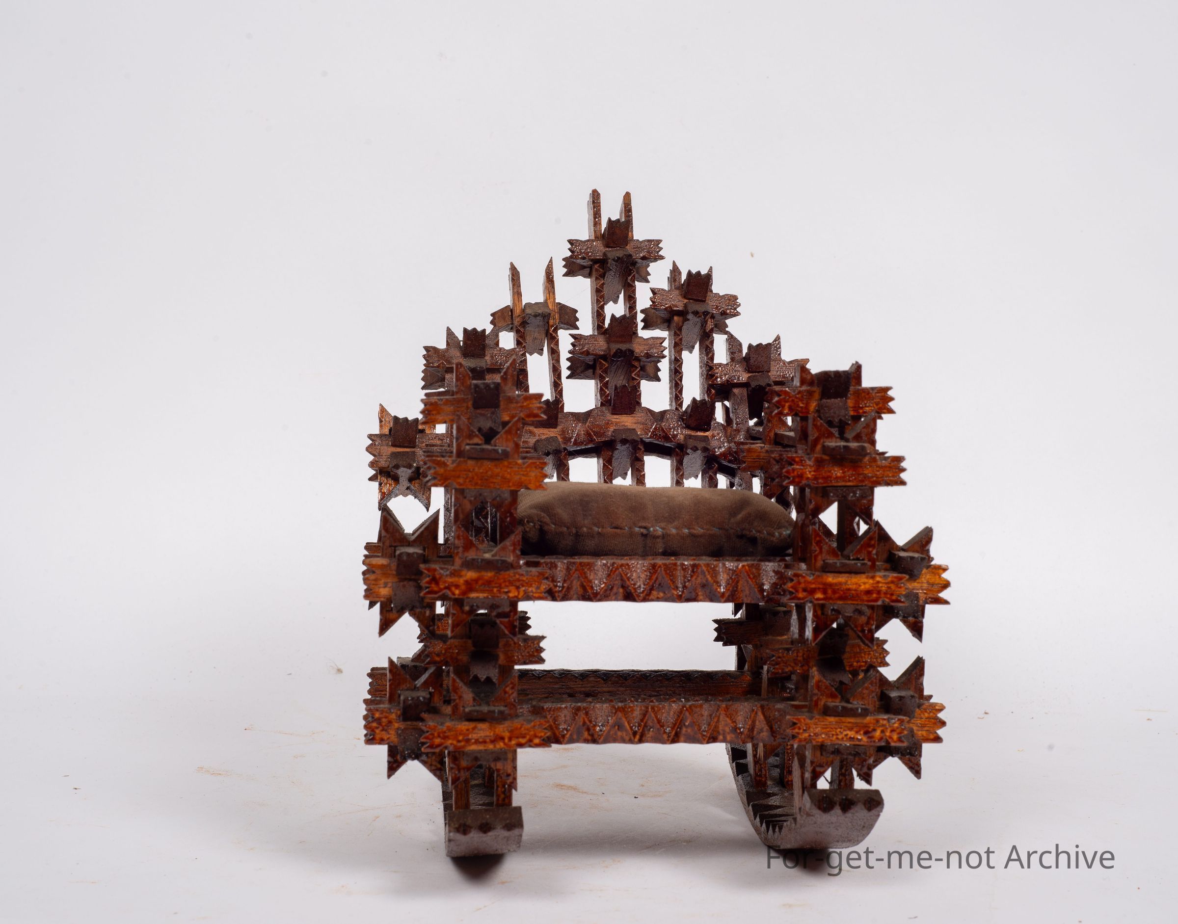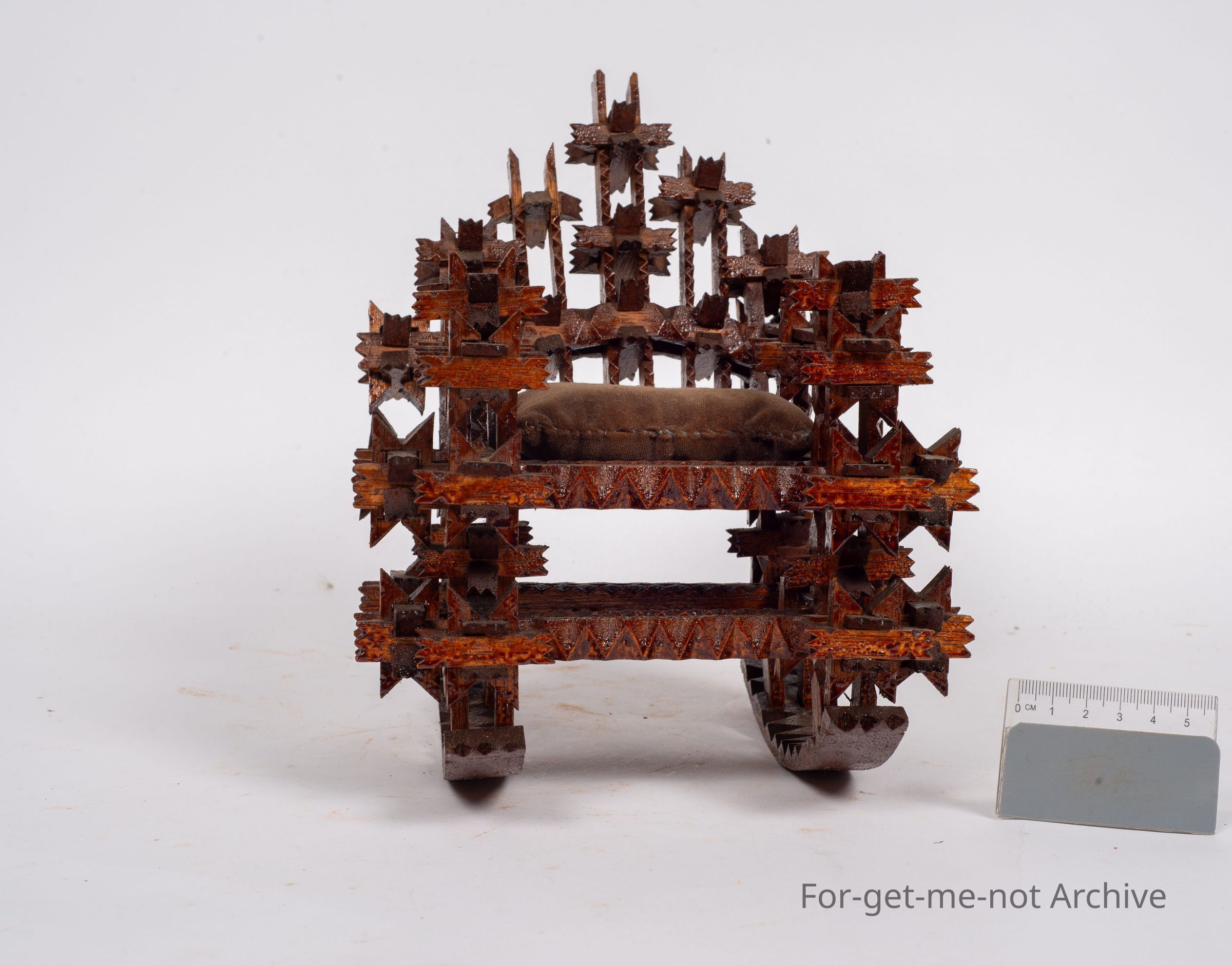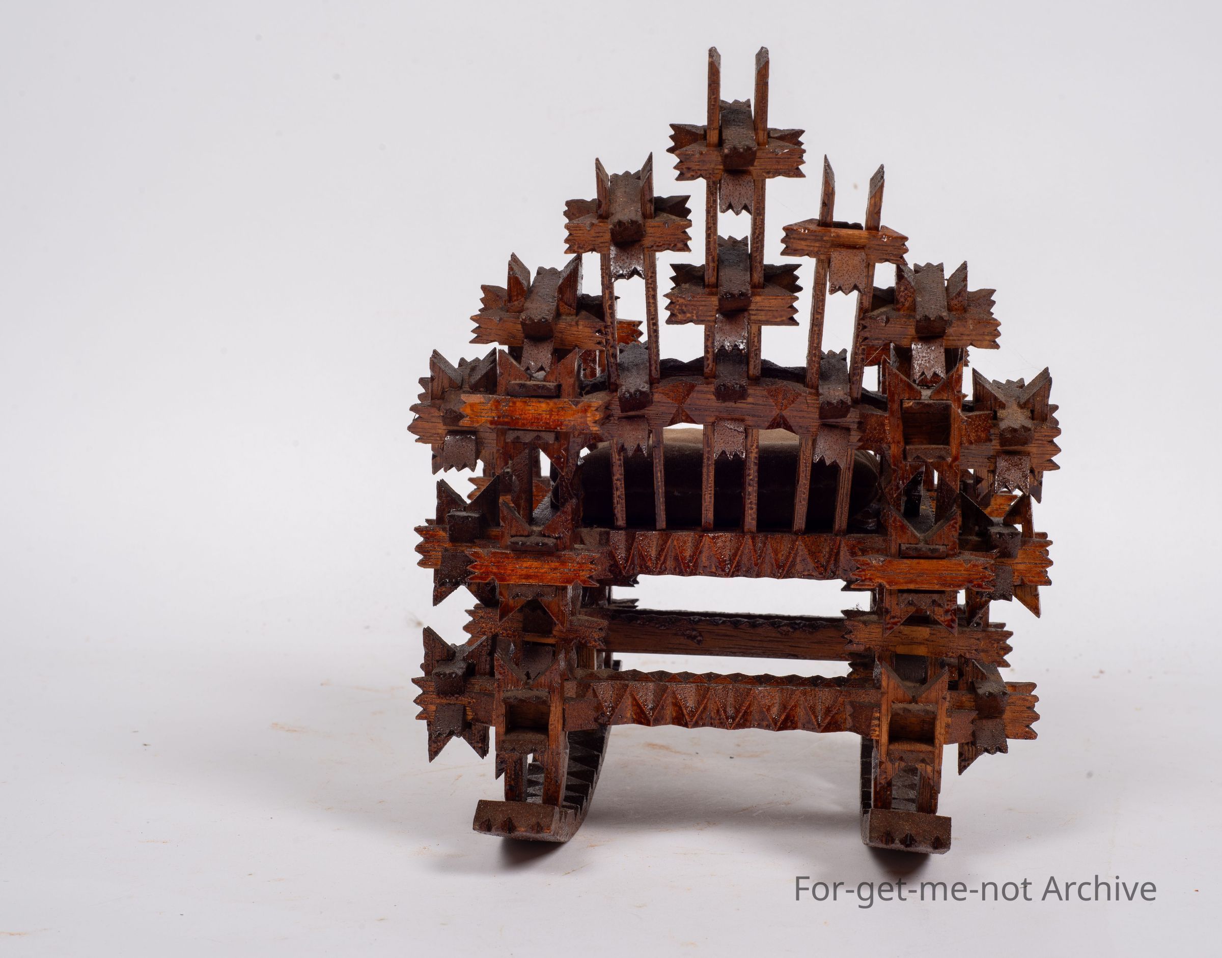 Is another tramp art piece, this time in the shape of a walking chair. This has interlockers on it, very intricate, Carved interlockers. Glorious thing. Unusual to see tramp art done in this type of work.Collection