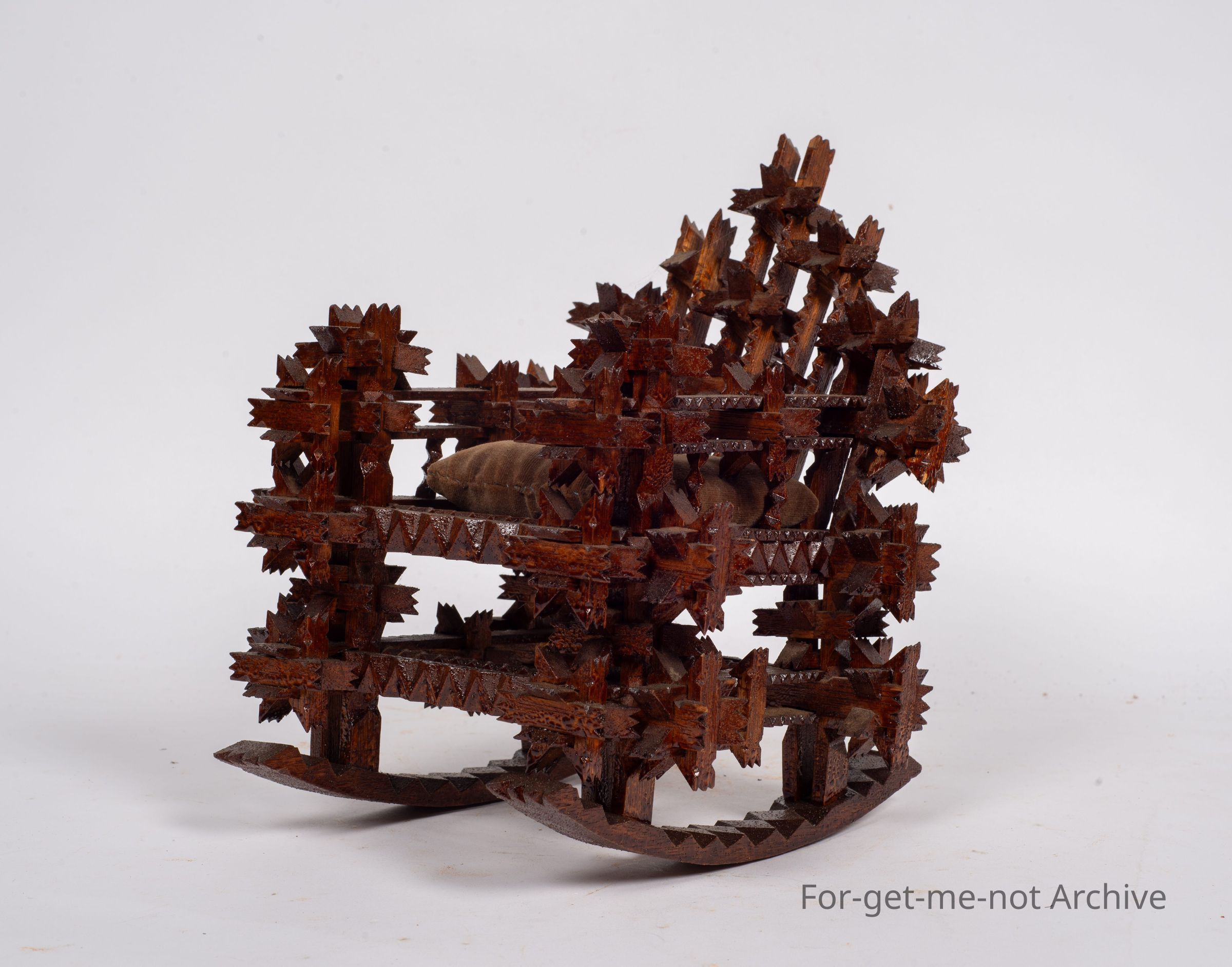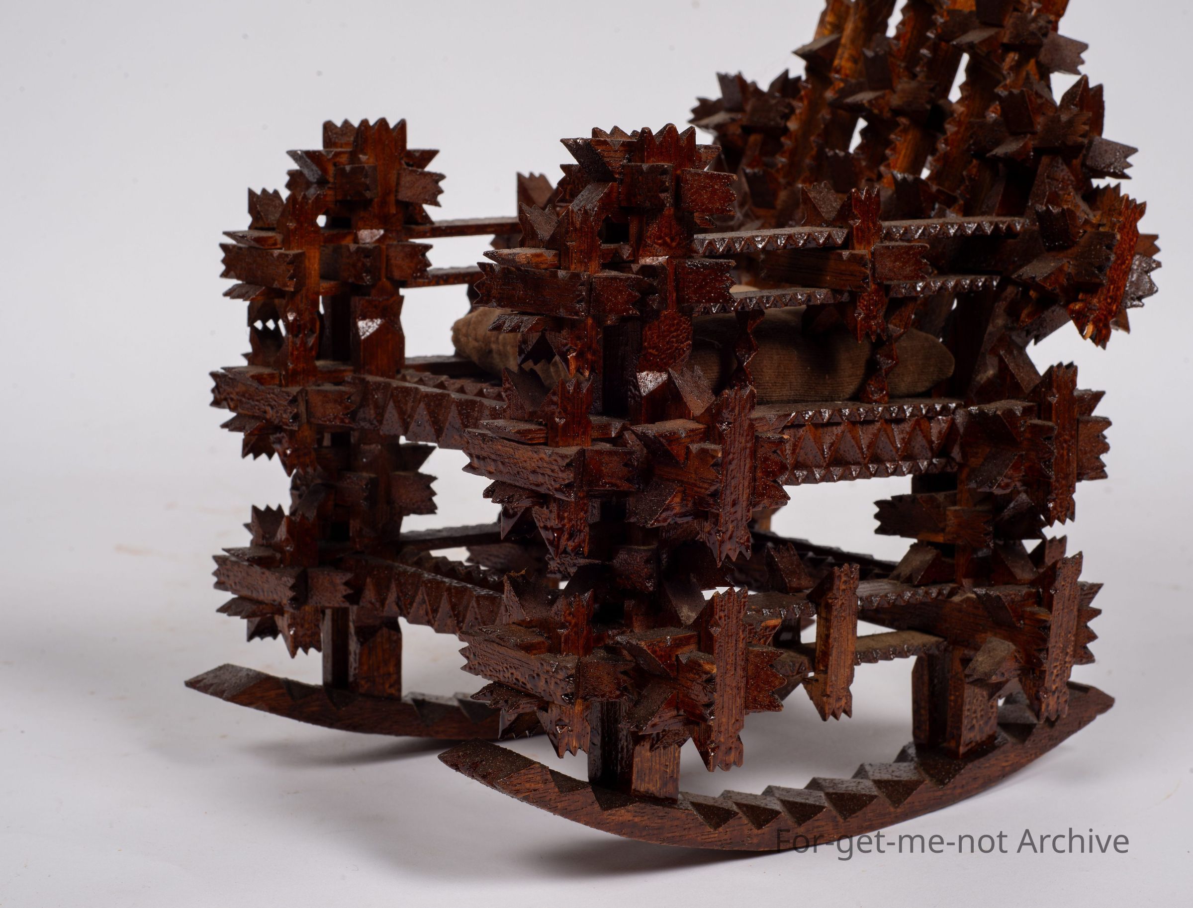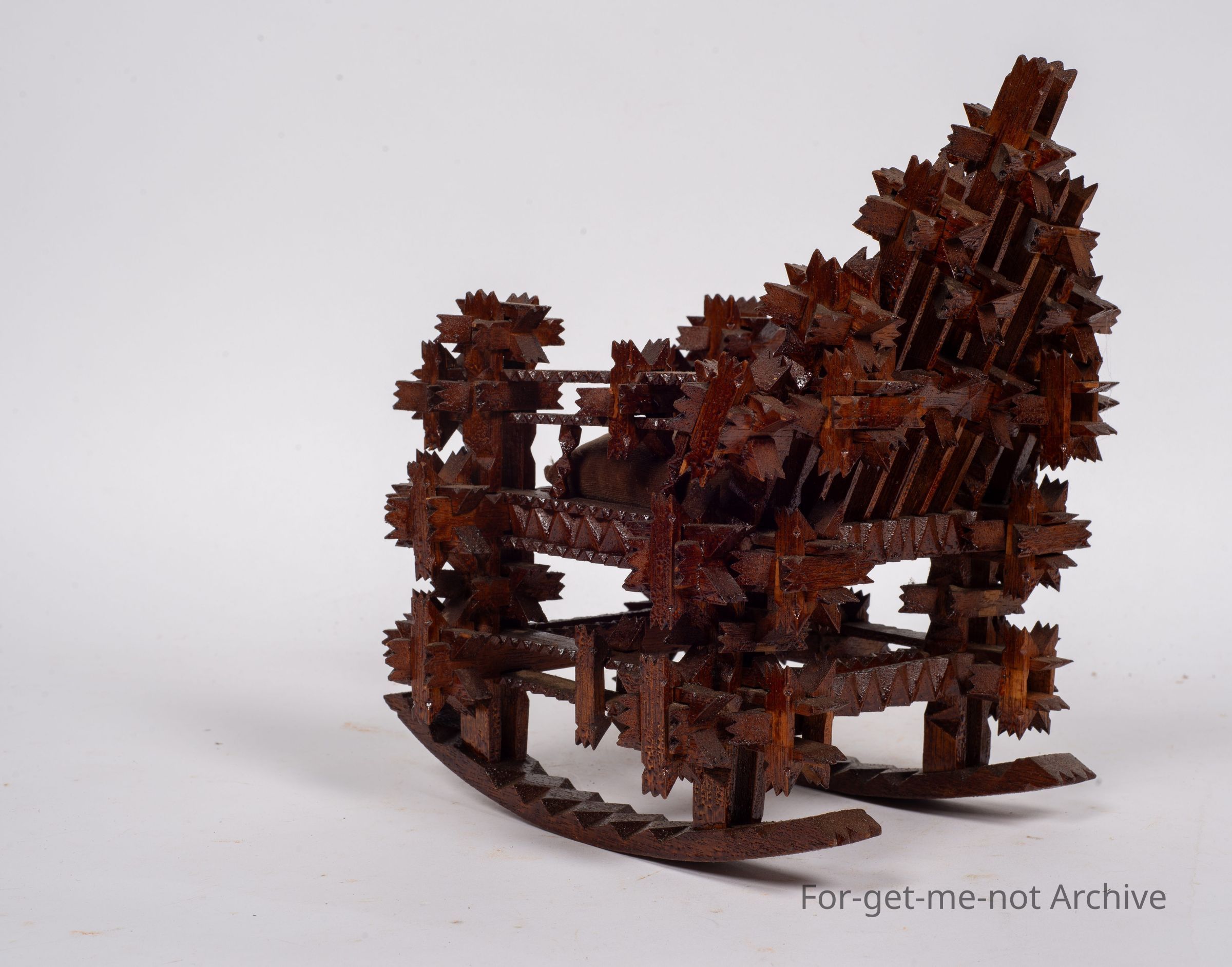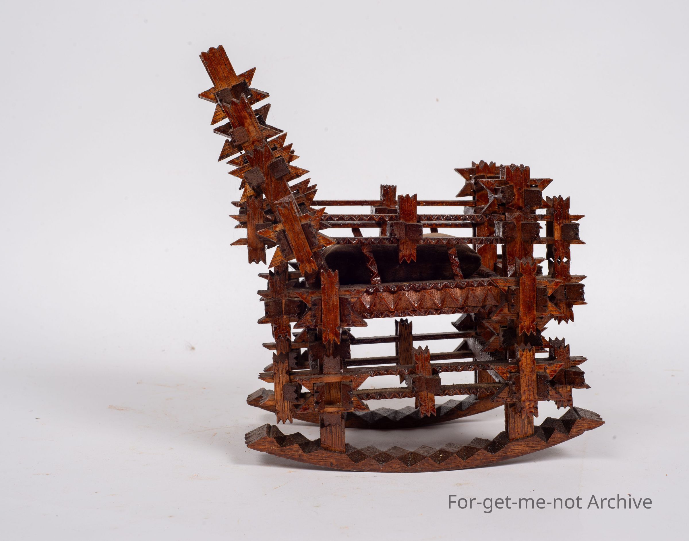 Is another tramp art piece, this time in the shape of a walking chair. This has interlockers on it, very intricate, Carved interlockers. Glorious thing. Unusual to see tramp art done in this type of work.Collection