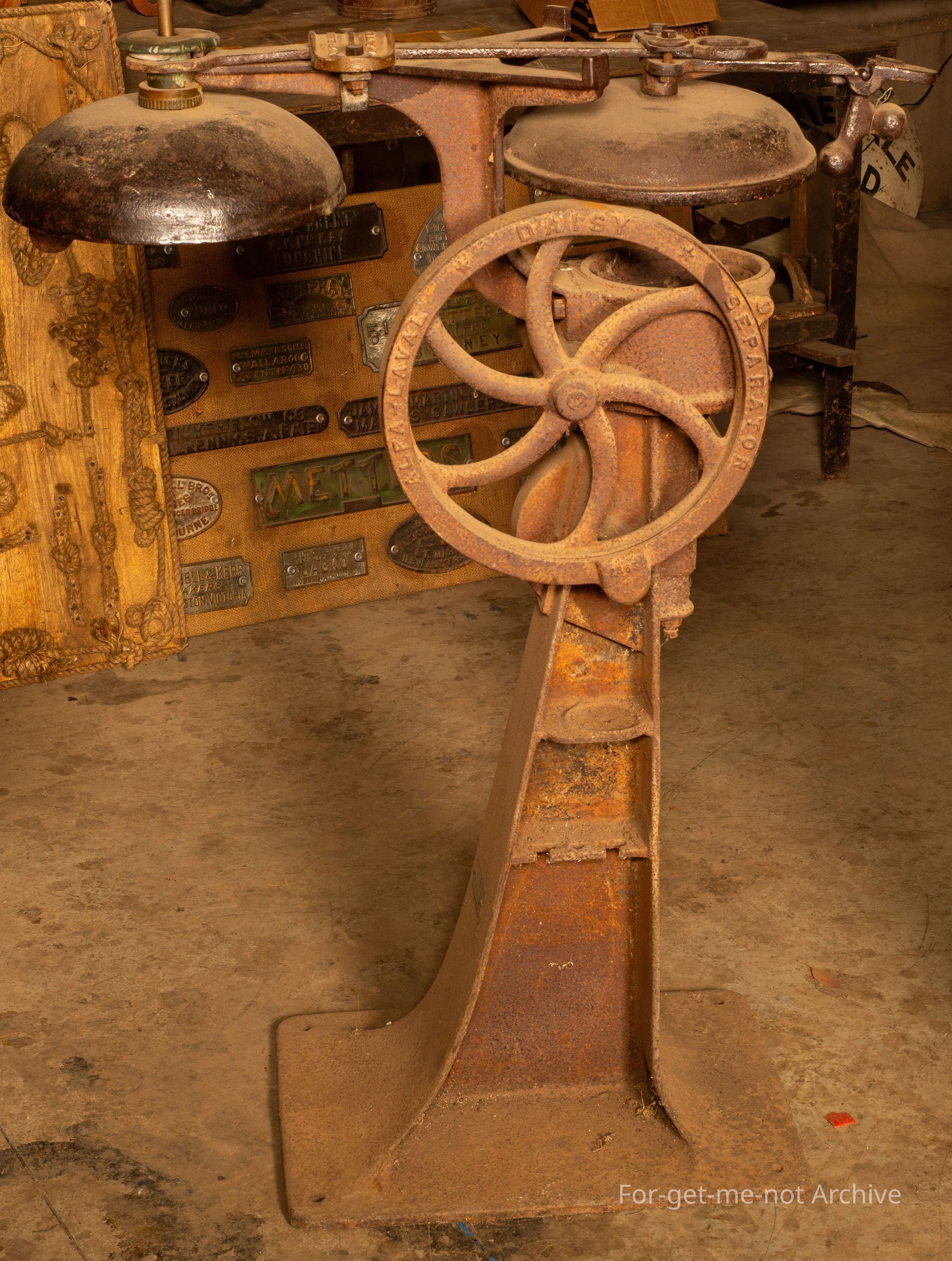 These are 2 early Ballarat tram tramway bells mounted on a cast iron frame of a daisy separator from America. Both the bells are ring able. They look quite good on the stand.
