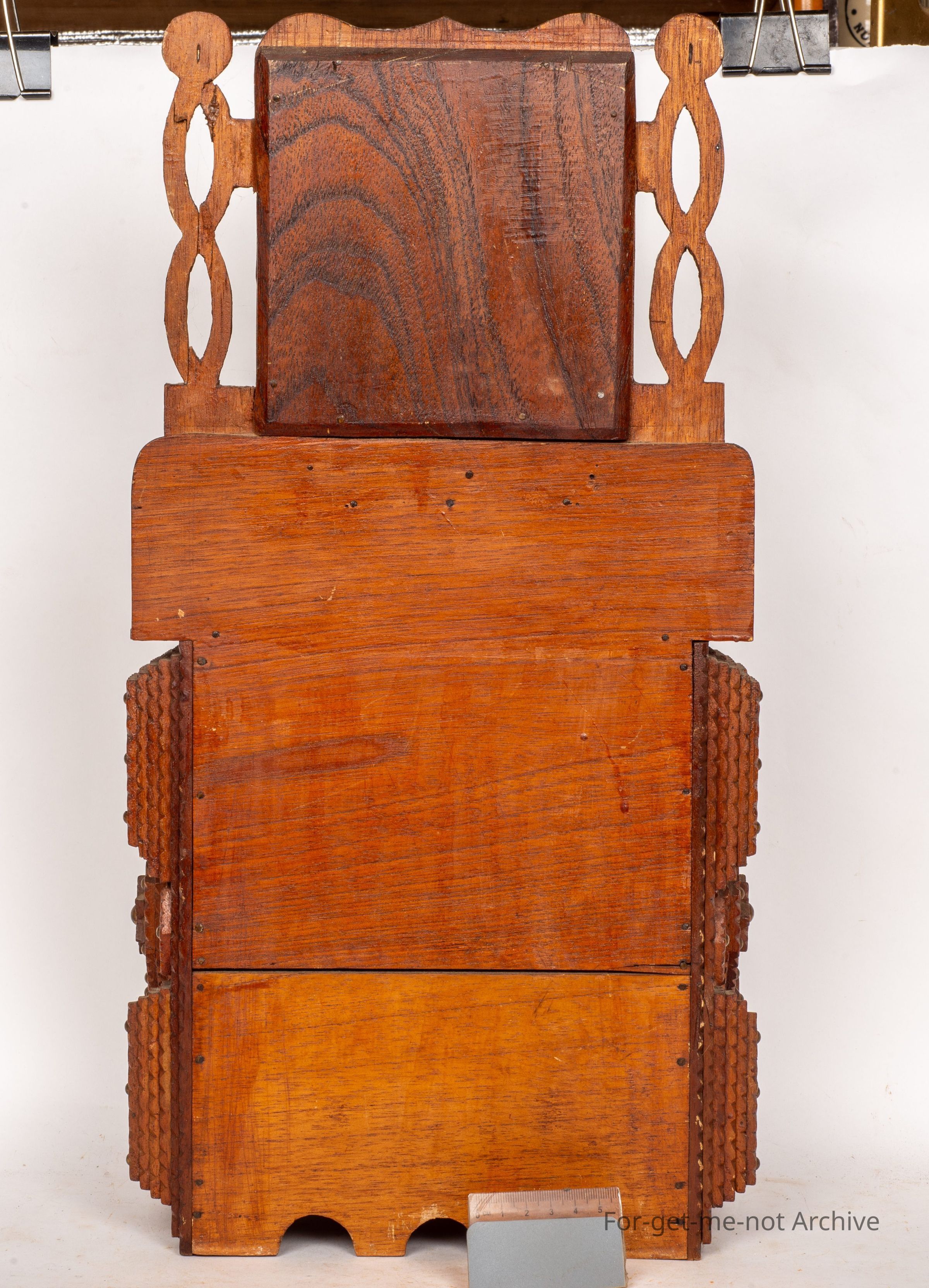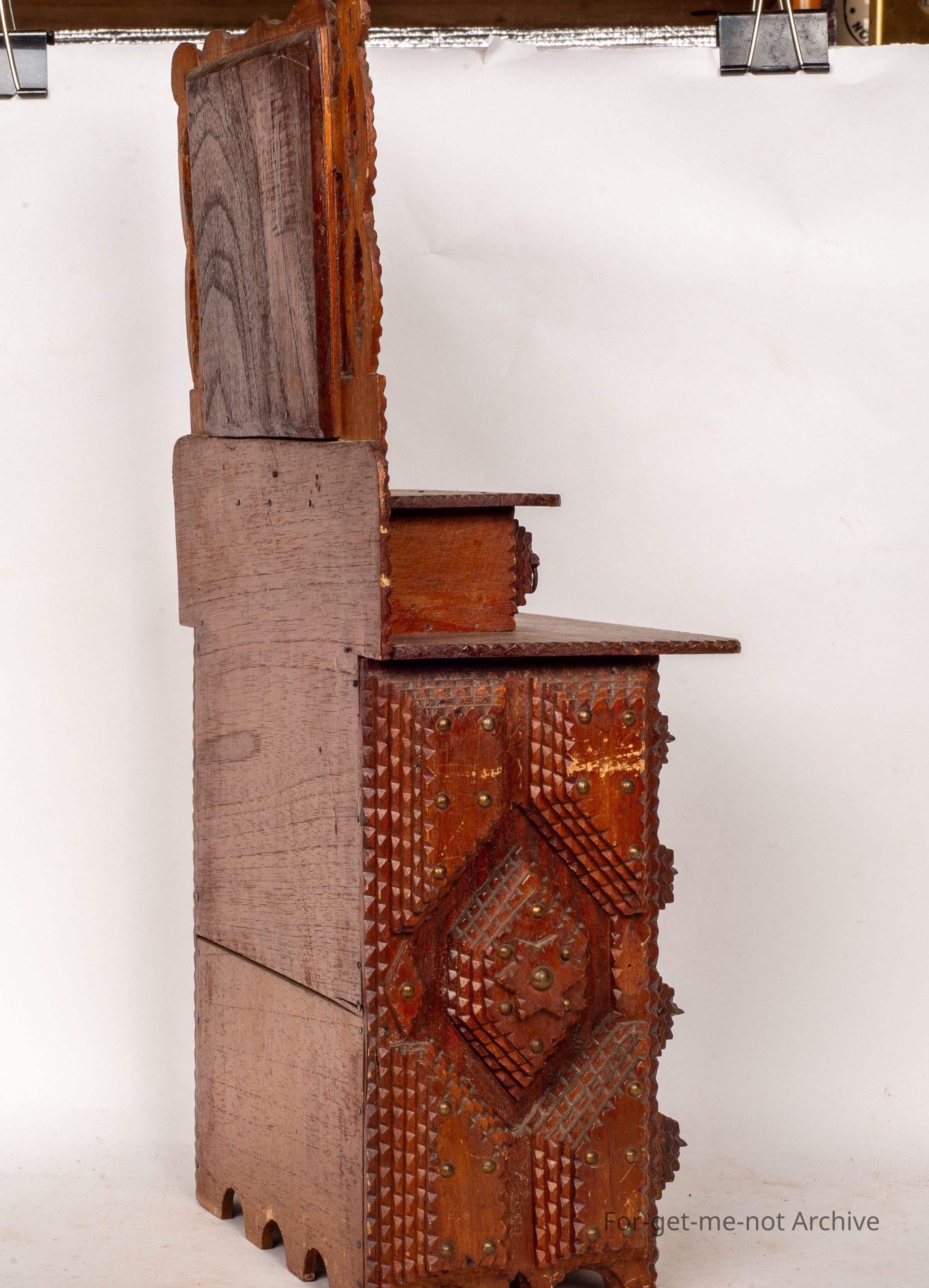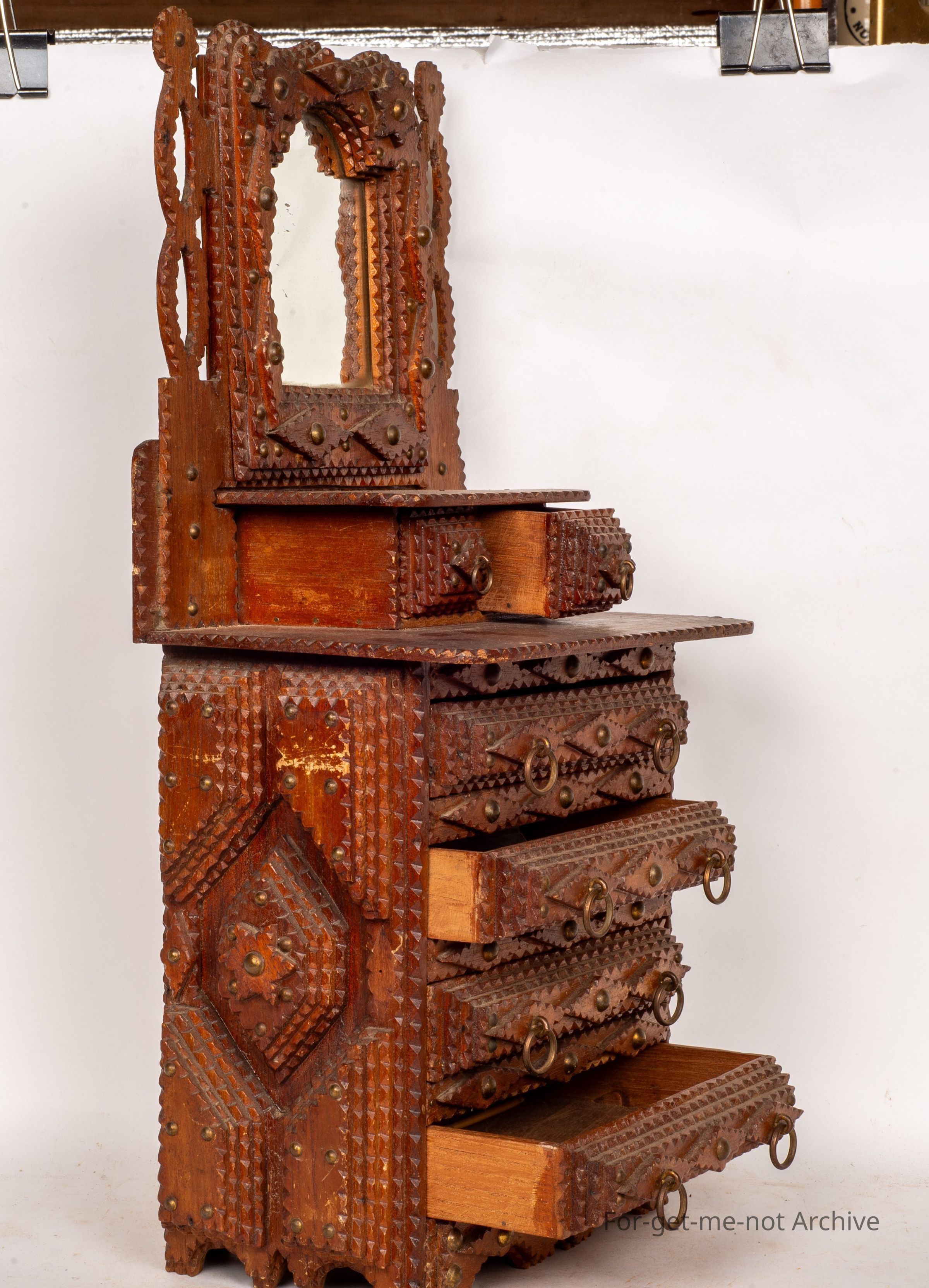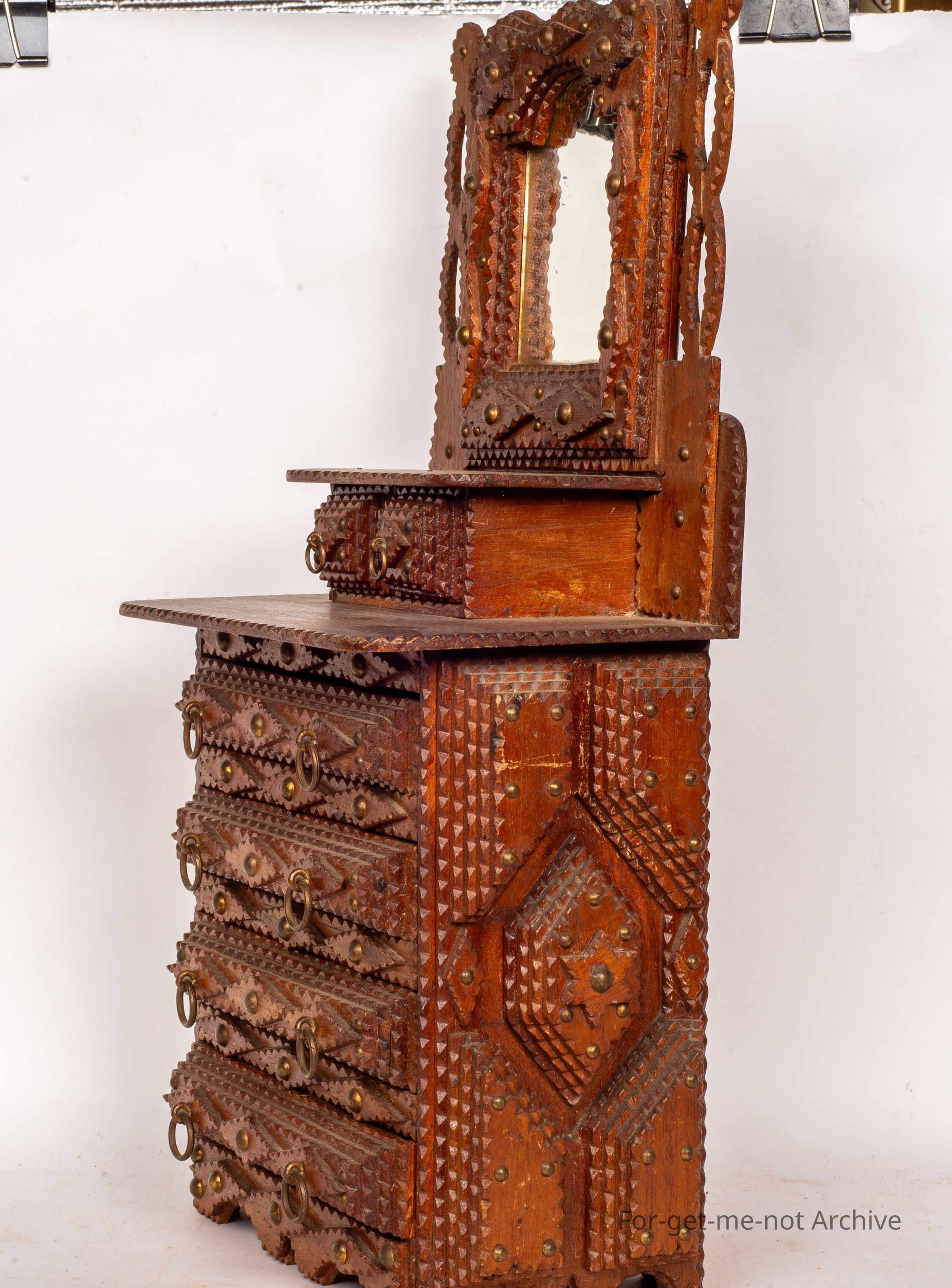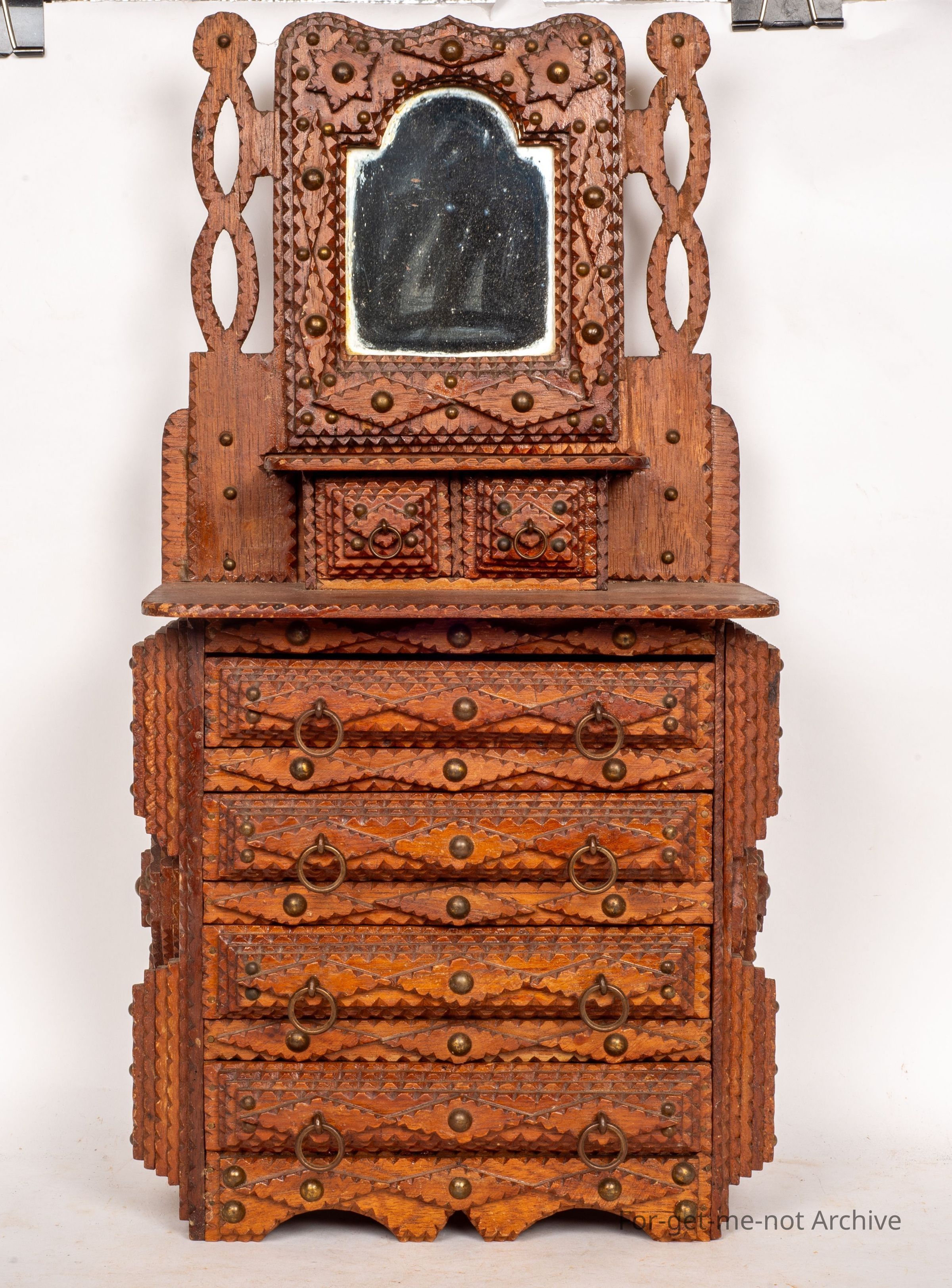 Another tramp art chest of drawers. This one, quite an elaborate one. Four major drawers in the bottom. A further 2 on the shelf at the top also includes a mirror on a raised section at the back. Very ornate. Wouldn't see many better examples than thisCollection